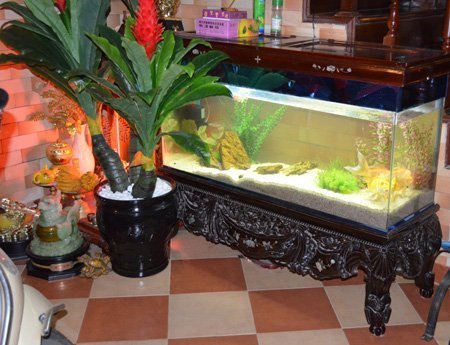 Bể cá cảnh được đặt tại tầng 1, dưới chân cầu thang