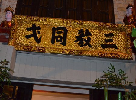 Trước cửa nhà, NSND Lan Hương treo bảng chữ Tam giáo đồng nhất.