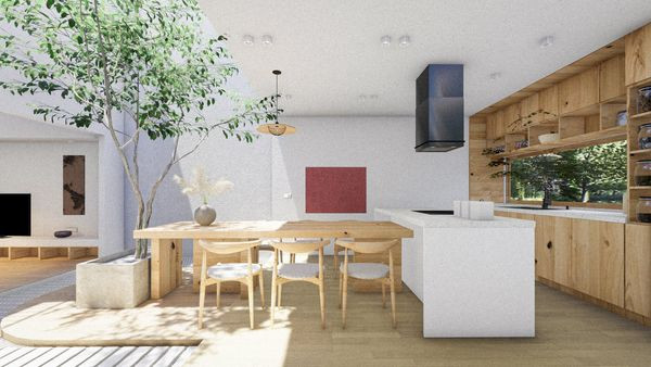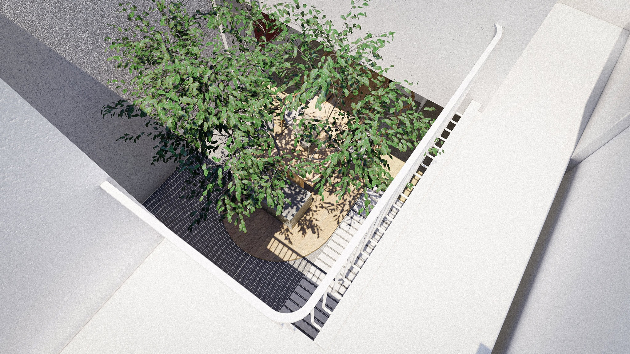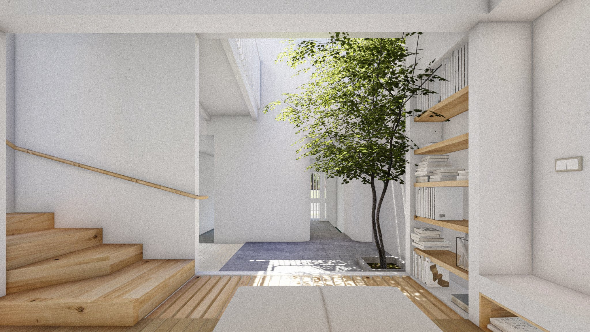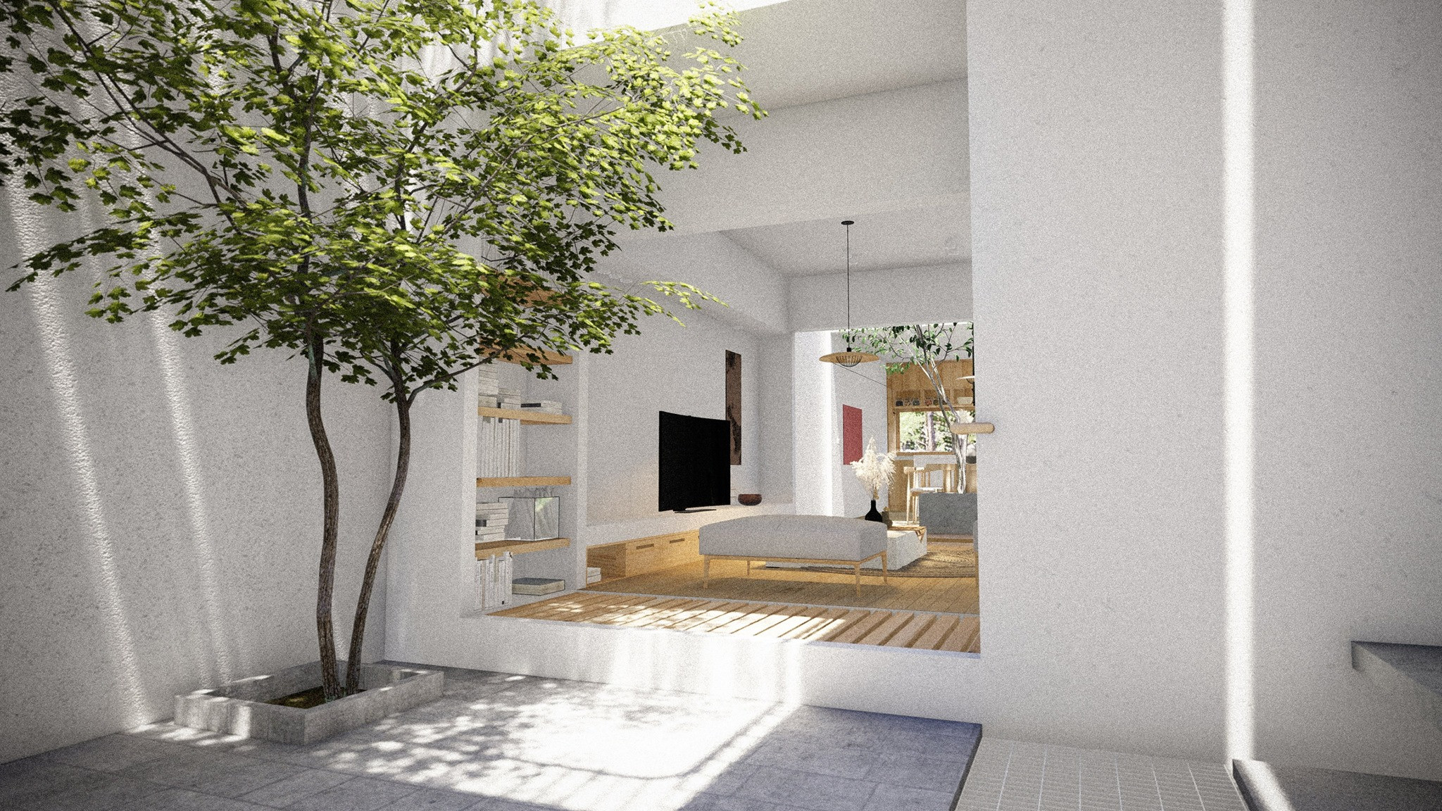 Vườn cây đặt xen kẽ giữa các không gian, lệch nhau theo phương đứng, kết hợp việc thiết kế các gian phòng với hai mặt là cửa kính trượt. Ý tưởng này vừa giúp cải thiện khí hậu, vừa tạo cảm giác rộng rãi, và còn giúp tăng sự tương tác giữa các thành viên trong gia đình.