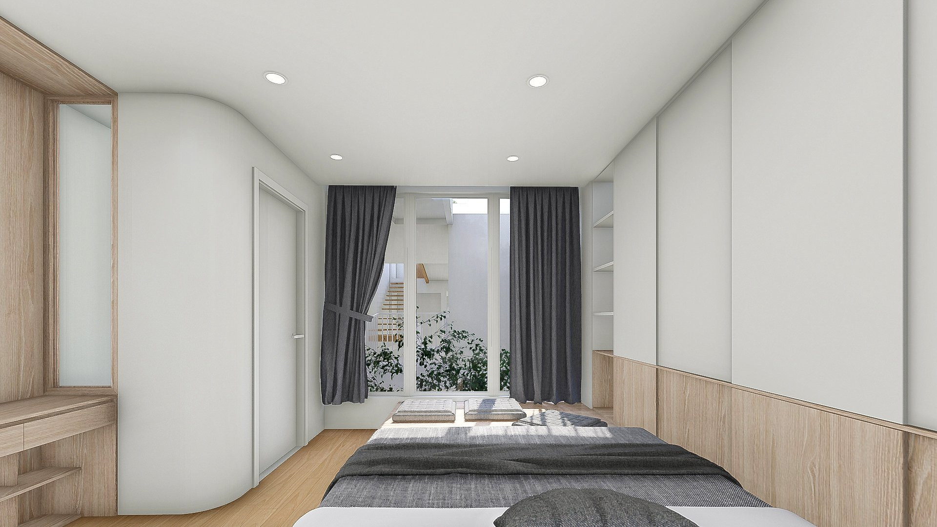 Các không gian phục vụ như bếp, phòng tắm, hành lang, cầu thang được đặt ở hướng Tây nhằm hạn chế các bức xạ nhiệt.
