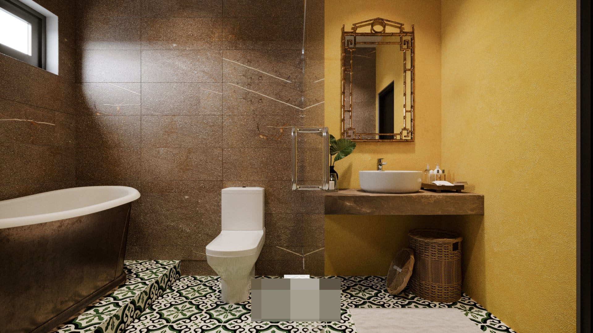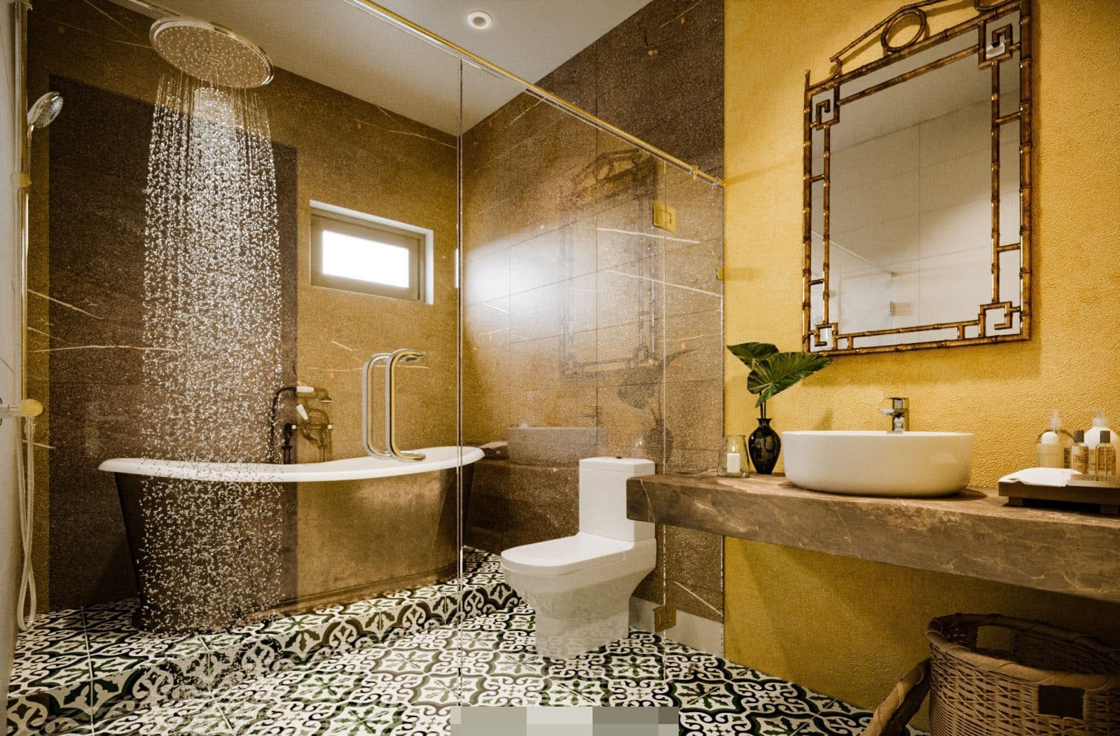 Phòng tắm chuẩn "triệu đô" với bồn tắm ngâm bằng đồng, vòi sen tắm đứng. Mảng tường sơn vàng và sàn gạch bông đưa gia chủ về với ký ức xưa - những chi tiết của kiến trúc Đông Dương đầu thế kỷ 20.