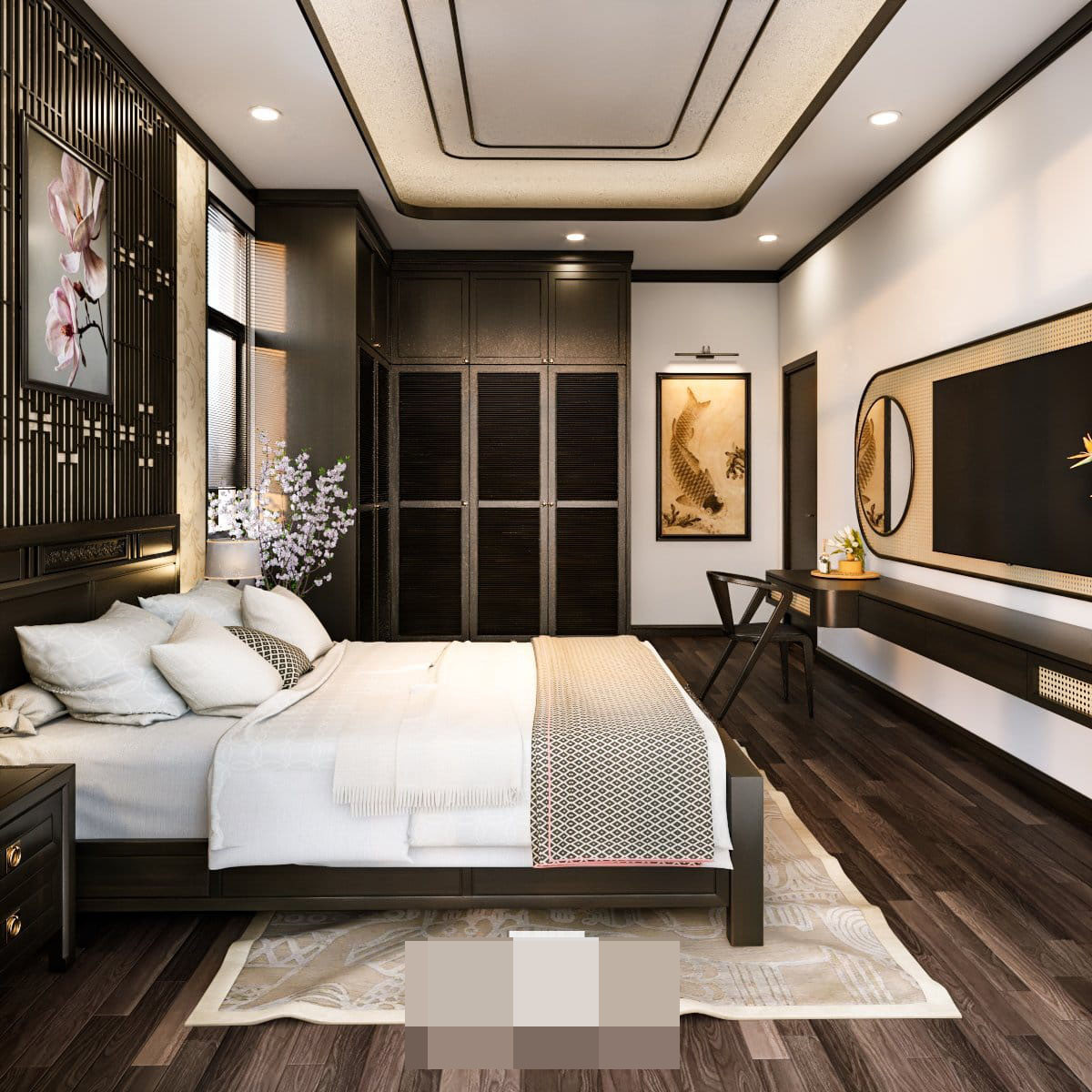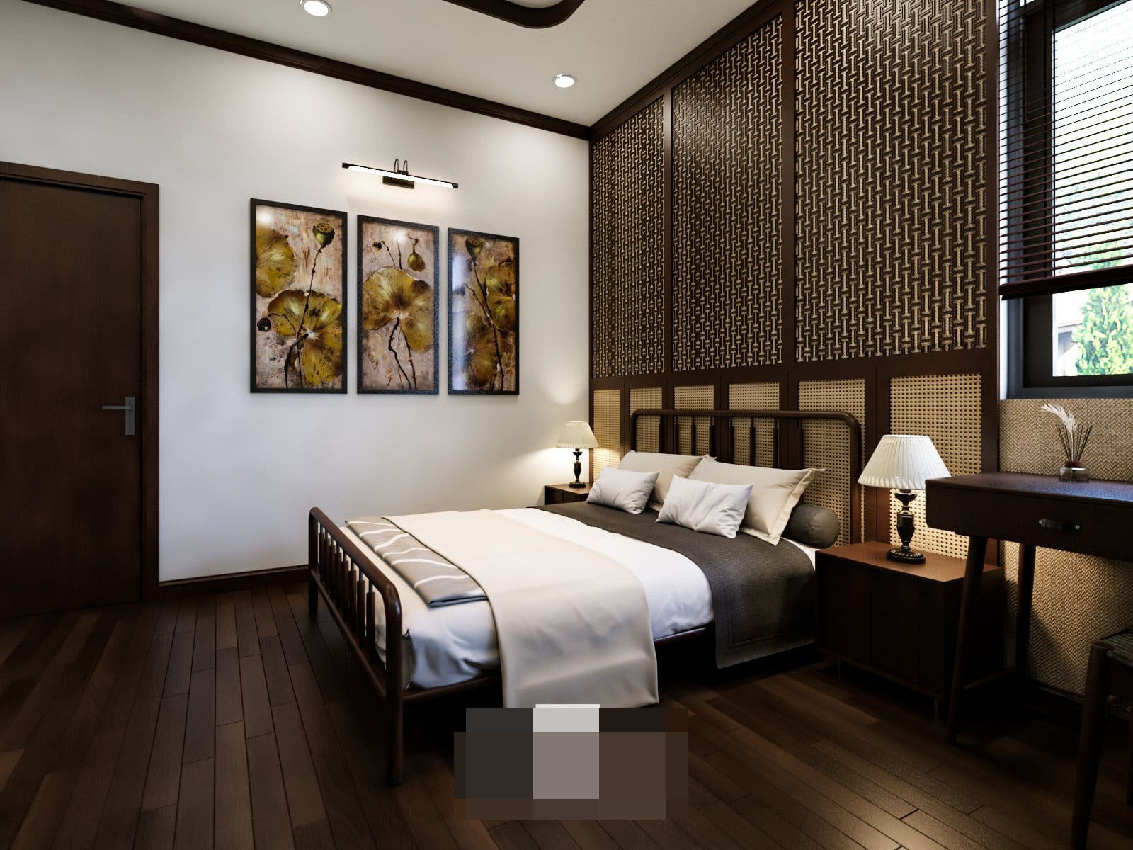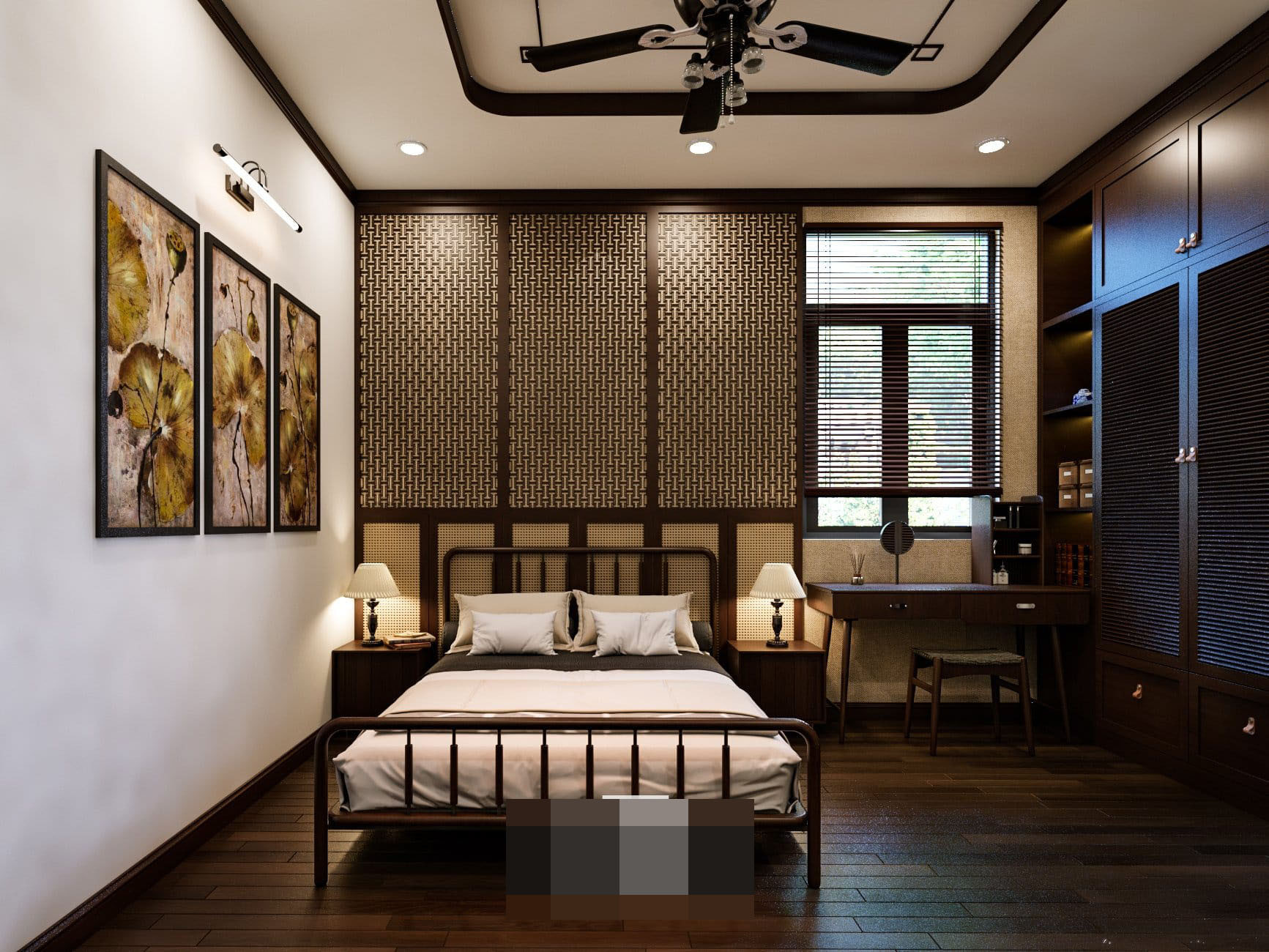 Phòng ngủ sang trọng, đường nét tỉ mỉ. Mảng lam gỗ cắt CNC nghệ thuật, tạo nét đẹp cổ điển. Tủ gỗ thịt hình chữ L tăng diện tích chứa đồ, đảm bảo tính thẩm mỹ cho không gian.