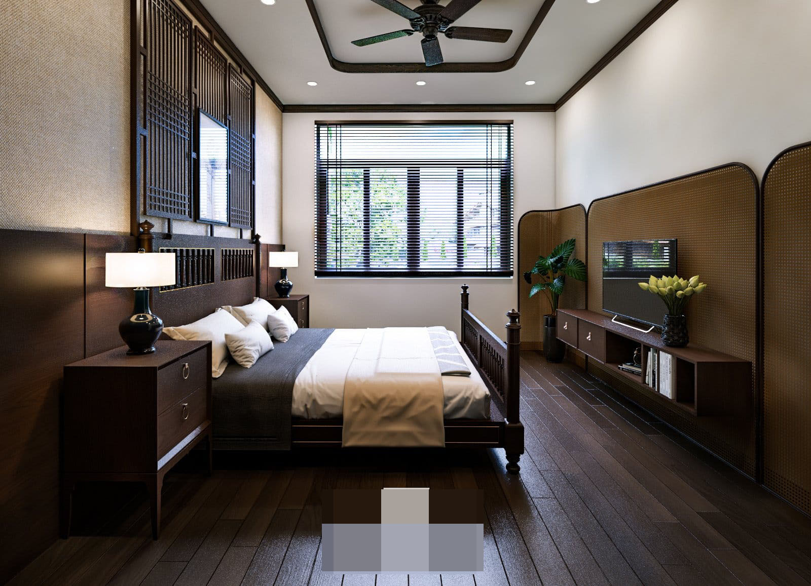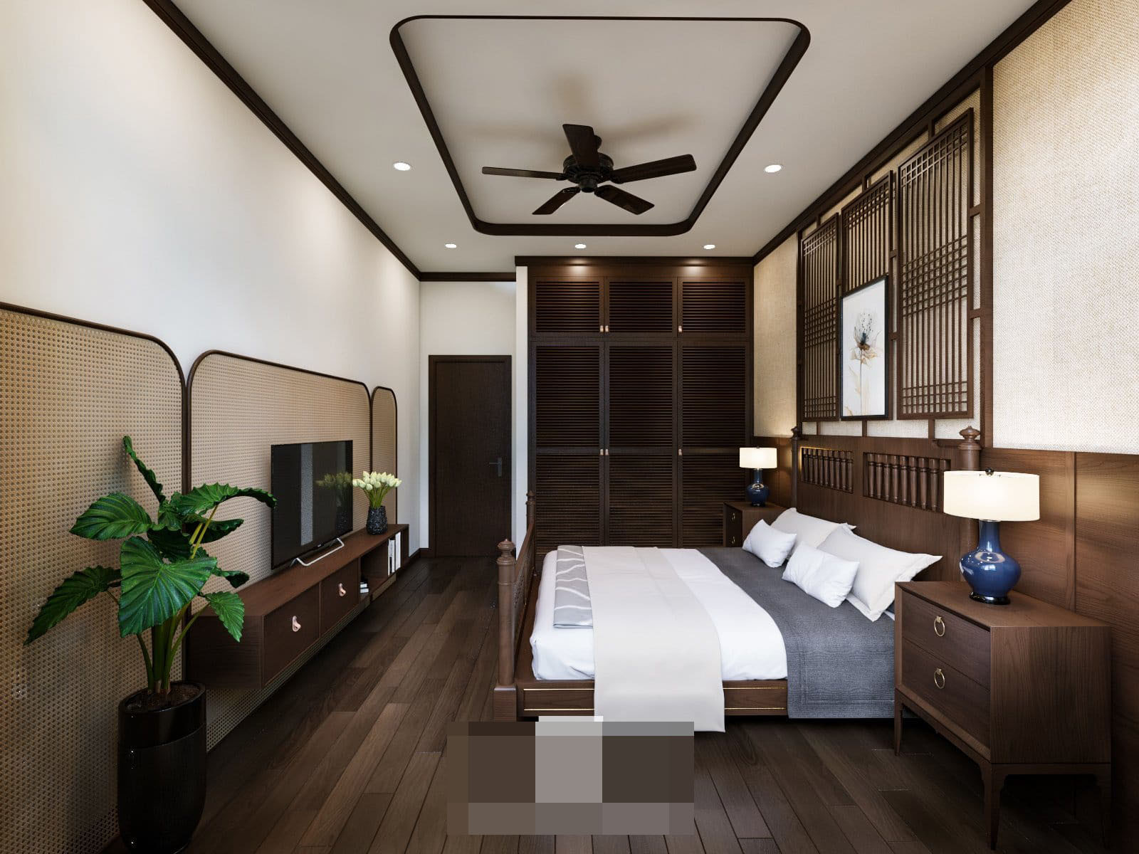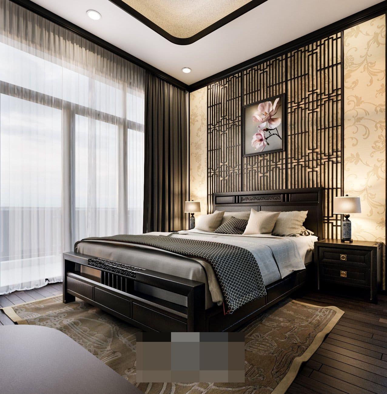 Phòng ngủ sang trọng, đường nét tỉ mỉ. Mảng lam gỗ cắt CNC nghệ thuật, tạo nét đẹp cổ điển. Tủ gỗ thịt hình chữ L tăng diện tích chứa đồ, đảm bảo tính thẩm mỹ cho không gian.