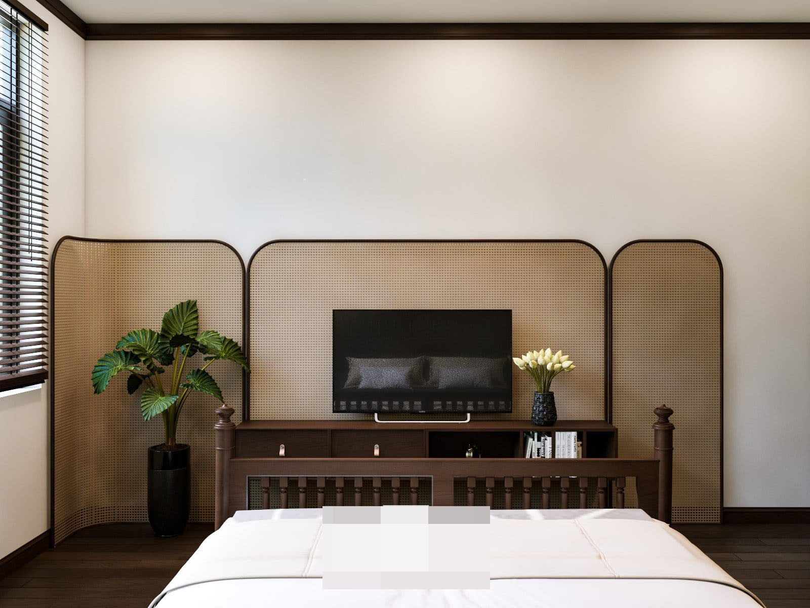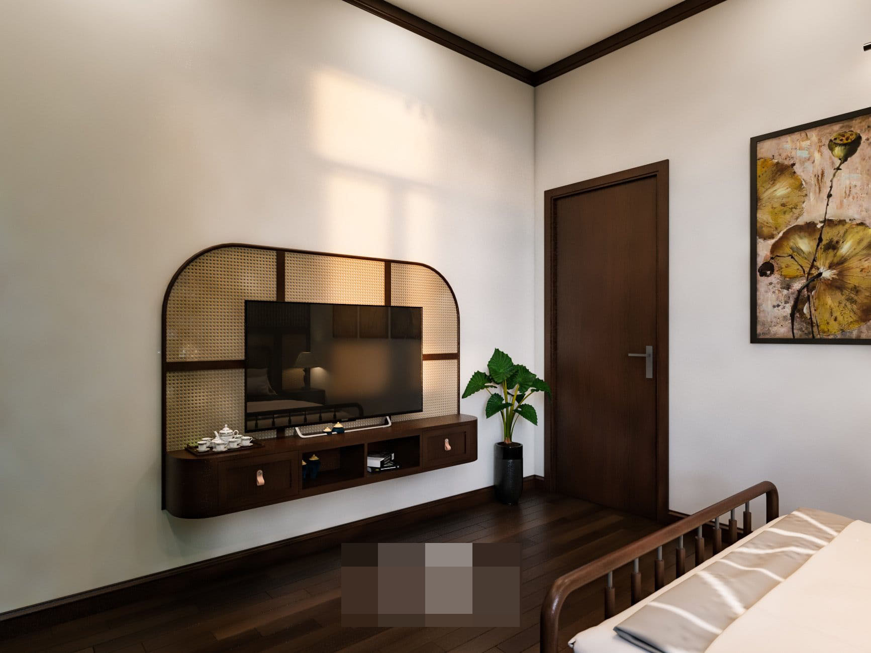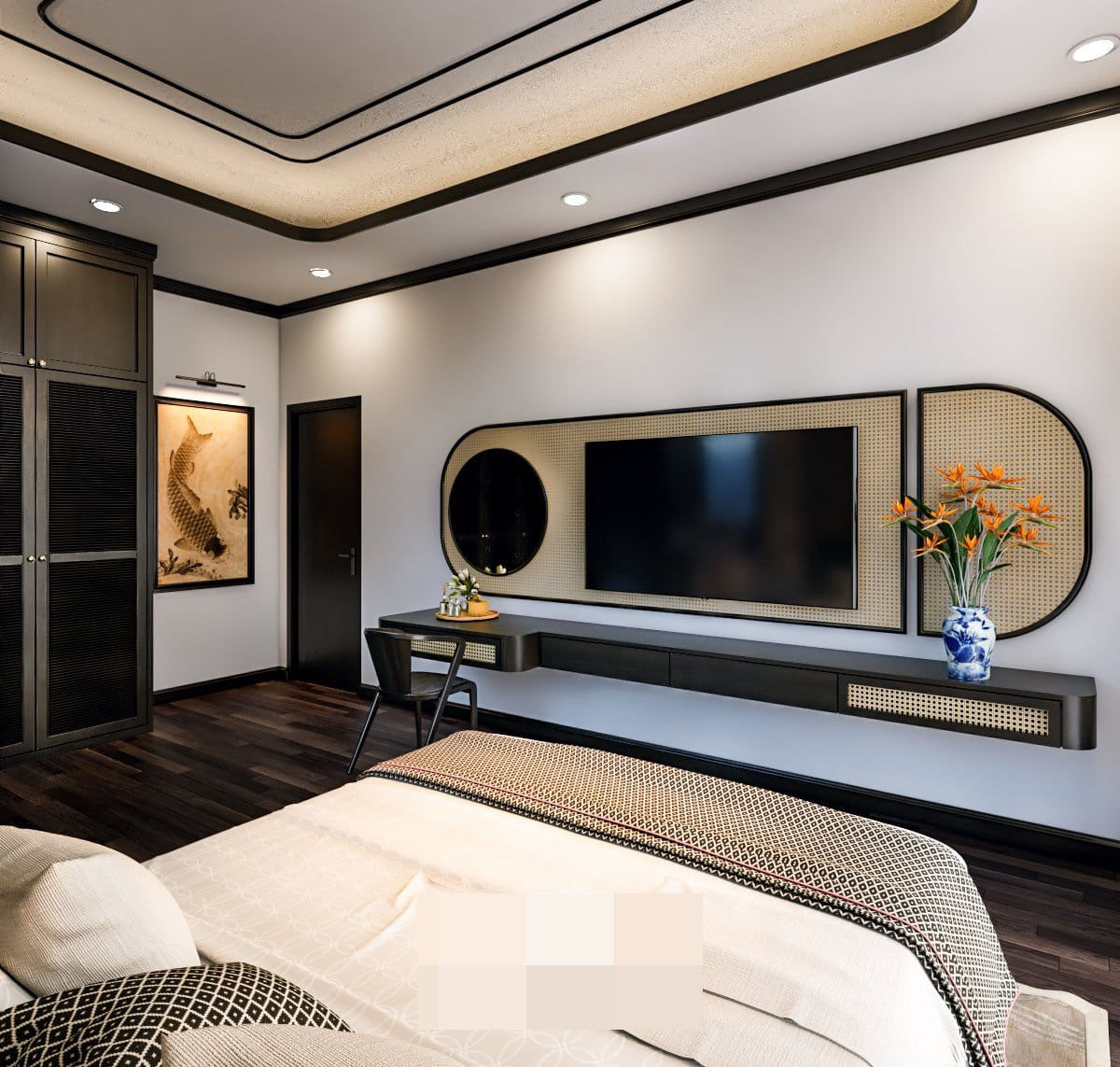 Gỗ kết hợp mây đan mắt cáo tạo nét đẹp rất cuốn hút. Kệ tivi kết hợp bàn trang điểm ấn tượng, bố cục hài hòa với tủ cũng như giường ngủ. Bức tranh cá chép mang ý nghĩa phúc lộc dồi dào, biểu thị cho cá chép hóa rồng, công danh sự nghiệp thành đạt và ý nghĩa sinh con dễ dàng, thuận lợi, con cái giỏi giang. Ánh sáng sử dụng vừa đủ, tạo độ ấm cúng nhưng không bị gắt.