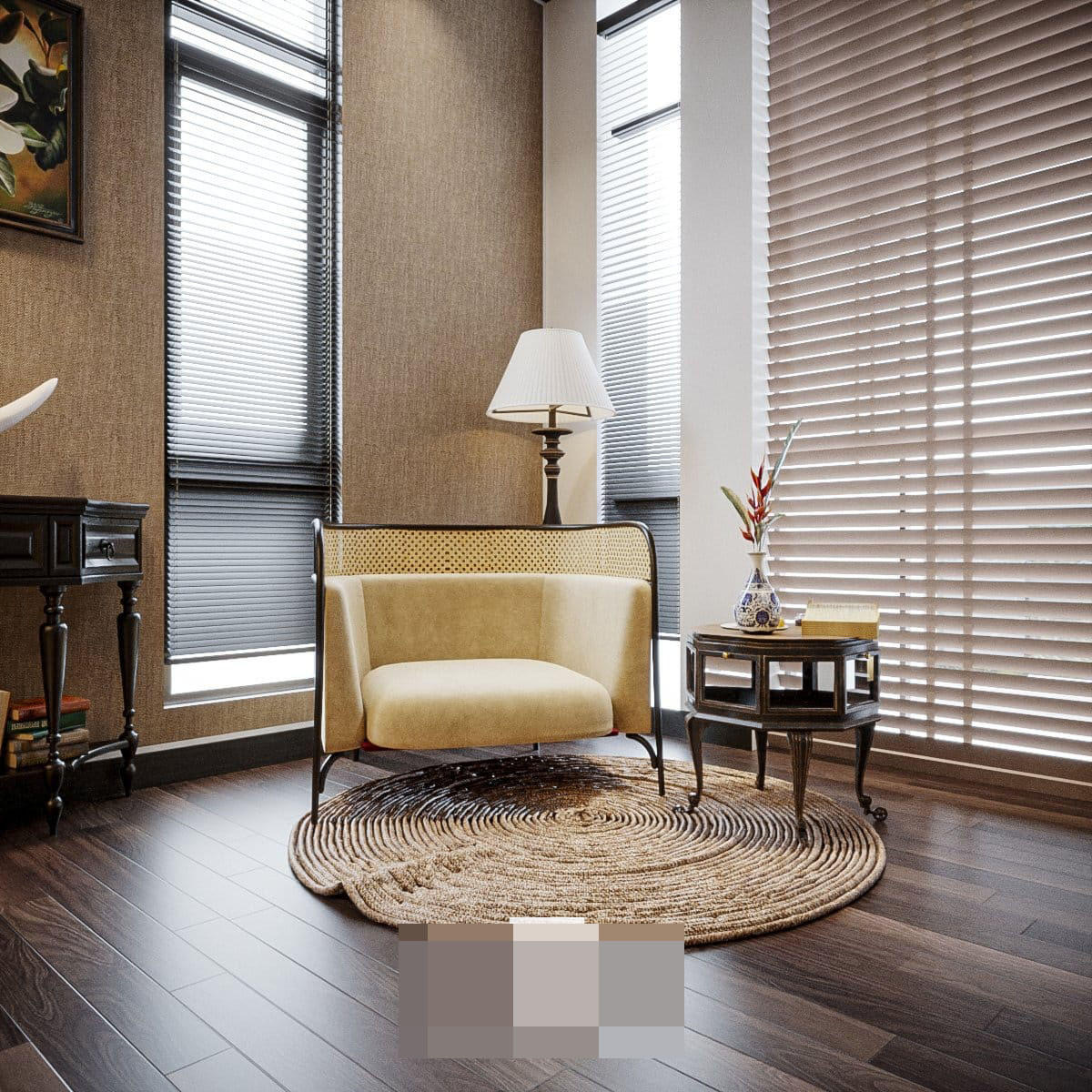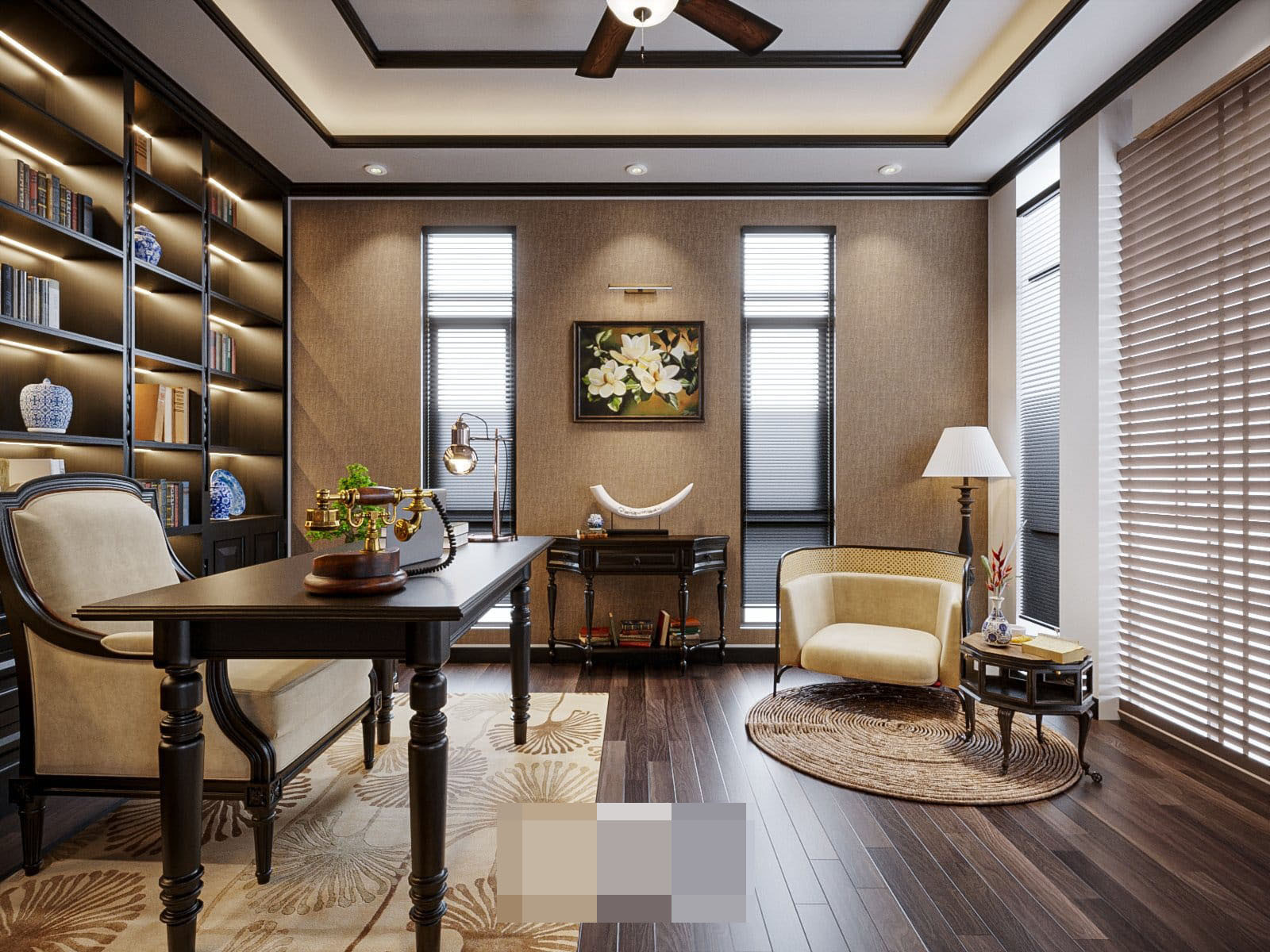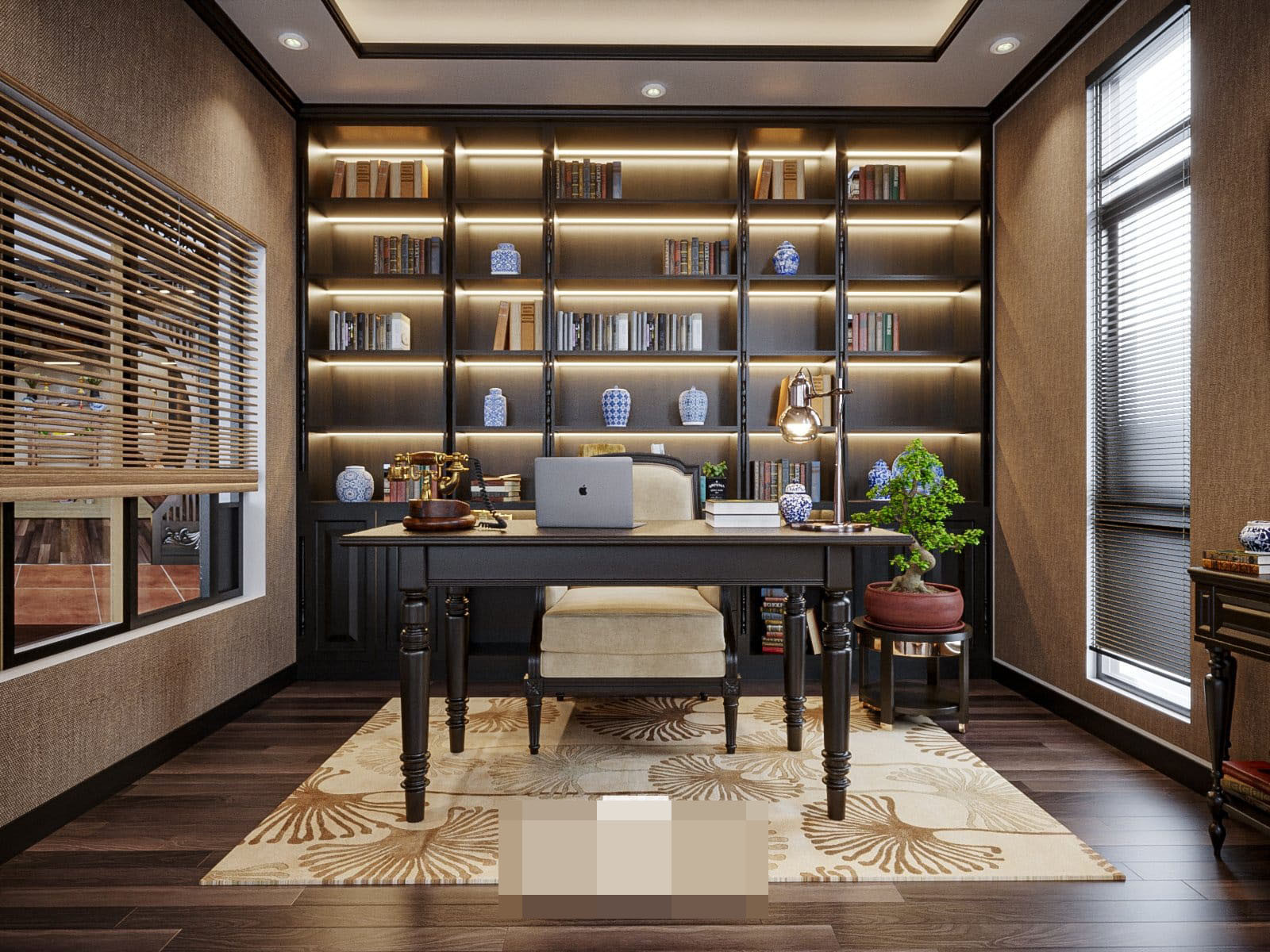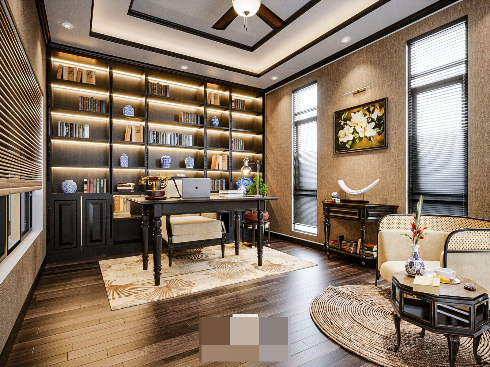 Gia chủ là người rất coi trọng không gian làm việc, vì ở đó sẽ giúp họ thăng hoa, nhiều năng lượng hơn. Nhóm kiến trúc sư đã bố trí phòng làm việc riêng biệt, nhiều ánh sáng, gió trời với nội thất tiện nghi. Ngoài bàn làm việc, phòng có thêm bộ sofa đơn uống trà, thư giãn.
