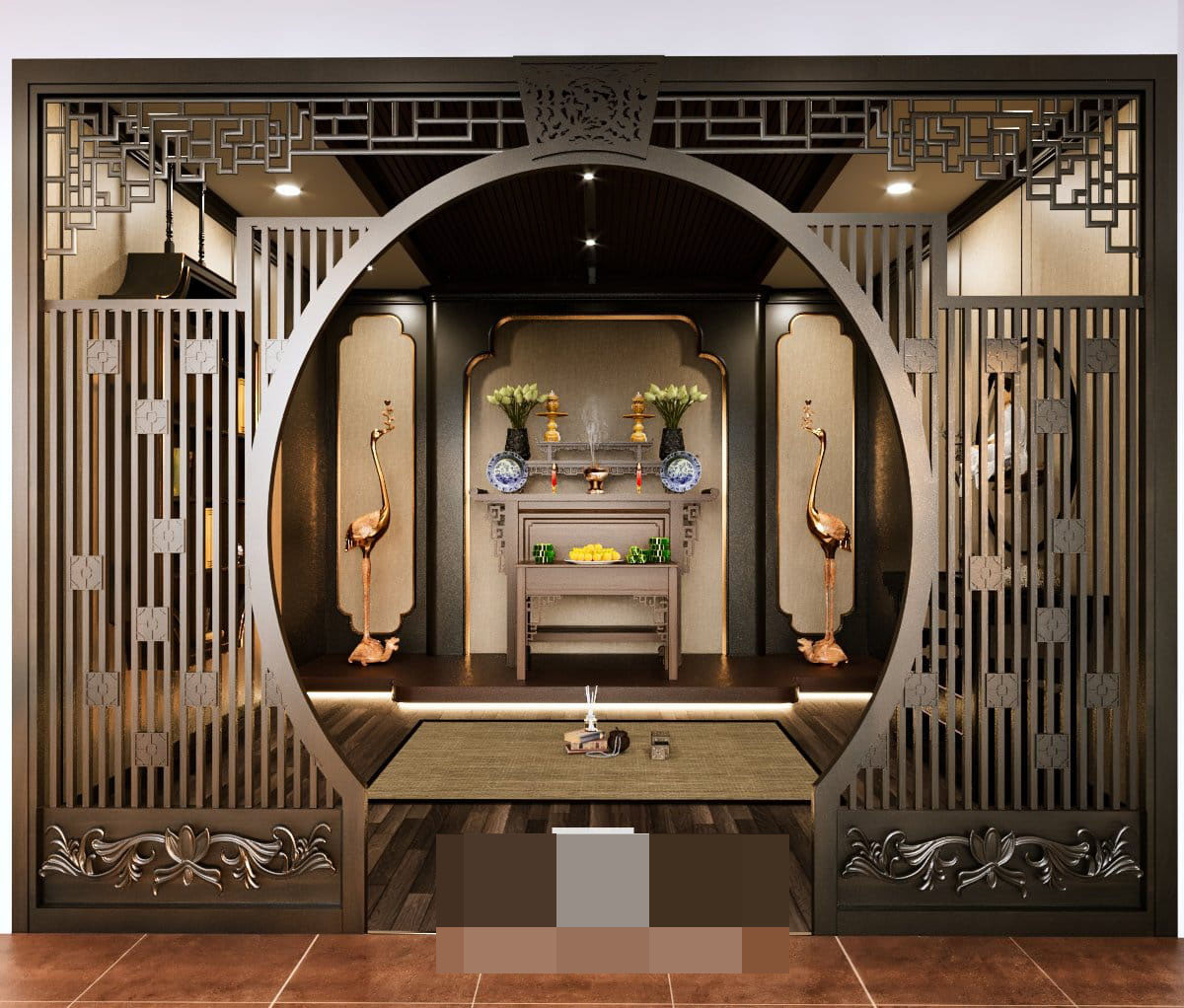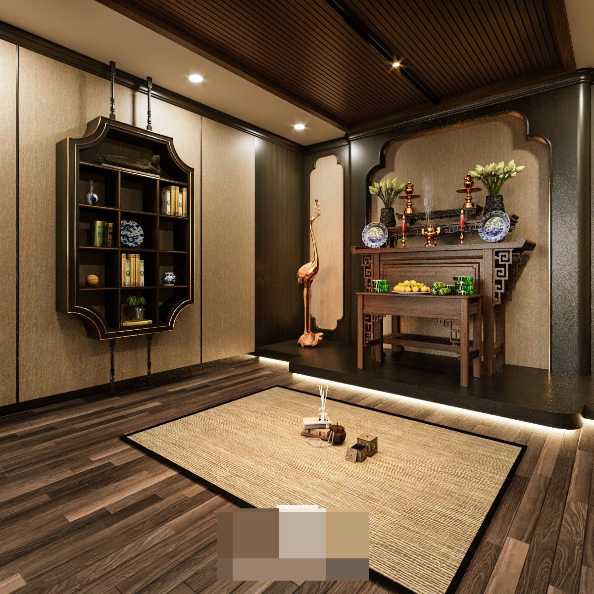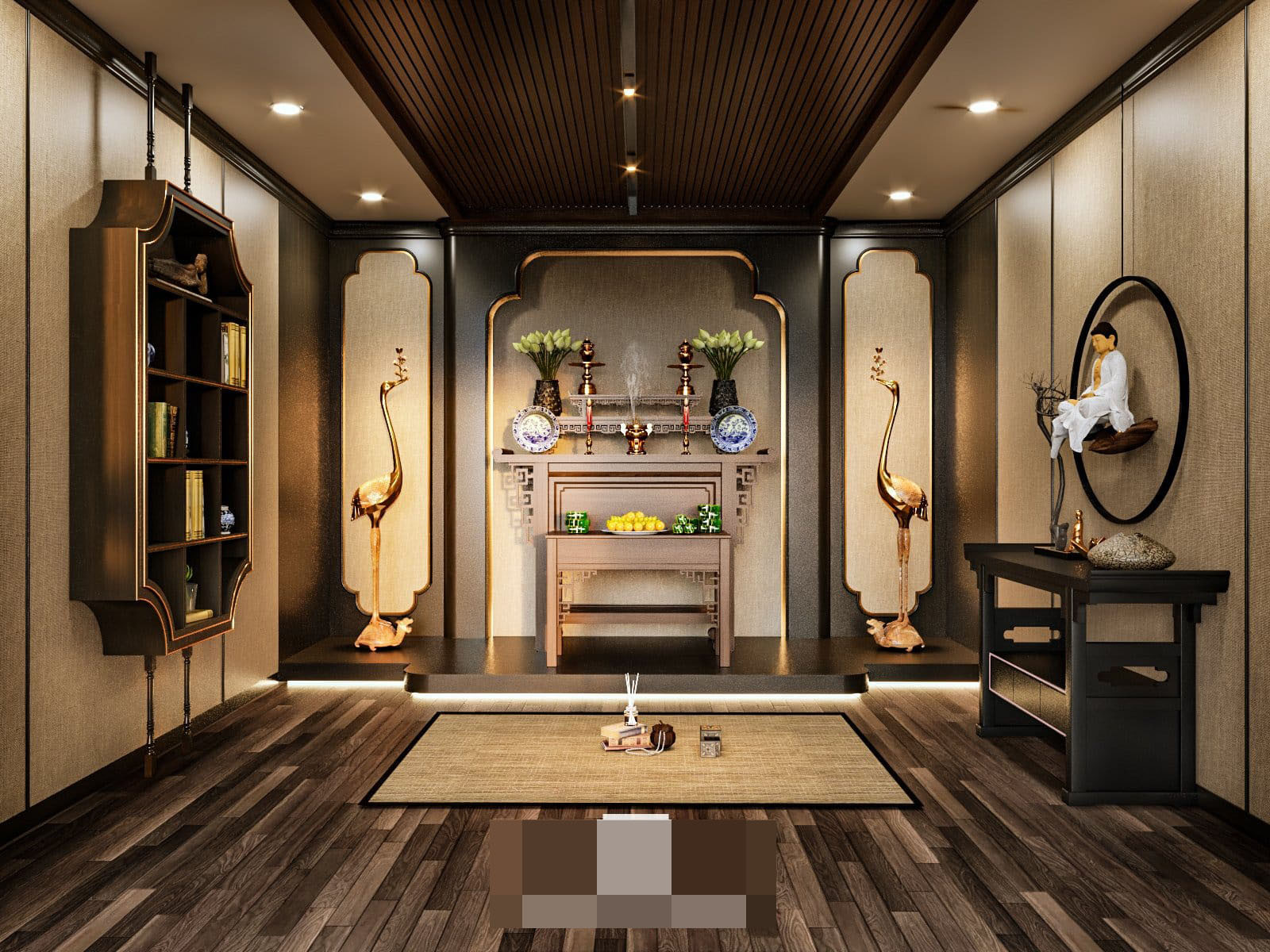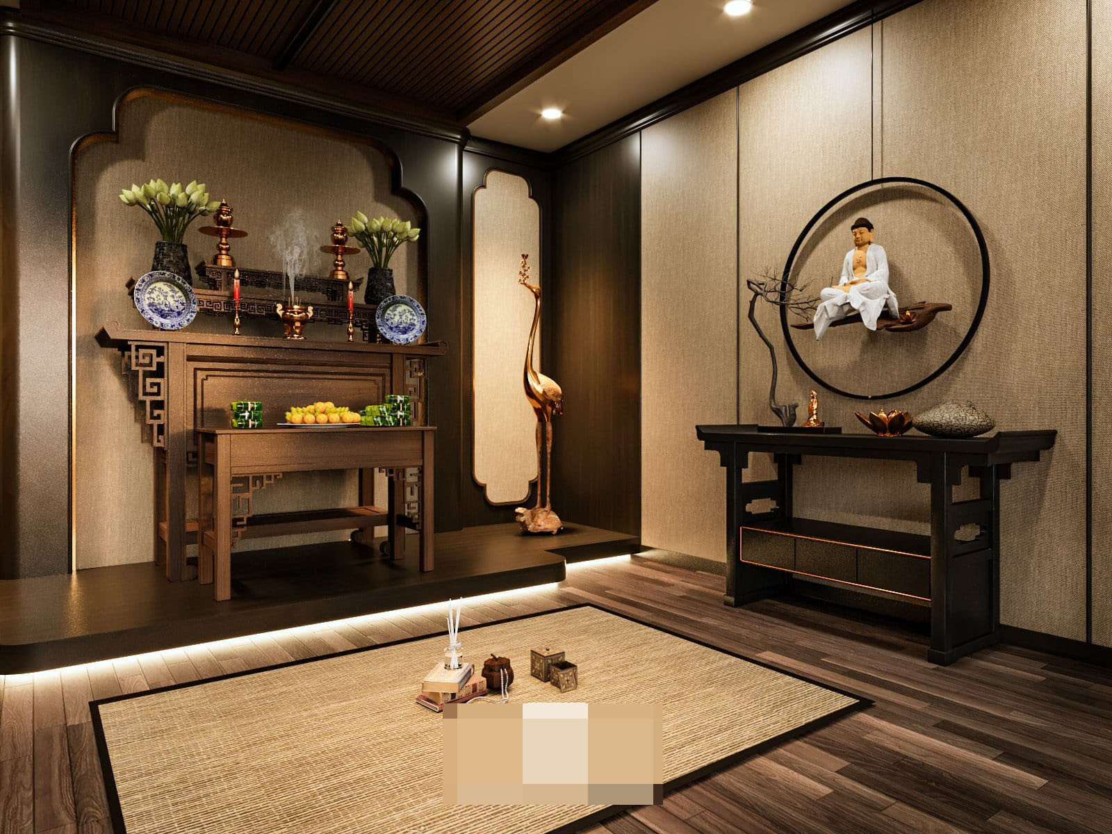 Trong các ngôi nhà truyền thống Việt Nam, không thể thiếu ban thờ. Đây là nét văn hóa tín ngưỡng lâu đời của người bản địa, thể hiện đạo hiếu, tưởng nhớ tổ tiên và người thân đã khuất. Vì vậy, kiến trúc sư đã tạo ra không gian linh thiêng, trầm mặc mà đầy đủ nhất. Bên cạnh ban thờ tổ tiên, có thêm ban thờ Phật và góc ngồi thiền.