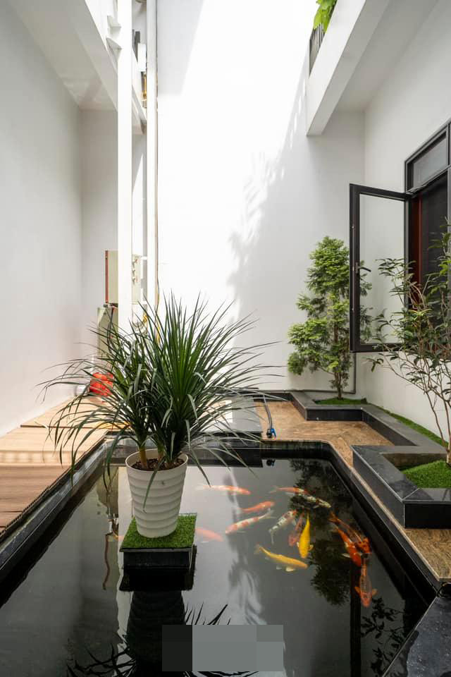 Khoảng nghỉ tiếp nối với phòng bếp là bể cá Koi sinh động. Bể cá có tác dụng điều hòa không khí, giảm nhiệt cho nhà khi trời nắng. Phía trên mái của bếp là vườn trồng rau sạch và khu nướng BBQ sát bìa rừng.