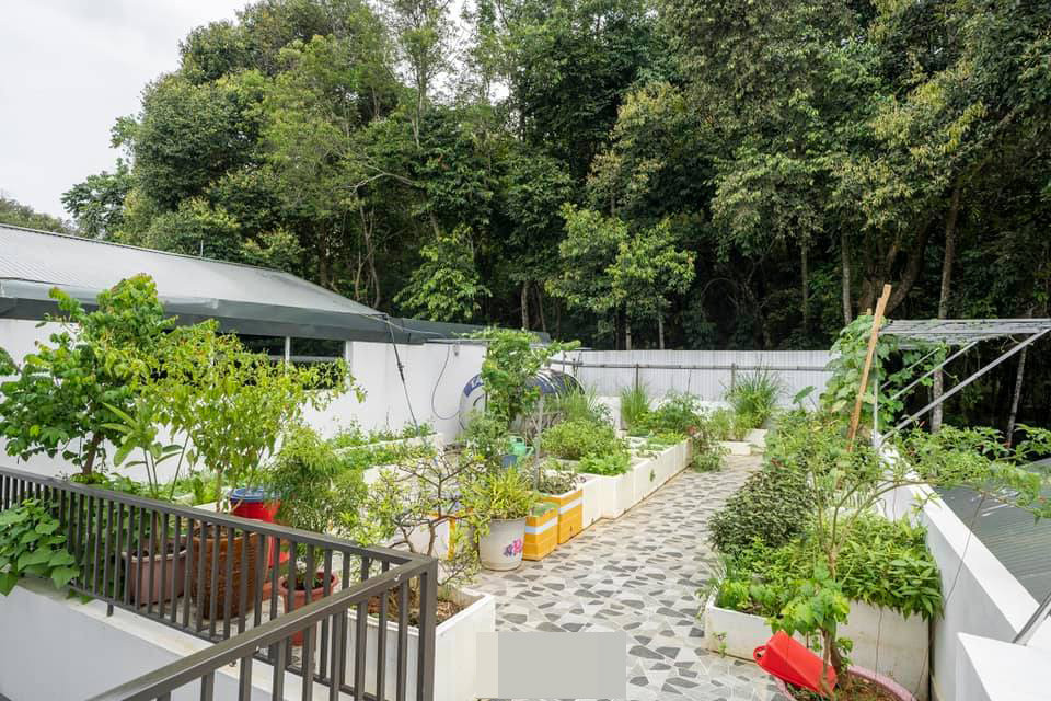 Sân vườn BBQ, trồng rau sát bìa rừng. Những ngày nghỉ, cả gia đình quây quần, cùng làm vườn và thưởng thức bữa tiệc nướng dân dã, đầm ấm. Ngoài ra, gia chủ còn bố trí một phòng gym tại gia với thiết bị máy móc hiện đại.
