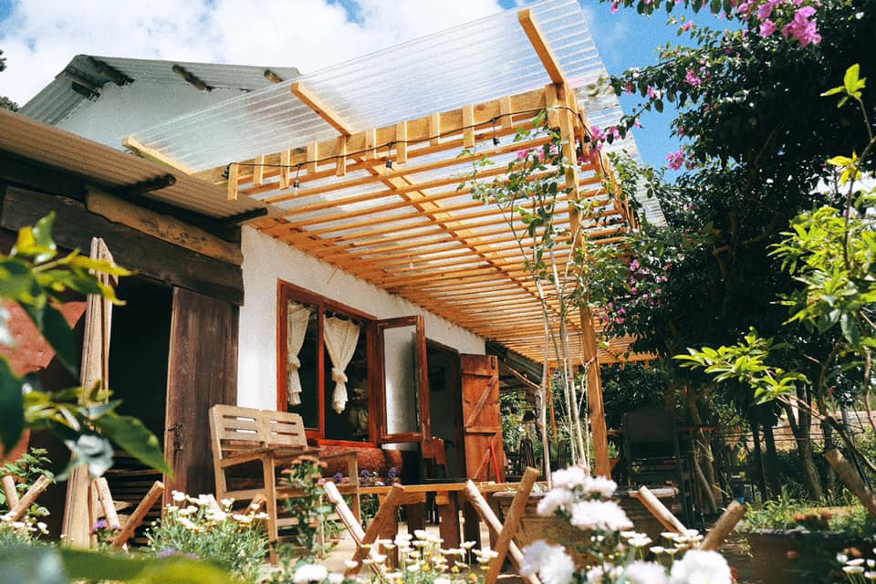Mái hiên rộng bằng giàn lam gỗ, bên trên dùng tấm nhựa cản mưa, lấy sáng cho sân.