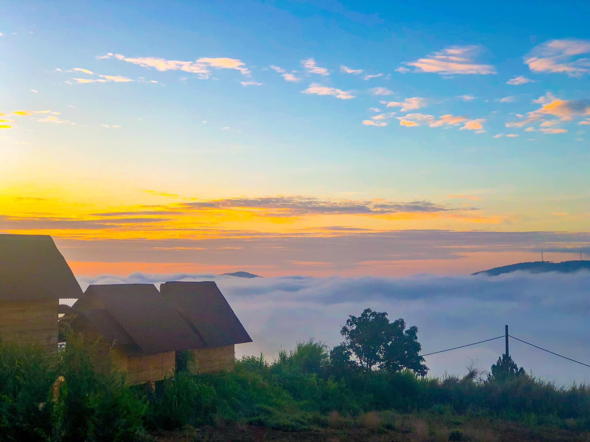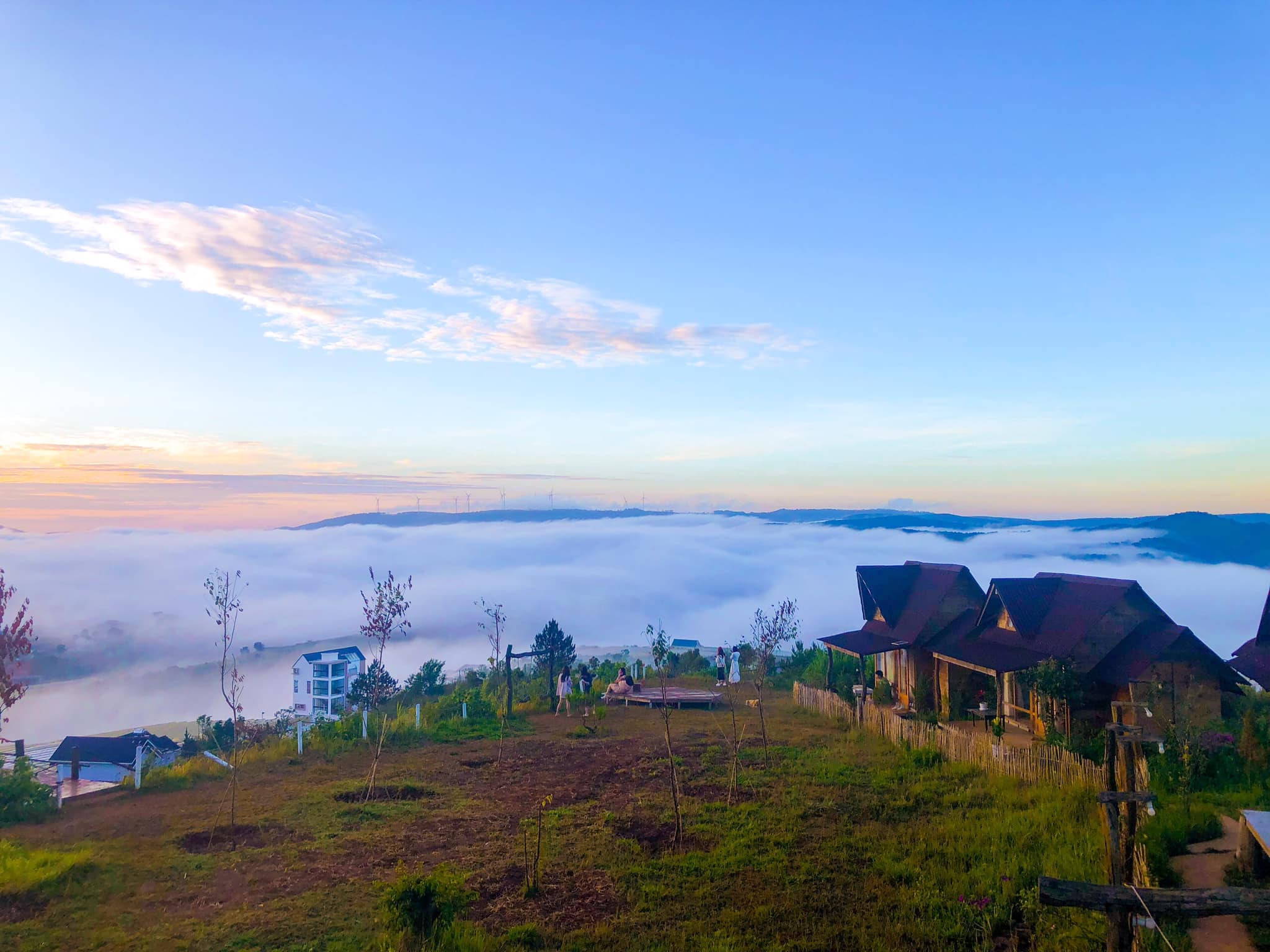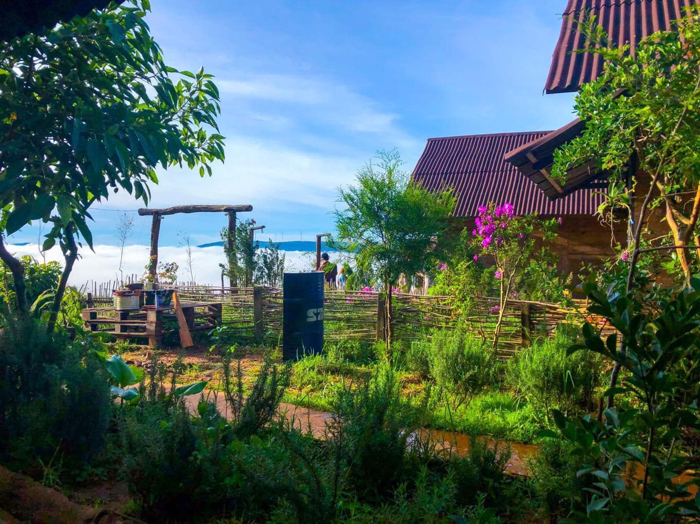 Nhà gỗ hiện lên trong màn mây phủ.