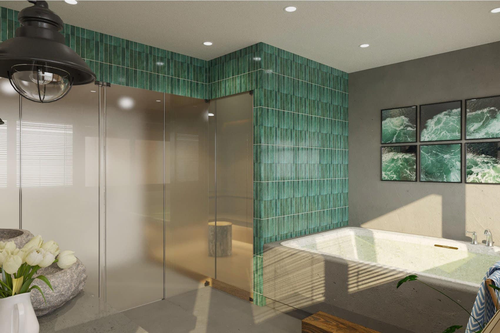 Phòng vệ sinh giống khách sạn 5 sao, phần tường ốp gạch xanh lá dễ chịu.