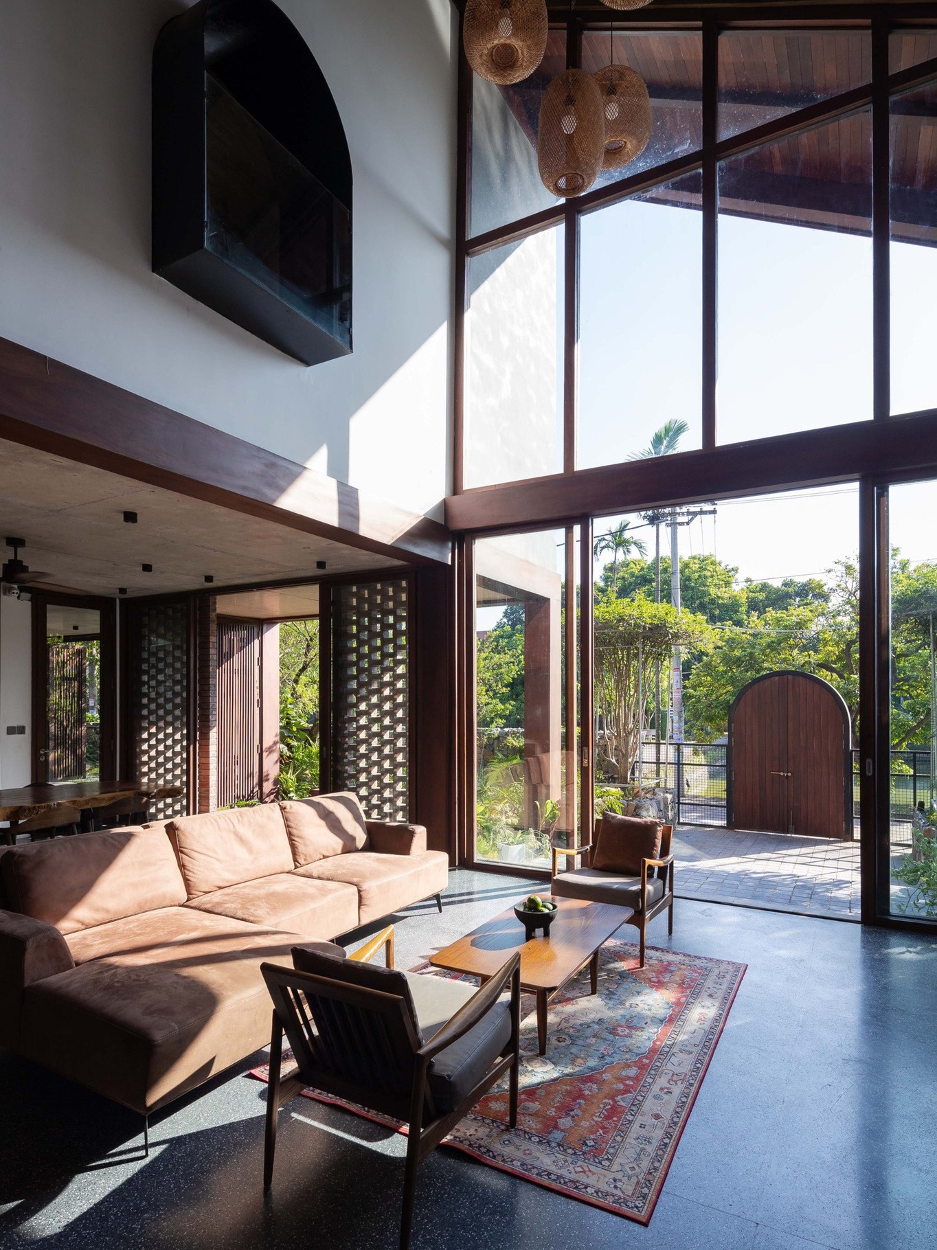 Sự đan xen giữa kiến trúc cổ và hiện đại tạo nên không gian sống nghỉ dưỡng tuyệt vời, vừa có cây xanh, vừa có tiện nghi. Mảng tường kính lớn giúp cản bụi cho nhà nhưng cũng ngập tràn ánh sáng.
