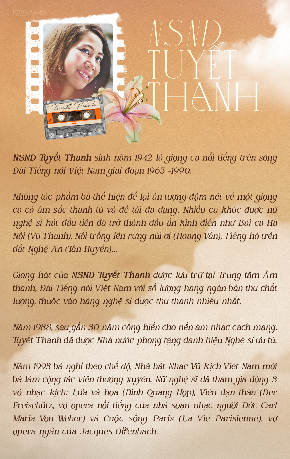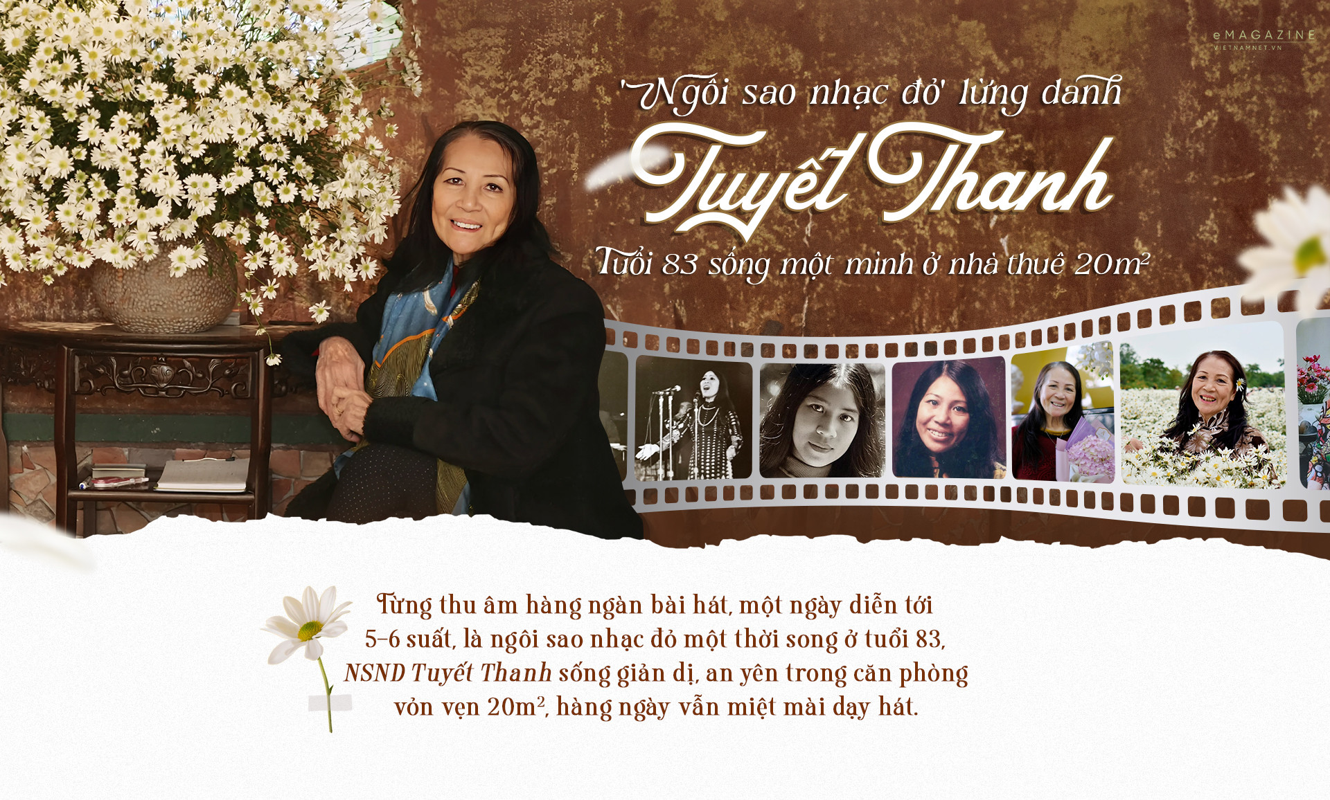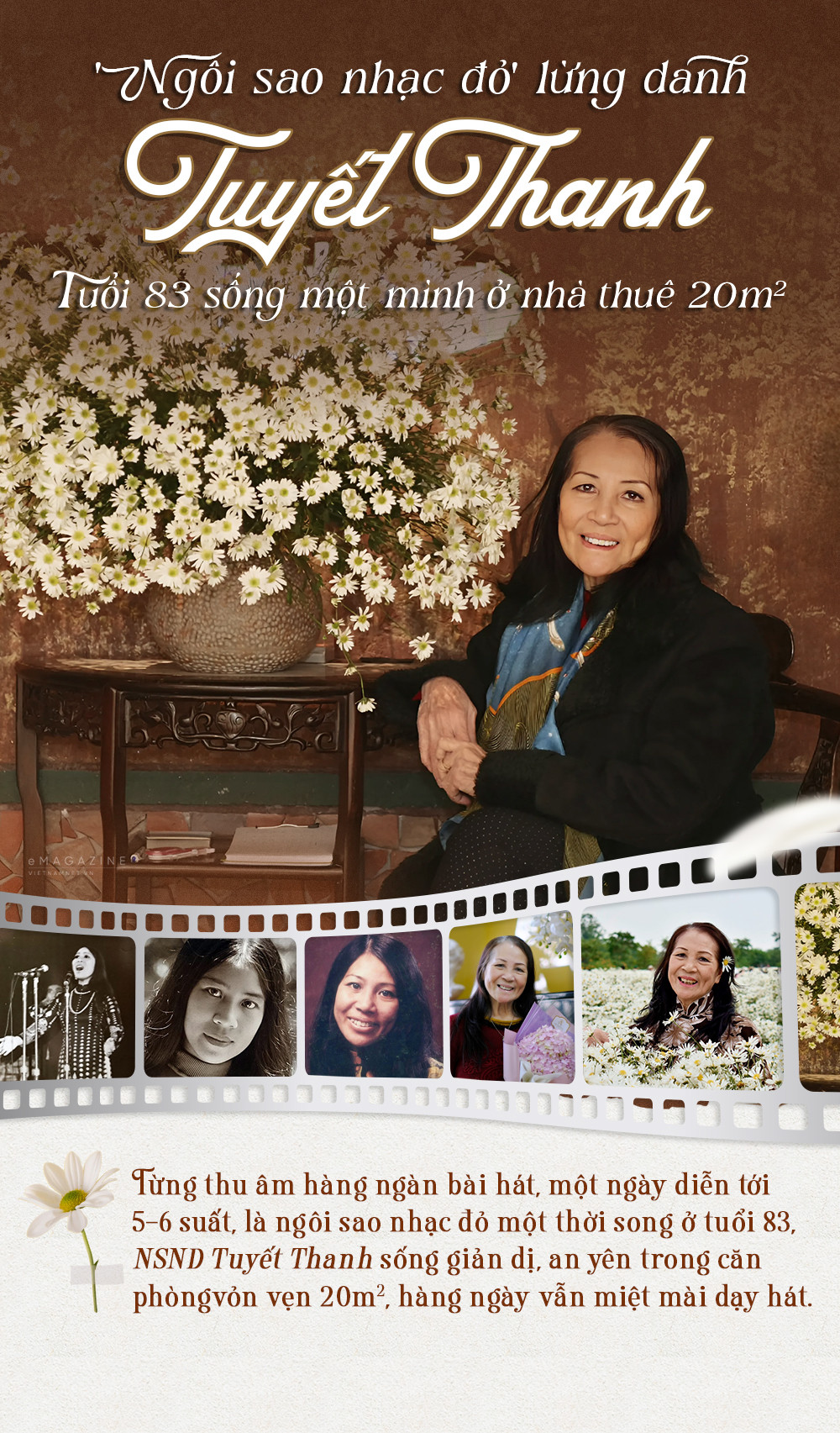 Trong căn hộ đi thuê vỏn vẹn gần 20m2 tại khu tập thể Vĩnh Hồ (Hà Nội), NSND Tuyết Thanh sống an yên ở tuổi 83. Có thể khán giả không nhận ra ‘ngôi sao nhạc đỏ’ một thời khi gặp ngoài đường, song bước vào căn hộ nhỏ xinh, những bức ảnh - ký ức về một thời hoạt động nghệ thuật sôi nổi hẳn sẽ nể phục với những gì bà đã cống hiến cho âm nhạc.