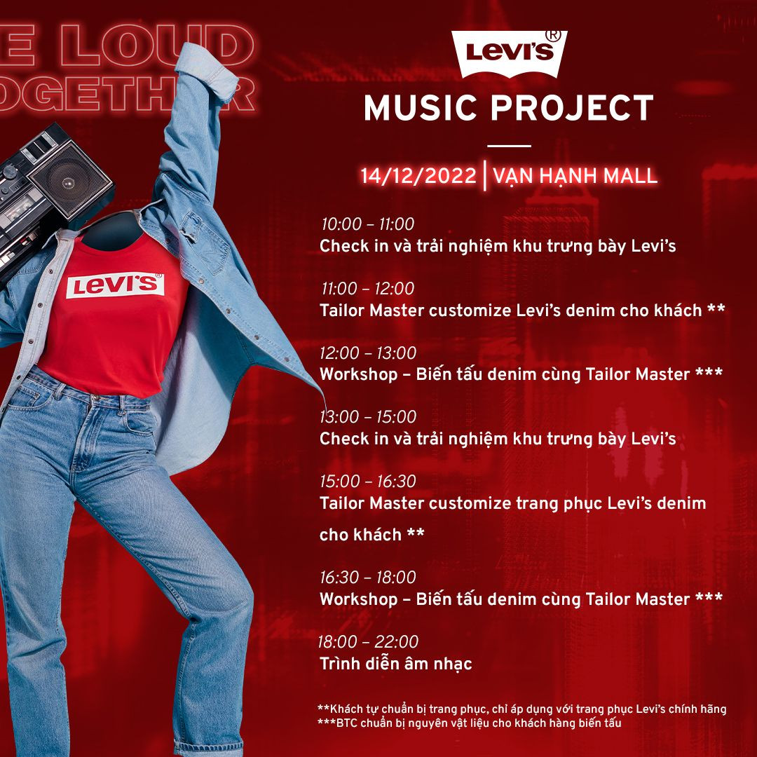 Sự kiện Levi's Music Project sẽ diễn ra từ 10h đến 22h ngày 14/12 tại Vạn Hạnh Mall (số 11 Sư Vạn Hạnh, phường 12, quận 10, TP.HCM), vào cửa tự do. Bên cạnh những tiết mục âm nhạc đặc sắc, sự kiện còn có các hoạt động ý nghĩa giúp lan tỏa ý thức bảo vệ môi trường đến với giới trẻ, bắt đầu từ việc lựa chọn quần áo. Theo đó, chương trình sẽ đem đến buổi workshop biến tấu denim cùng Tailor Master Kiệt Quách, lấy cảm hứng từ chất liệu thời trang bền vững. Khách hàng đến sự kiện có thể tự do sáng tạo biến tấu trang phục của Levi's theo cá tính riêng của mỗi người.
