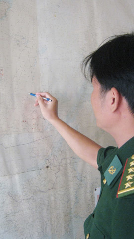 | Đại úy Đỗ Ngọc Đại chỉ trên bản đồ vùng biển thuộc chủ quyền Việt Nam luôn bị tàu cá Trung Quốc xâm phạm. |
