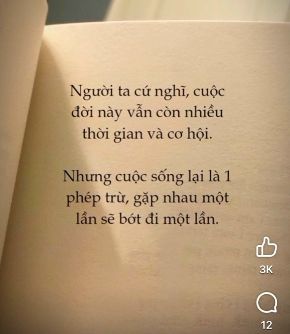 Ta chỉ có một lần để sống, và không thể tính được ngày nào mình bất thình lình ra đi, chi bằng cứ thoải mái một chút để lỡ có bất ngờ ra đi thì ta và người thân ta ít phải hối tiếc nhất.