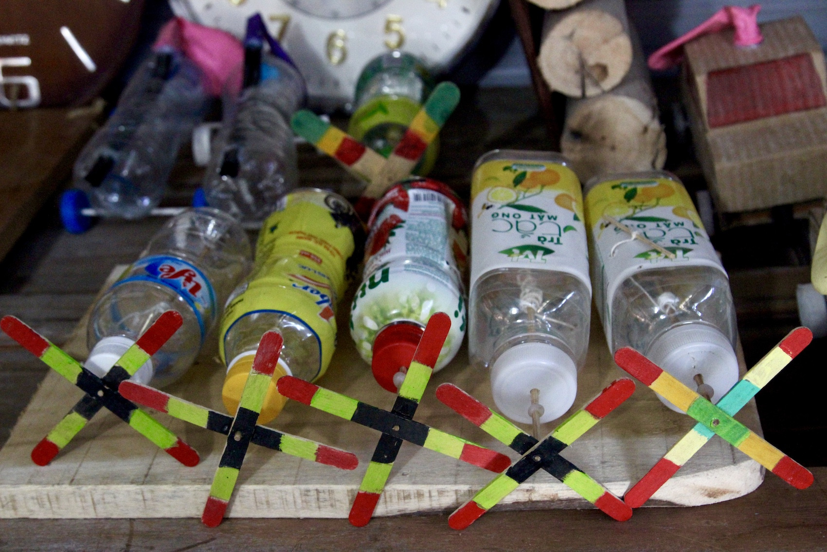 Các rác thải nhựa, giấy, thuỷ tinh được các thành viên trong Vườn tái chế NNC thu gom từ các tuyến đường trong thôn, xã mỗi tuần một lần. Sau đó, họ nghiên cứu và chế tạo nên các sản phẩm độc đáo như xe, chuông gió, hình động vật.