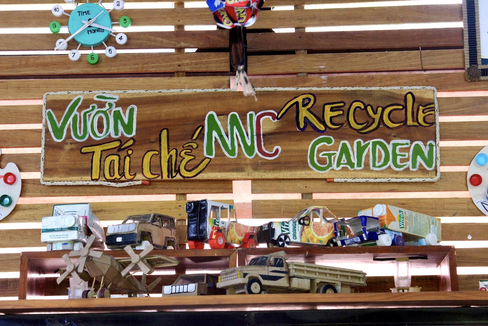 Vườn tái chế NNC rộng hơn 2000m2 với nhiều khu như vườn rau, giao lưu âm nhạc… Trong đó có hai khu tái chế rác thải nhựa, giấy, thuỷ tinh và khu tái chế vải vụn.