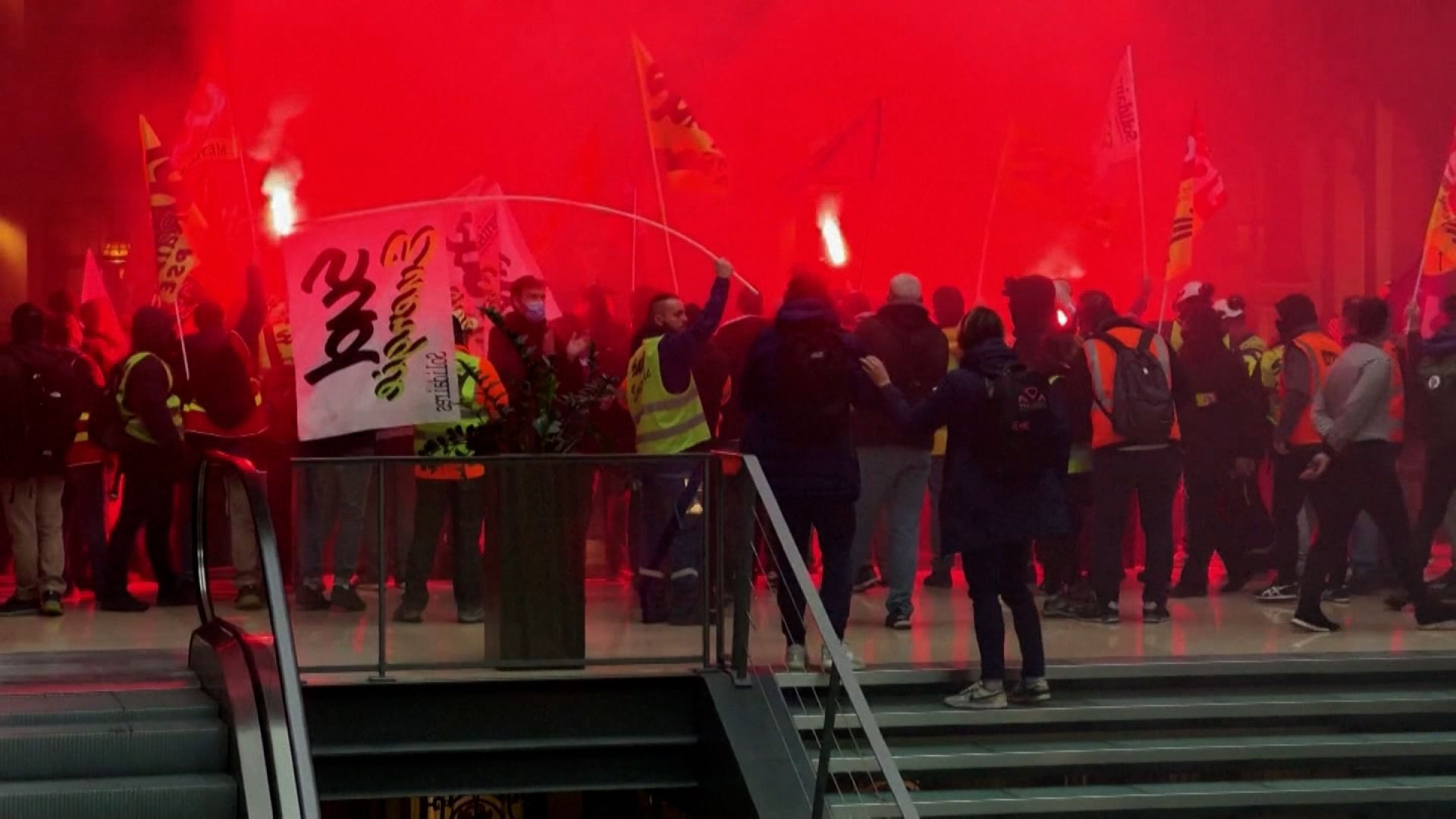 Họ cầm theo pháo sáng màu đỏ và bắn bom khói. Khoảng 100 người bao gồm đại diện của một số liên đoàn lao động đã có mặt ở tầng trệt của tòa nhà trong khoảng 10 phút, và hô vang các khẩu hiệu phản đối cải cách lương hưu của Chính phủ Pháp.