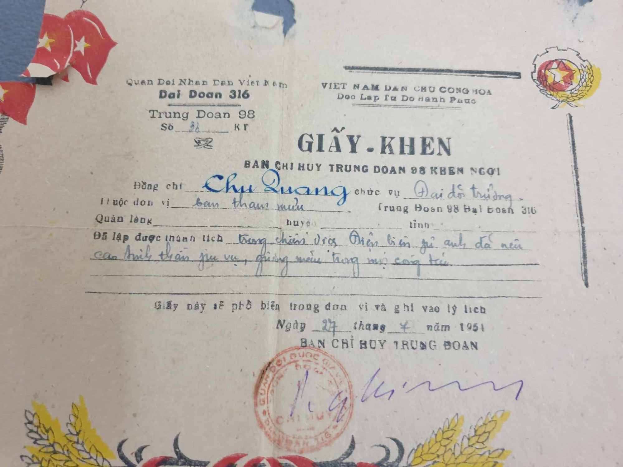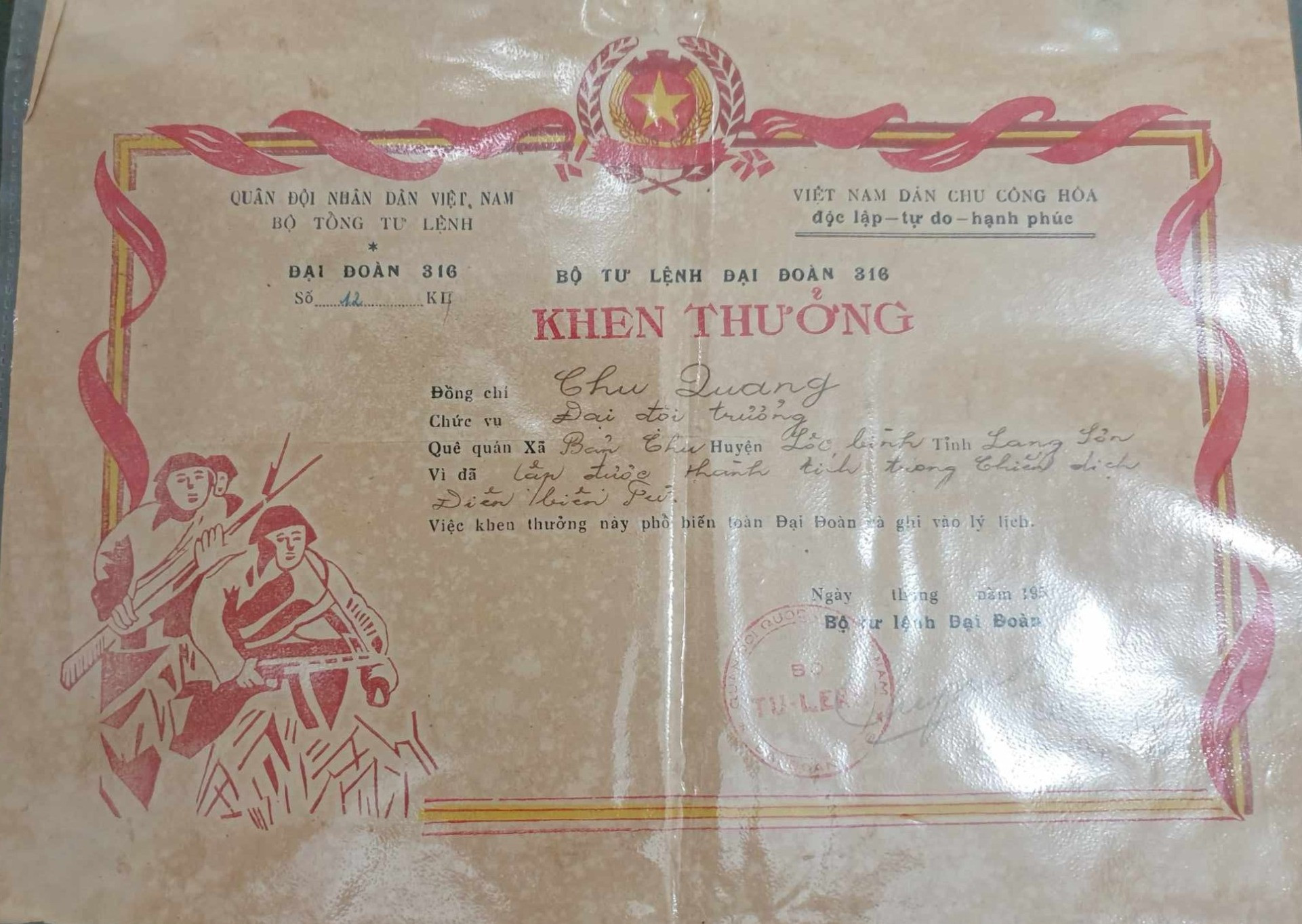 Bộ Tư lệnh Đại đoàn 316 do Chính ủy Chu Huy Mân ký khen thưởng Đại đội trưởng Chu Quang đã lập được thành tích trong Chiến dịch Điện Biên Phủ. Việc khen thưởng được phổ biến trong toàn Đại đoàn và ghi vào lý lịch.