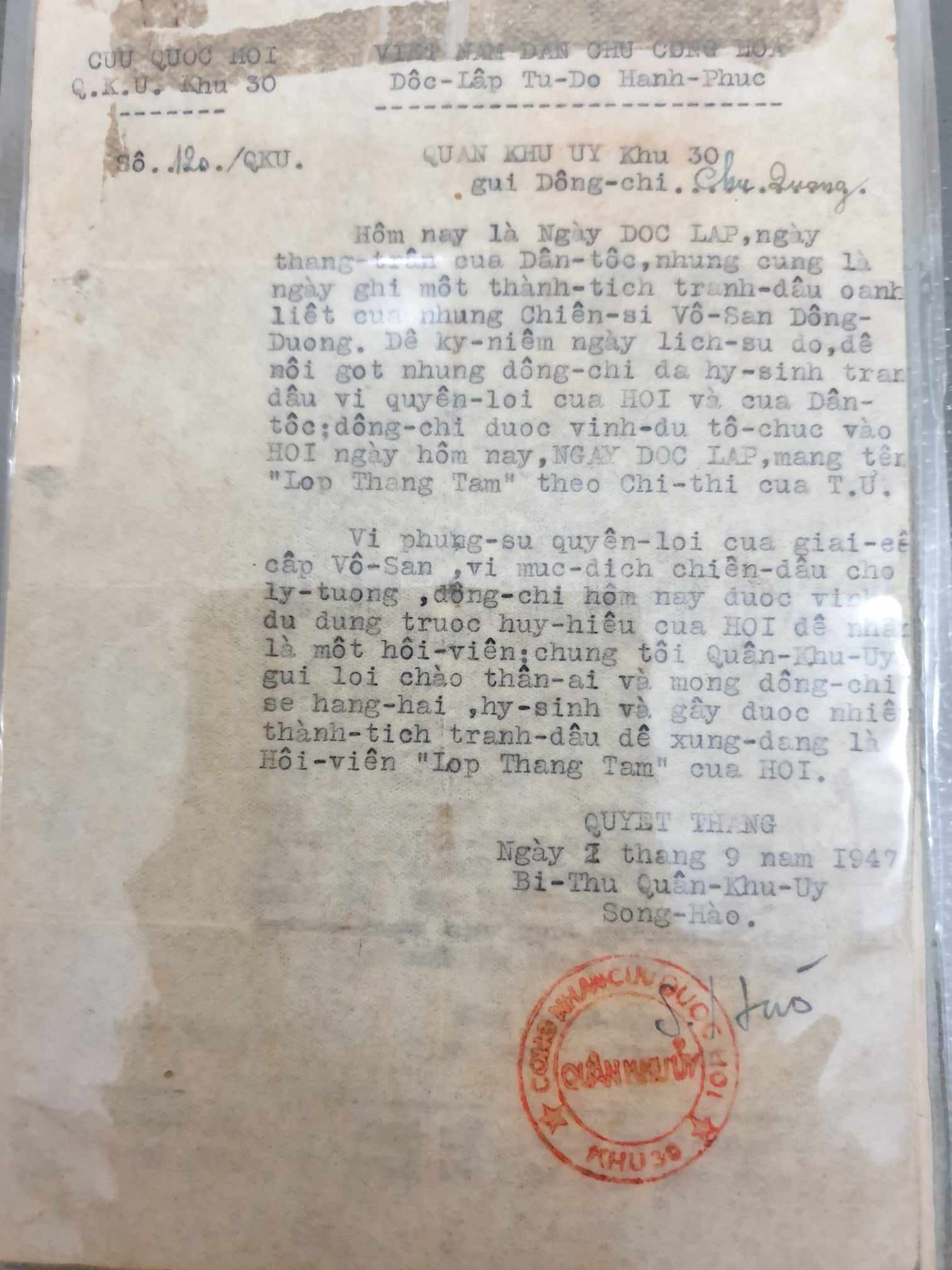 Đó là tấm giấy pơ luy đã ngả màu, khổ nhỏ có tiêu đề Cứu Quốc Hội - Quân Khu Ủy Khu 30 do Bí thư Song Hào ký ngày 2/9/1947. Khi đó, sau khi tuyên bố ‘’tự giải tán“ ngày 11/11/1945, Đảng rút vào hoạt động bí mật tiếp tục lãnh đạo cách mạng. Bố tôi được vinh dự đứng vào hàng ngũ của Hội Cứu Quốc - tổ chức Đảng ngày ấy - vào đúng ngày Độc lập năm 1947, trở thành đảng viên “Lớp Tháng Tám”.