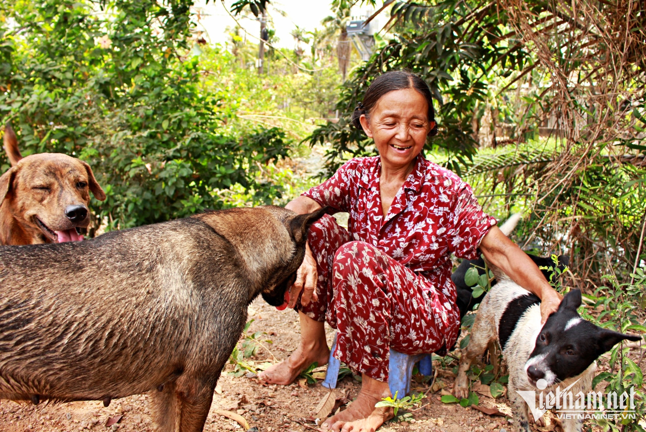 Dưới bóng mát của hàng dừa nước, bà đùa vui cùng đàn chó. Chúng quấn quýt dưới chân, dụi đầu vào người bà. Chốc chốc lại có chú cún tinh nghịch, nhảy chồm lên người khiến bà giật mình, phải ra lời mắng yêu.