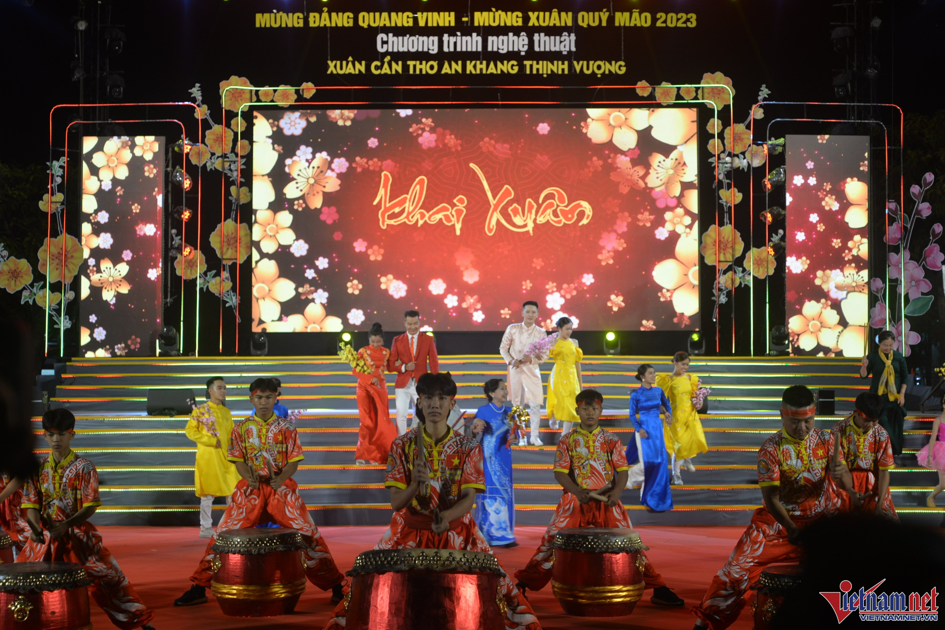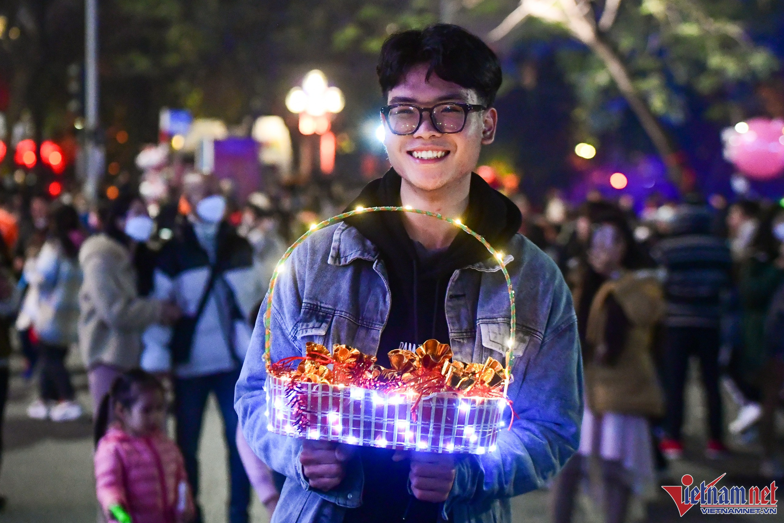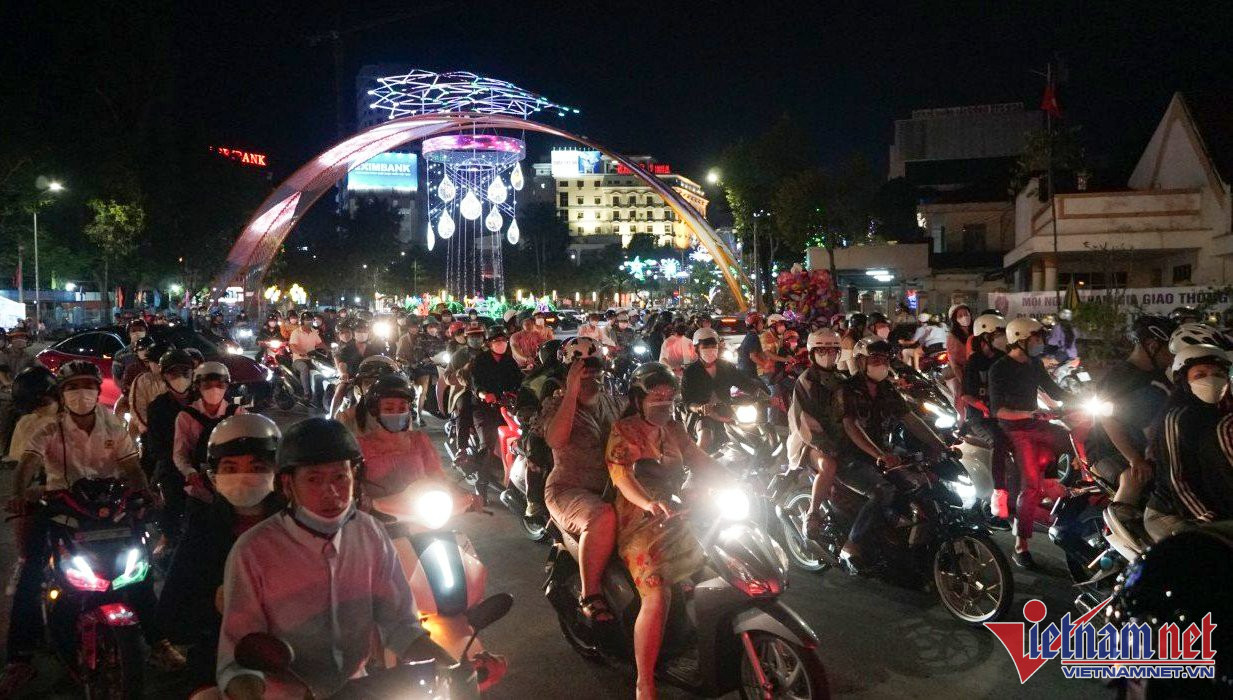 Thời tiết mát mẻ, dòng người đổ về trung tâm thành phố vui chơi, dạo phố, chờ thời khắc bắn pháo hoa đón năm mới. Đại lộ Hoà Bình và đường 30/4 (quận trung tâm Ninh Kiều) được trang trí đèn lung linh màu sắc.