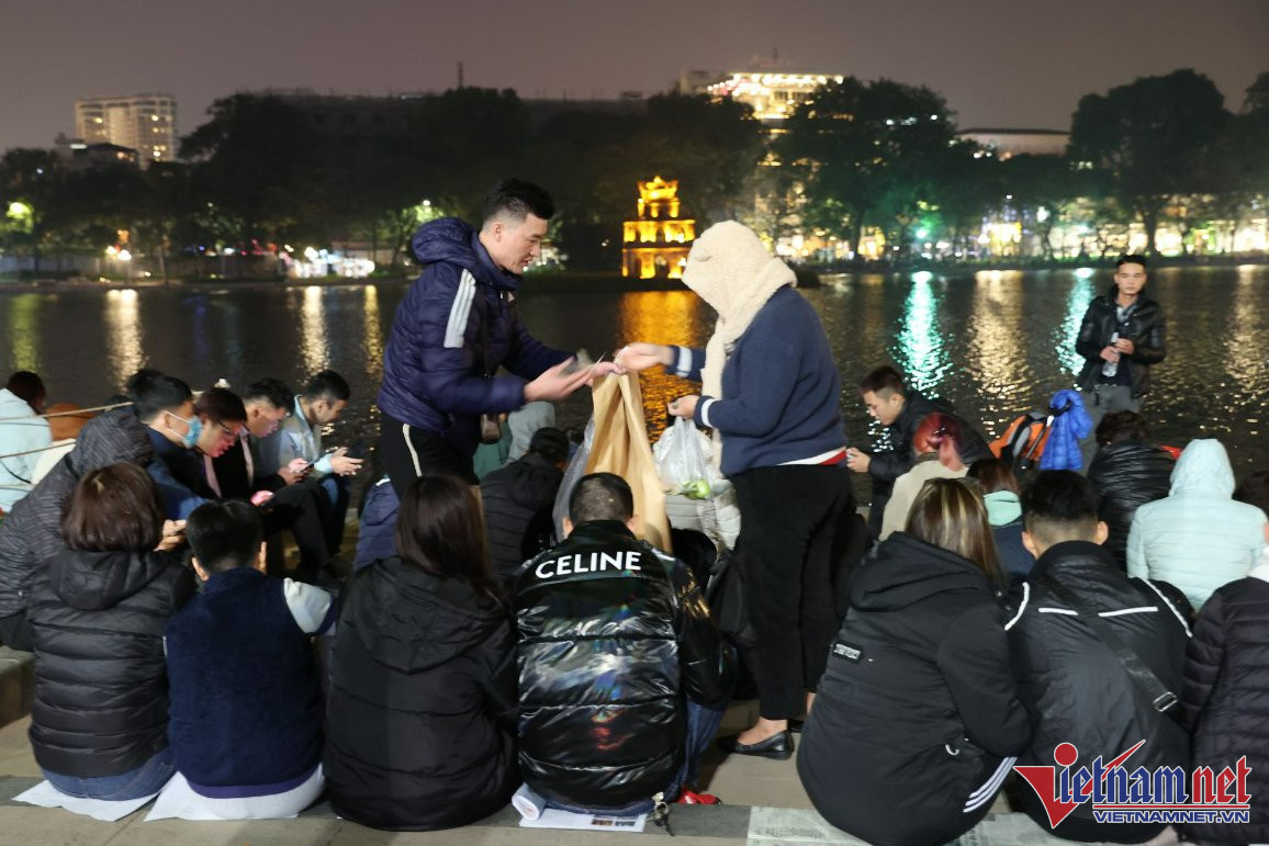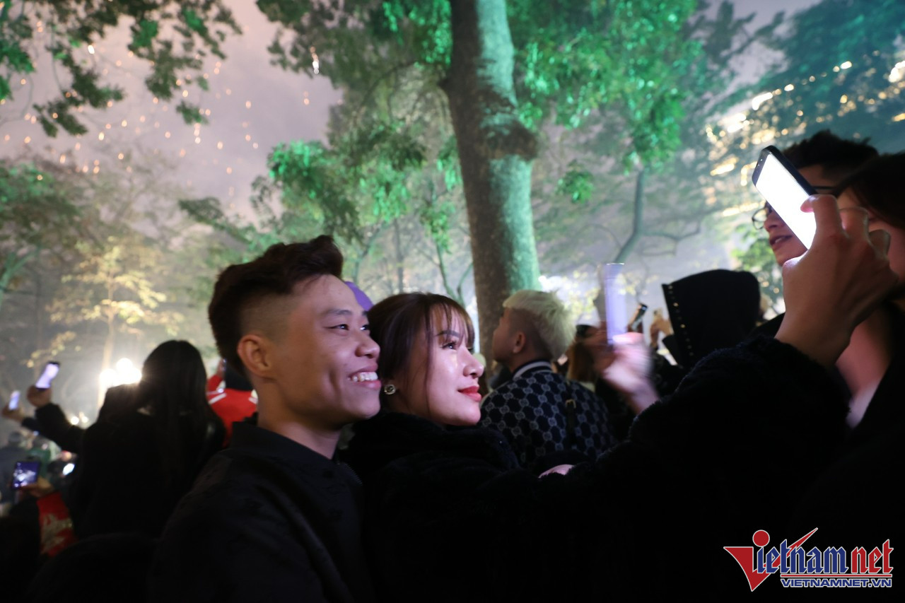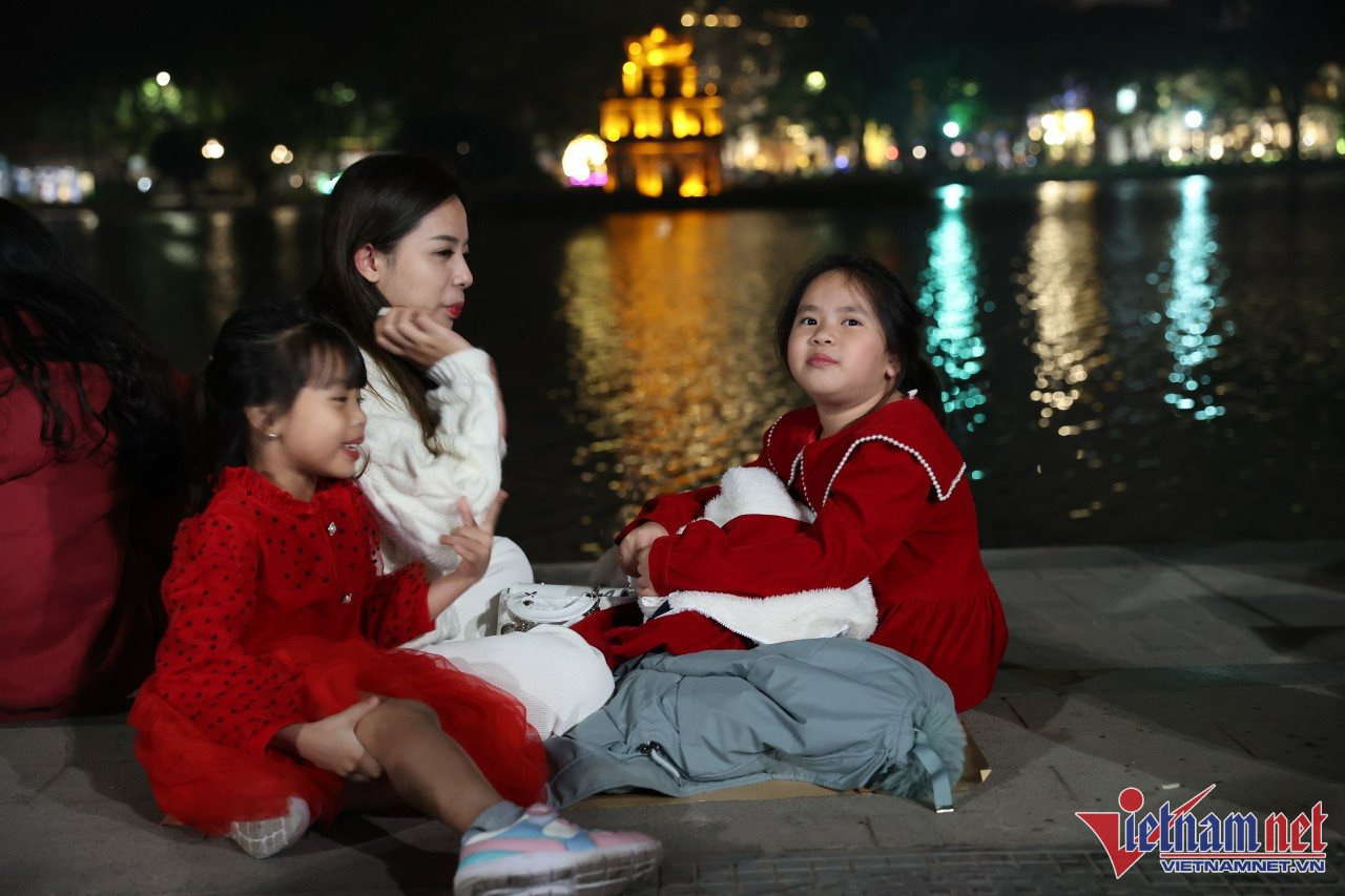 Có mặt tại hồ Gươm từ 7h30, ba mẹ con chị Loan (quận Bắc Từ Liêm) háo hức đón năm mới cùng nhau. “Năm nay mới có thời gian để đưa các con lên đây xem pháo hoa”, chị Loan chia sẻ.