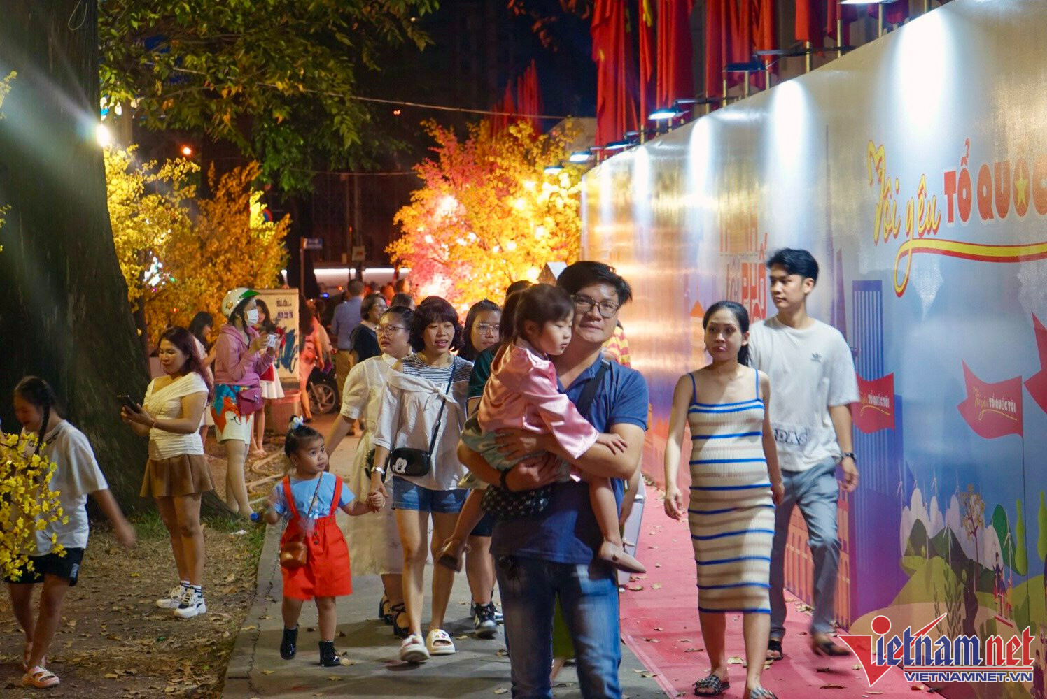 Chỉ còn 2 tiếng nữa là đến giao thừa, nhưng trên tuyến đường Phạm Ngọc Thạch (đoạn qua nhà văn hoá thanh niên, quận 1, TP.HCM) người dân vẫn đang đổ về ngày một đông để chụp ảnh trước những hàng cây mai, đào được trang trí rực rỡ.