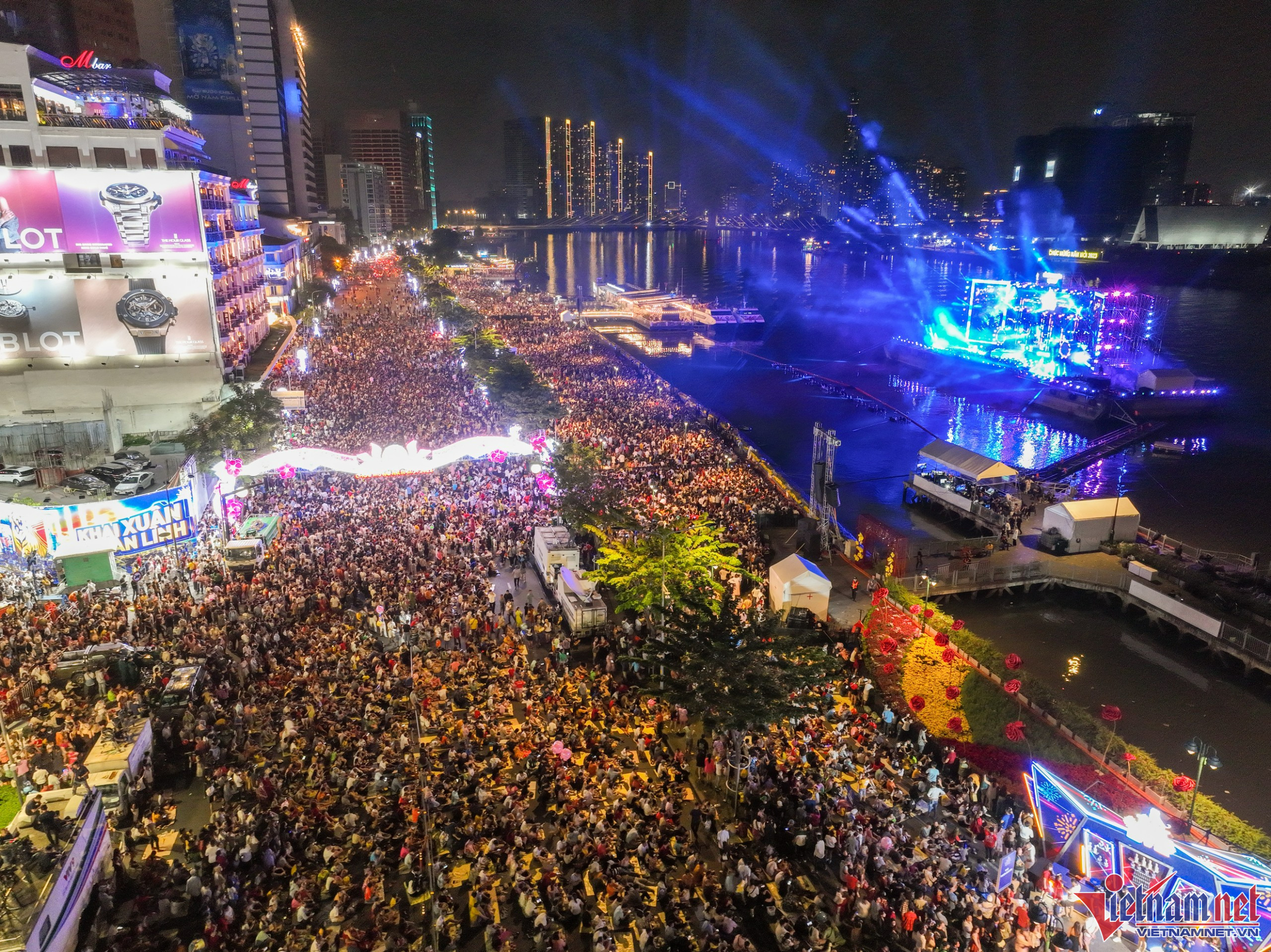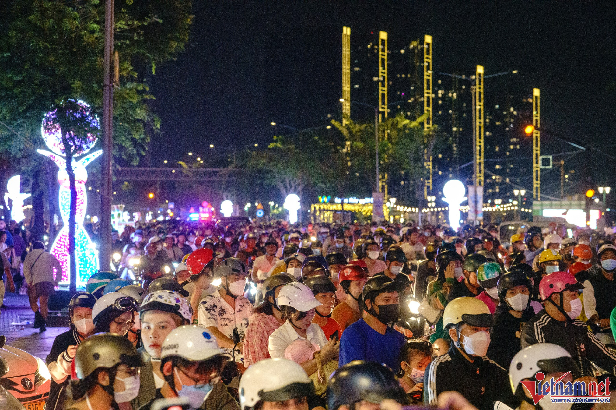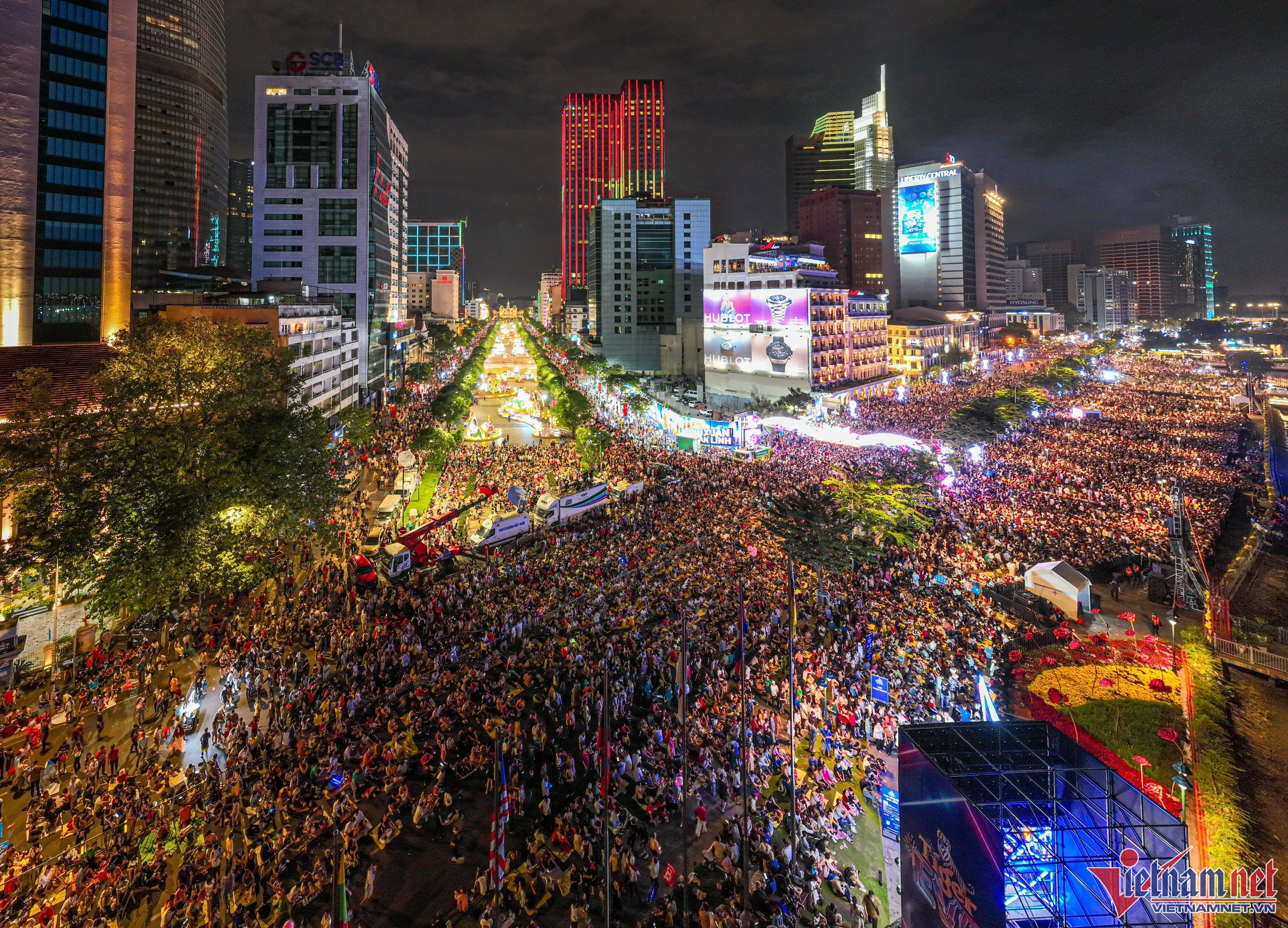 Càng gần đến thời khắc giao thừa, hàng vạn người dân ở TP.HCM đổ về đoạn đường Tôn Đức Thắng (quận 1) càng đông, chờ xem pháo hoa.