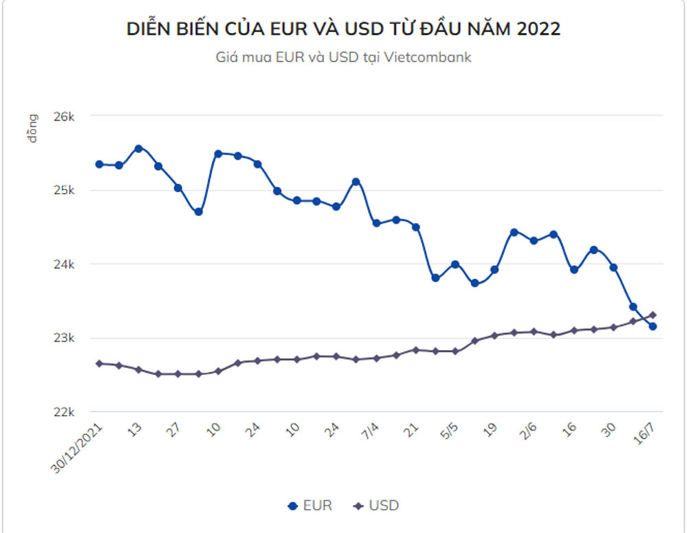 Thực tế, xu hướng giảm giá của euro đã bắt đầu từ cuối năm 2020. Tháng 12/2020, 1 euro vẫn đổi được xấp xỉ 29.000 đồng tiền Việt. Tuy nhiên, giá quy đổi ngoại tệ này đã giảm nhanh chóng xuống mức trên 24.000 đồng/EUR hiện tại. Tính trong giai đoạn 1 năm rưỡi này, tỷ giá quy đổi euro ra tiền Việt đã giảm trên 17%, tương đương mất ròng gần 5.000 đồng/EUR. Nếu tính từ đầu năm 2022 đến nay, tỷ giá ngoại tệ này cũng đã mất xấp xỉ 10%.