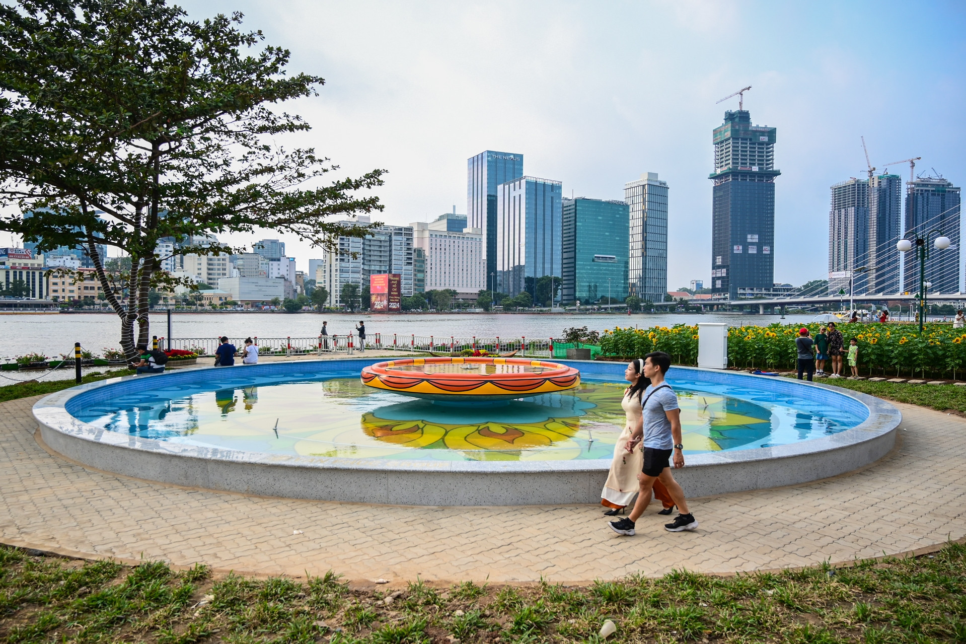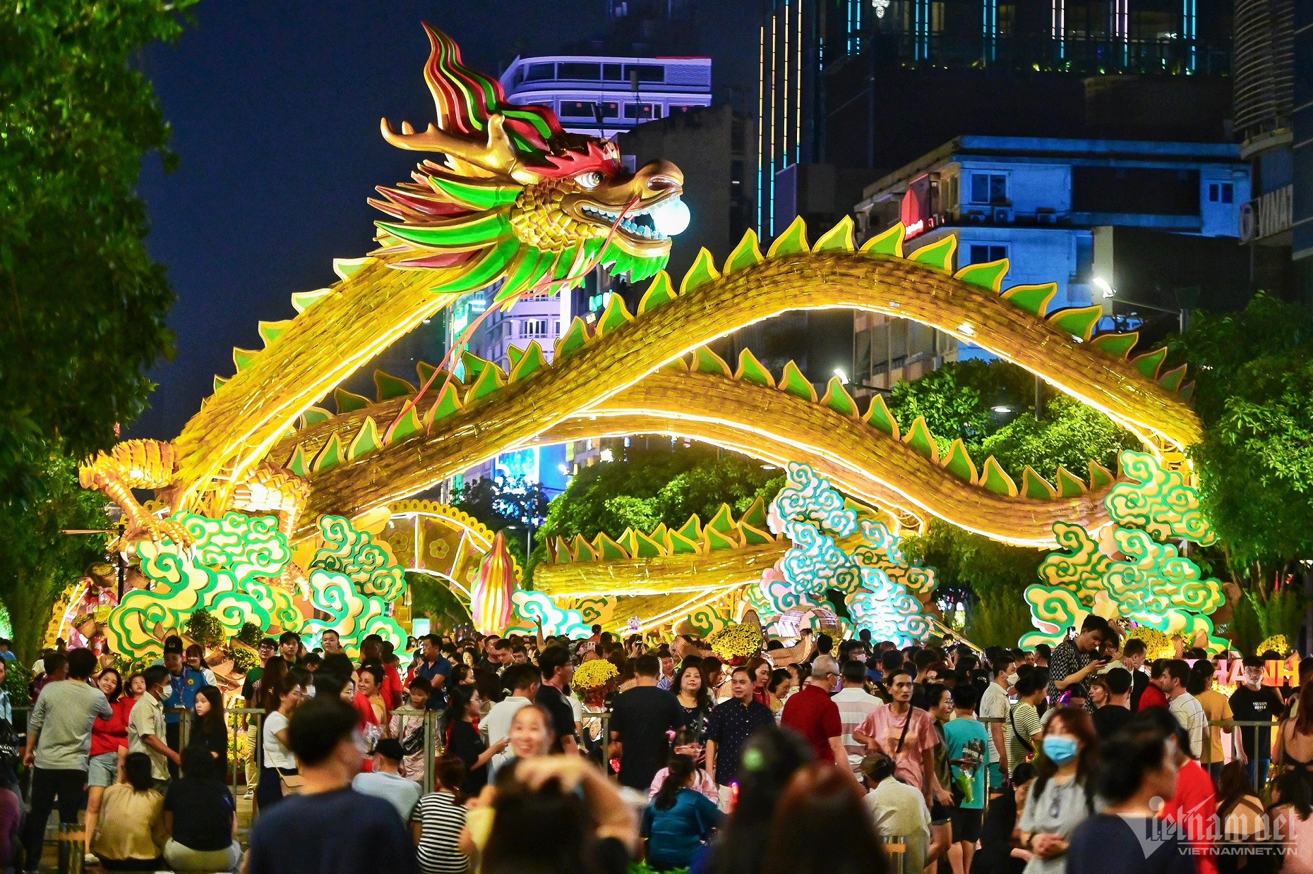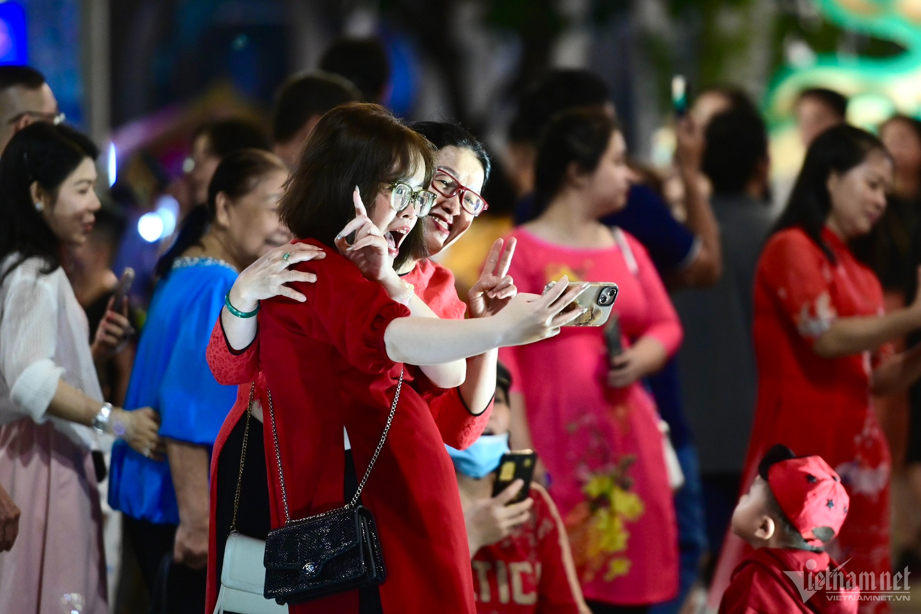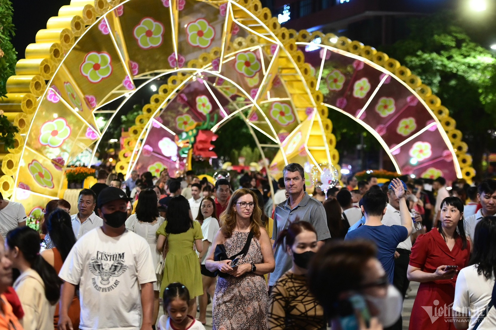 Linh (quận Tân Bình) và bạn đến sớm để vui chơi, tranh thủ lưu lại khoảnh khắc đẹp trước thời khắc chuyển giao năm mới.Du khách nước ngoài thích thú khi tham gia các hoạt động đón chào năm mới tại TP.HCM.Tại công viên bến Bạch Đằng, nhiều người đến sớm để "xí chỗ" đẹp, chờ xem pháo hoa đêm giao thừa. Theo kế hoạch, TP.HCM sẽ bắn pháo hoa giao thừa Tết Nguyên đán 2024 ở 8 điểm trong 15 phút từ 0h đến 0h15 ngày 10/2 (mùng 1 Tết Giáp Thìn). Trong đó, 2 điểm tầng cao tại đầu đường hầm vượt sông Sài Gòn (TP Thủ Đức) và Khu tưởng niệm liệt sĩ Bến Dược (huyện Củ Chi).Càng về khuya càng đông người di chuyển về phố đi bộ để vui chơi, xem pháo hoa.