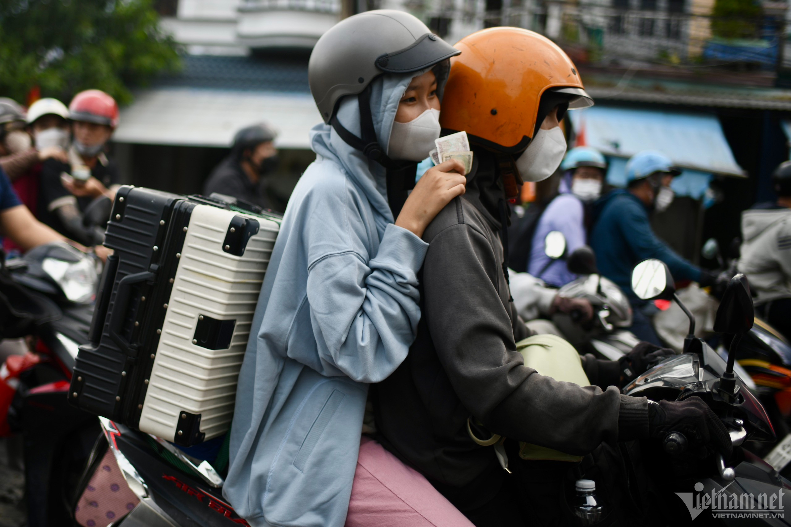 Hình ảnh giao thông qua khu vực phà Cát Lái (hướng Nhơn Trạch về TP.HCM). Nhiều người mang hành lý, quà quê lỉnh khỉnh trên xe máy.