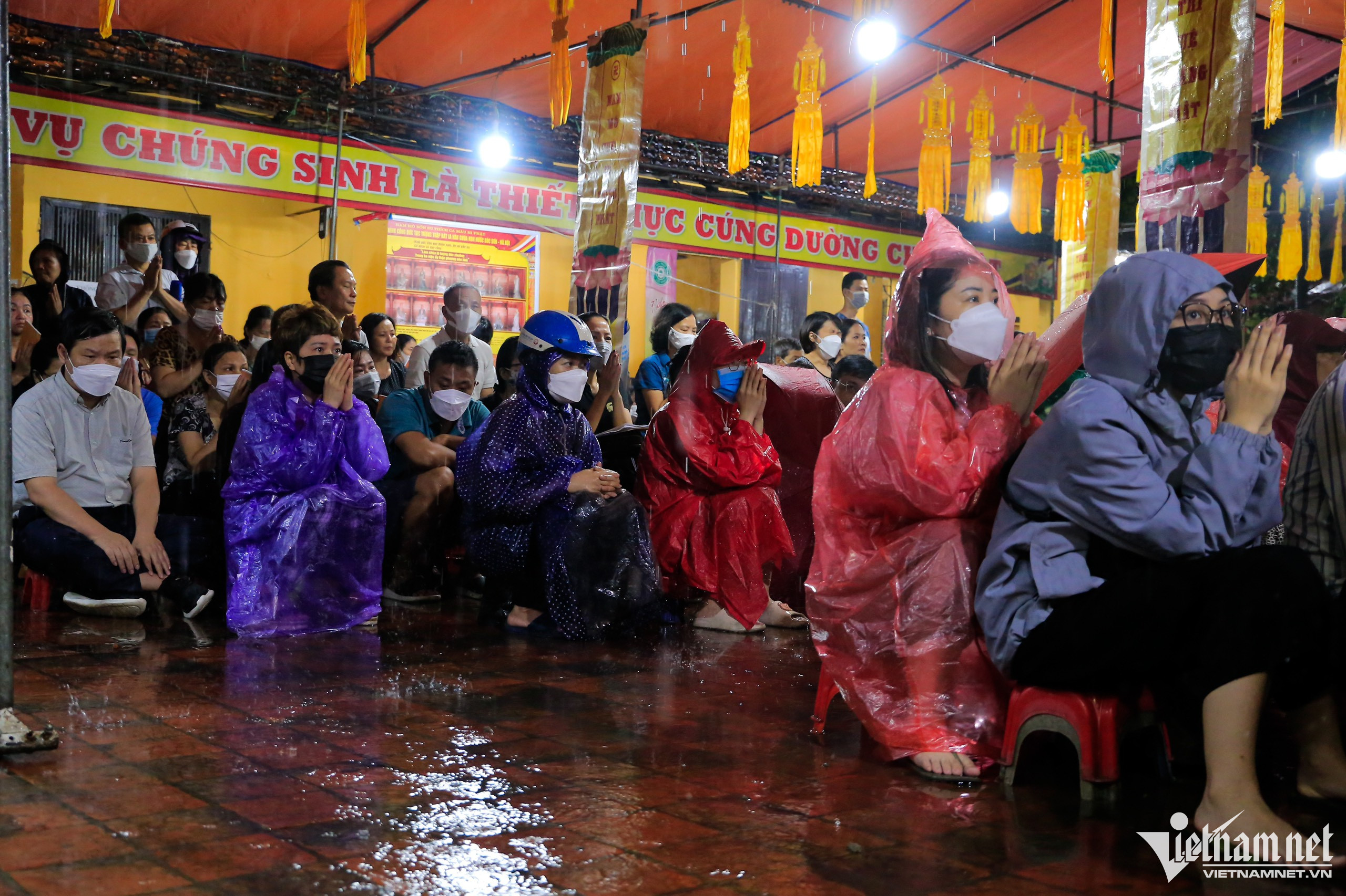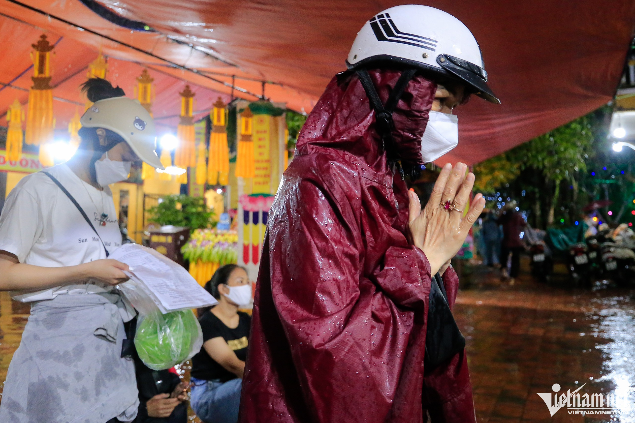 Khoảng trăm người đến chùa Phúc Khánh (Hà Nội) mặc áo mưa ngồi chắp tay hành lễ theo tiếng tụng kinh của sư thầy tối 14/7 Âm lịch.