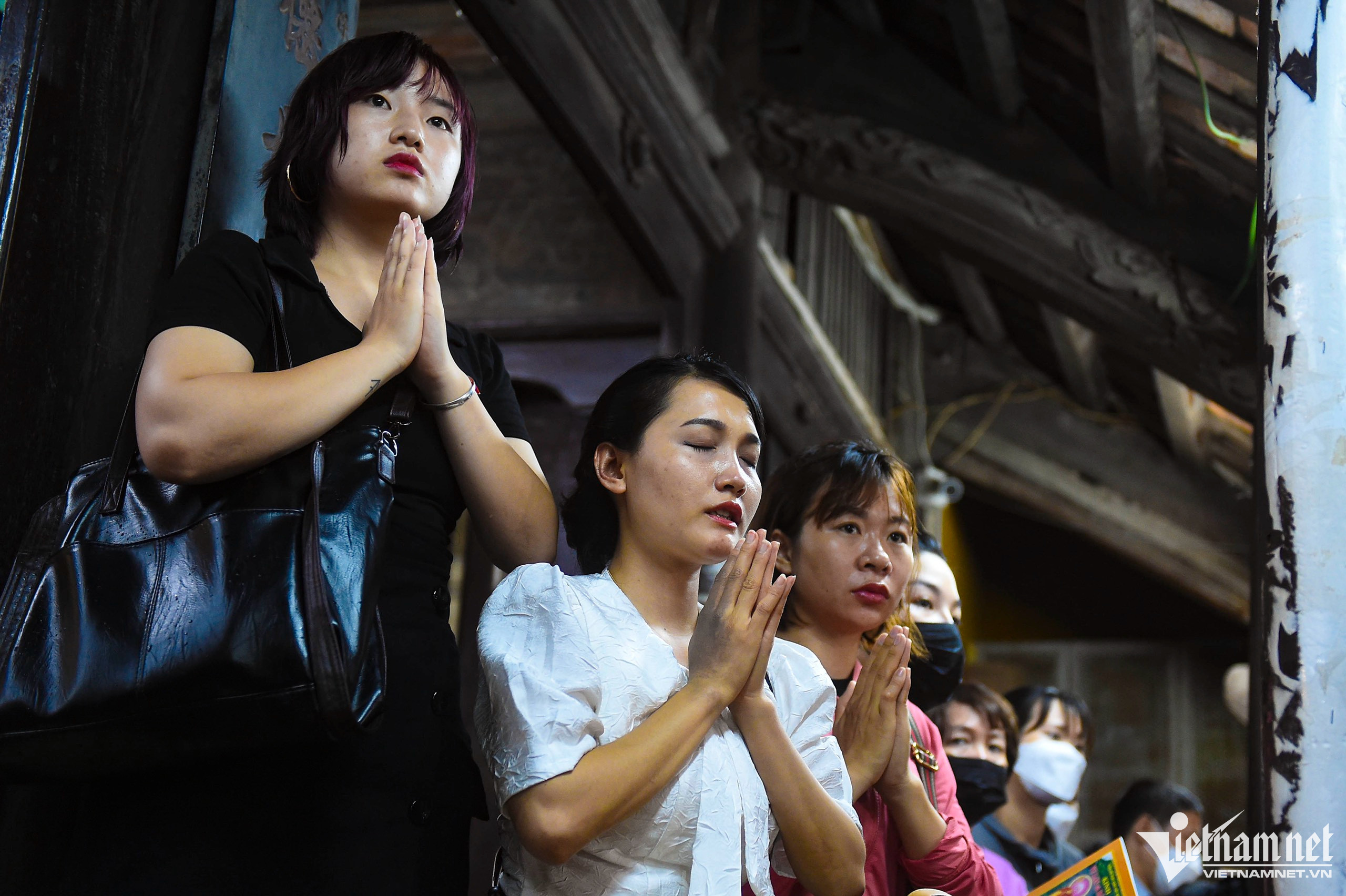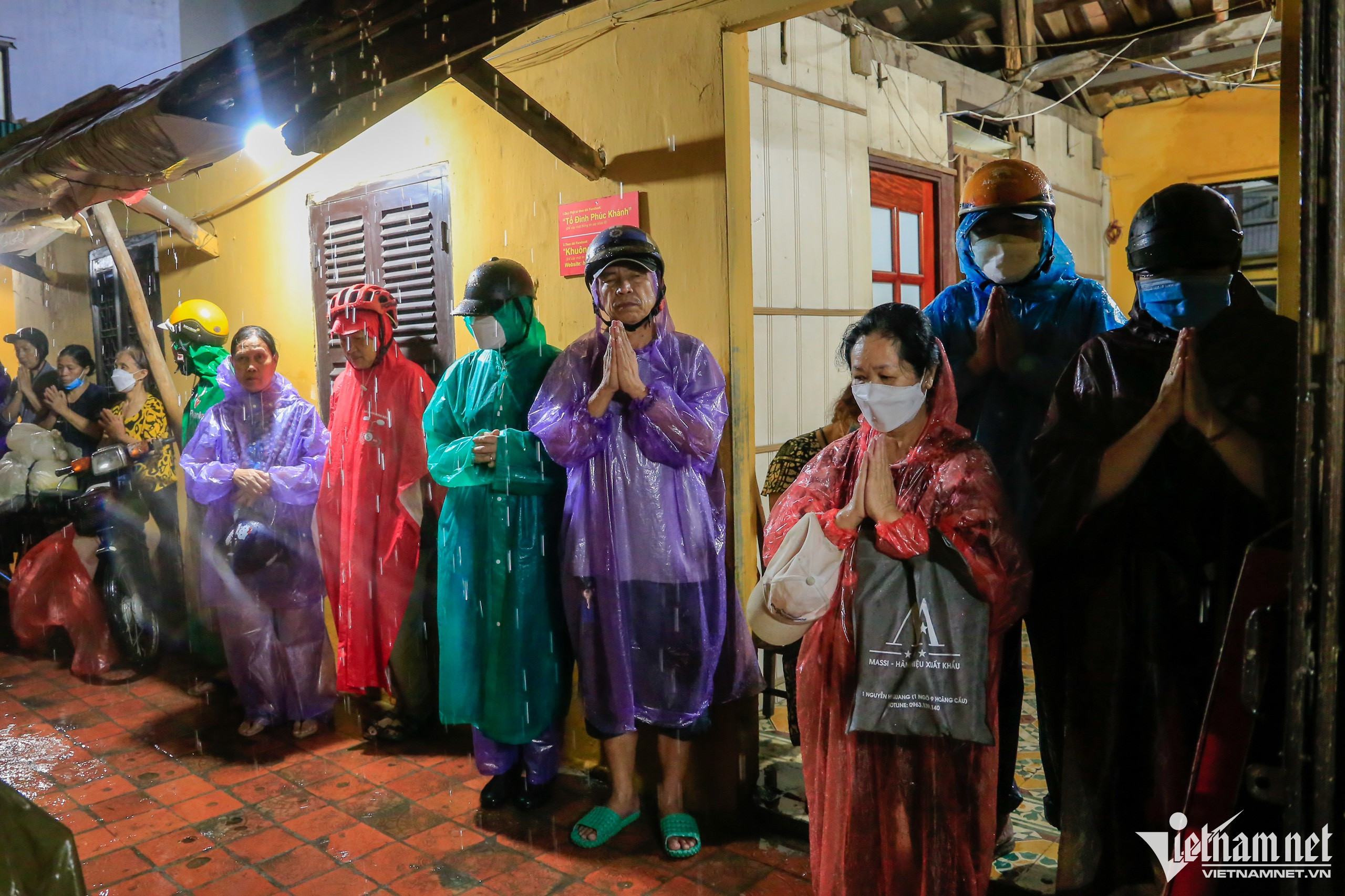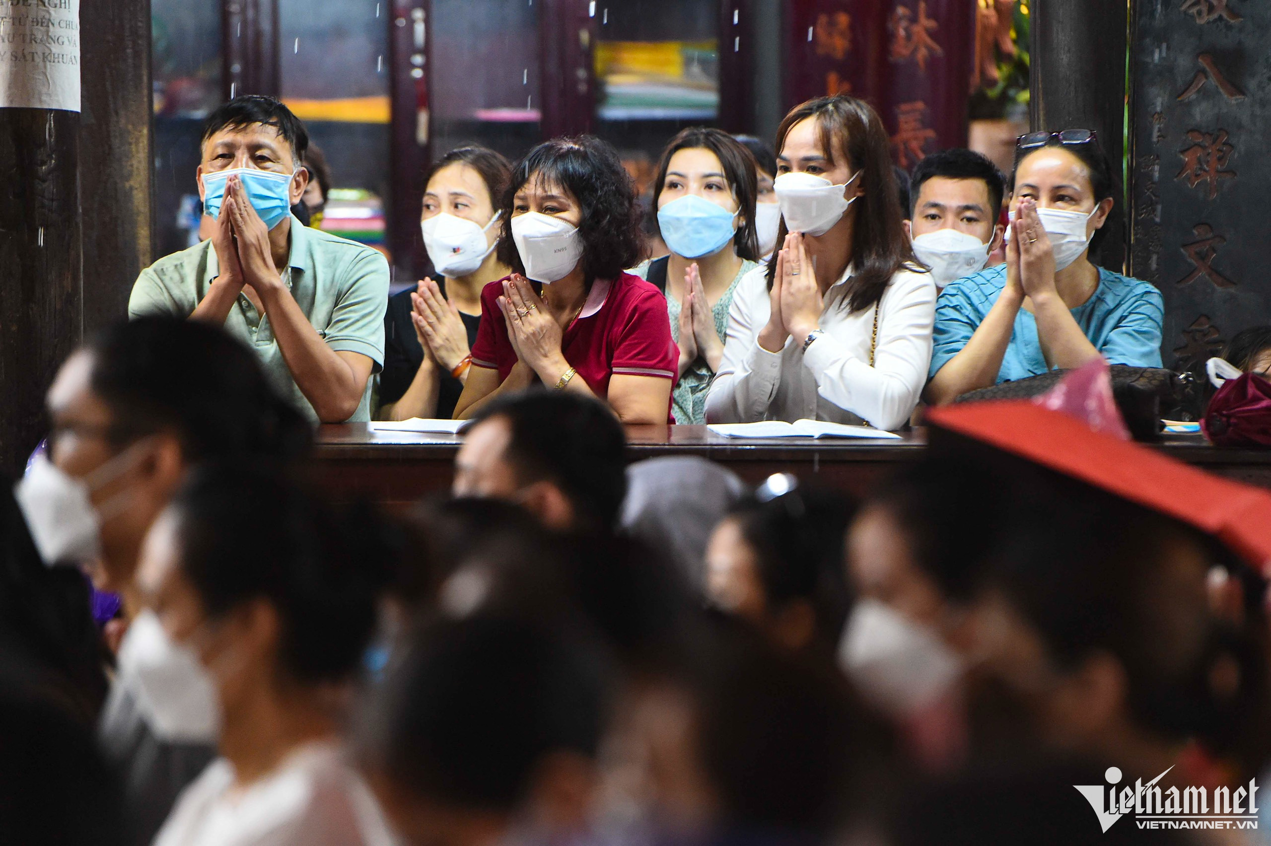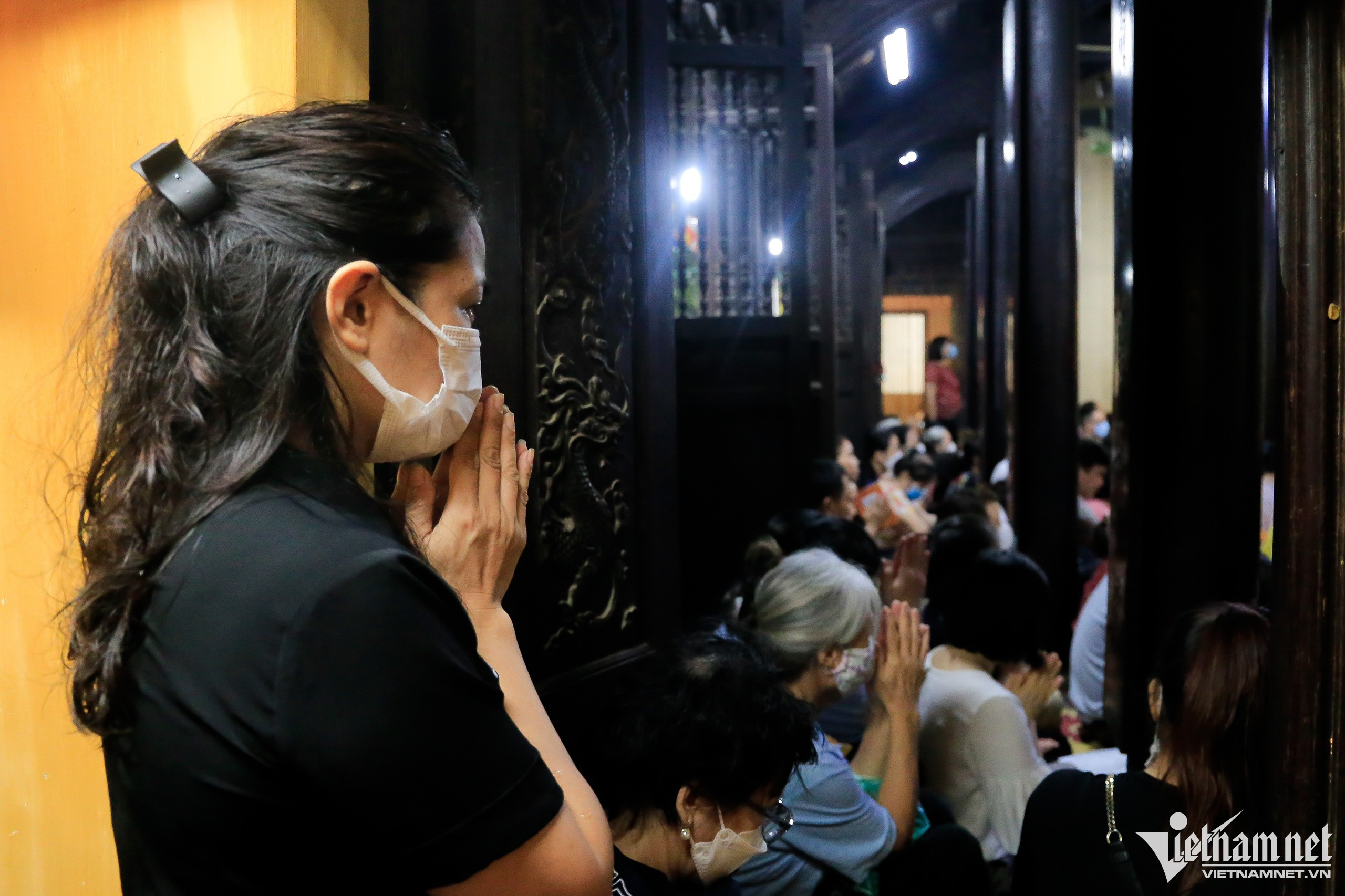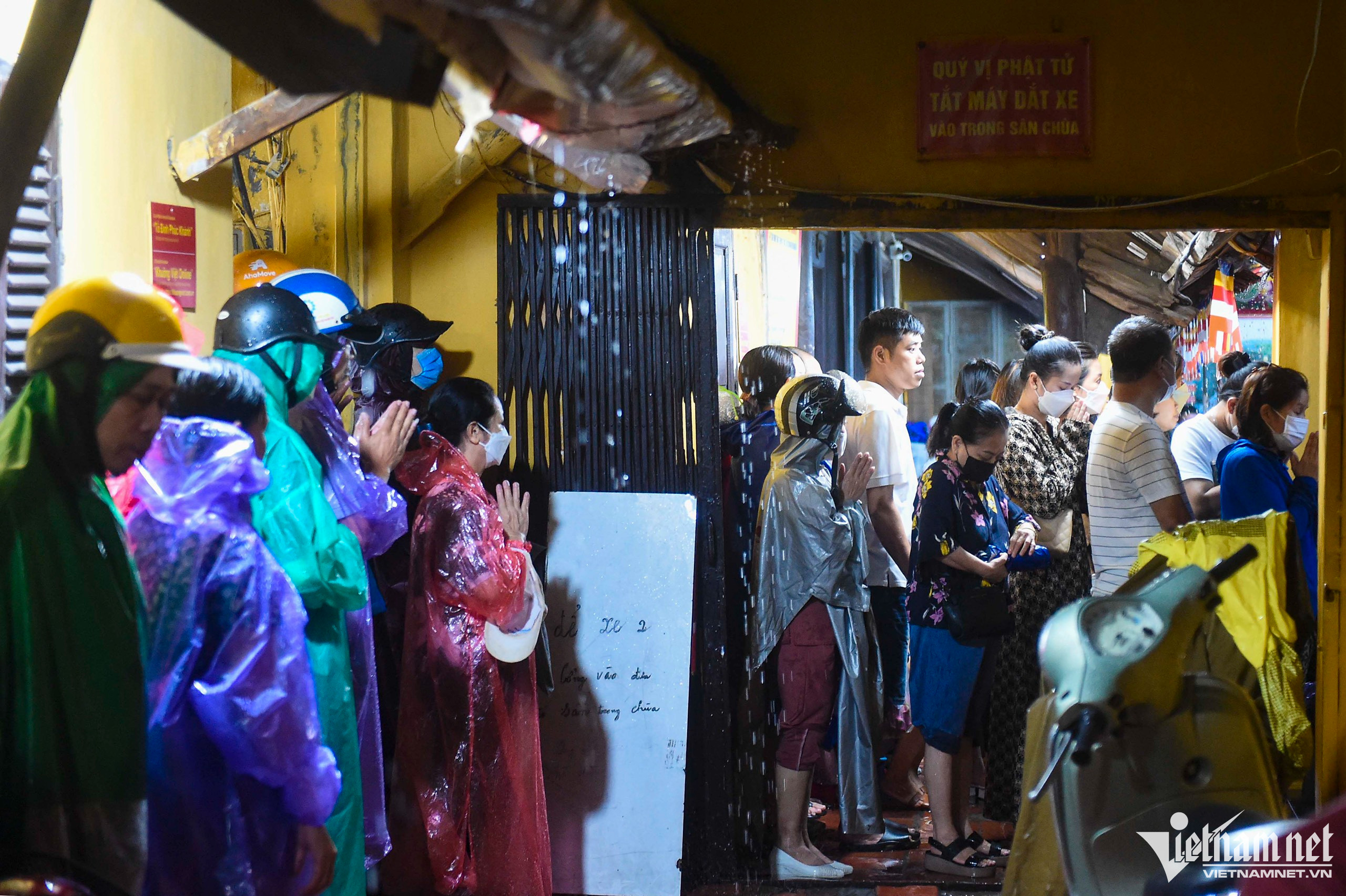 Sau thời gian dài bị gián đoạn bởi dịch Covid-19, các hoạt động tín ngưỡng, tôn giáo hạn chế, dịp rằm tháng 7 năm nay người dân Hà Nội đã được trở lại Tổ đình Phúc Khánh (quận Đống Đa) tham dự đại lễ Vu Lan. Hình ảnh lúc 19h tối 11/8.19h, cơn mưa lớn ập đến ngay sát giờ làm lễ. Tuy vậy, nhiều người vẫn đến chật kín sân chùa. Các khu vực có mái che và trong nhà đều đã hết chỗ ngồi.Ngoài sân nhiều người chen chúc nhau để tránh vị trí bị mưa dột từ phía trên. Ngoài đồ lễ, áo mưa và ô là những vật dụng được mọi người mang vào. Cả buổi tối, Hà Nội vẫn mưa rả rích.Khi đến làm lễ, mỗi người được phát một tấm kinh Vu Lan để đọc nhẩm theo."Tôi đến đây từ 18h, lượng người ngồi phía trong quá đông, tôi phải đứng ngoài để vái vọng", người phụ nữ áo đen chia sẻ.Chị Trần Hằng (quận Hoàng Mai) cho biết cứ vào dịp rằm tháng 7 hàng năm, gia đình đều thu xếp công việc để cùng nhau đến chùa Phúc Khánh cầu an. "Đại lễ Vu Lan là một ngày rất ý nghĩa đối với gia đình tôi, như một sự nhắc nhở mình luôn phải nhớ tới công ơn của đấng sinh thành", chị nói.Nhiều bạn trẻ đến làm lễ từ sớm. “Cầu mong cha mẹ sẽ có cuộc sống khỏe mạnh bình an”, họ cầu nguyện. Một số người đến muộn so với giờ lễ, đứng tạm dưới hiên nhà trong thời gian làm lễ.20h, nhiều người phải vái vọng từ ngoài cửa. Năm nay, chùa Phúc Khánh tổ chức lễ Vu Lan vào 11-12/8 (tức 14-15/7 Âm lịch).