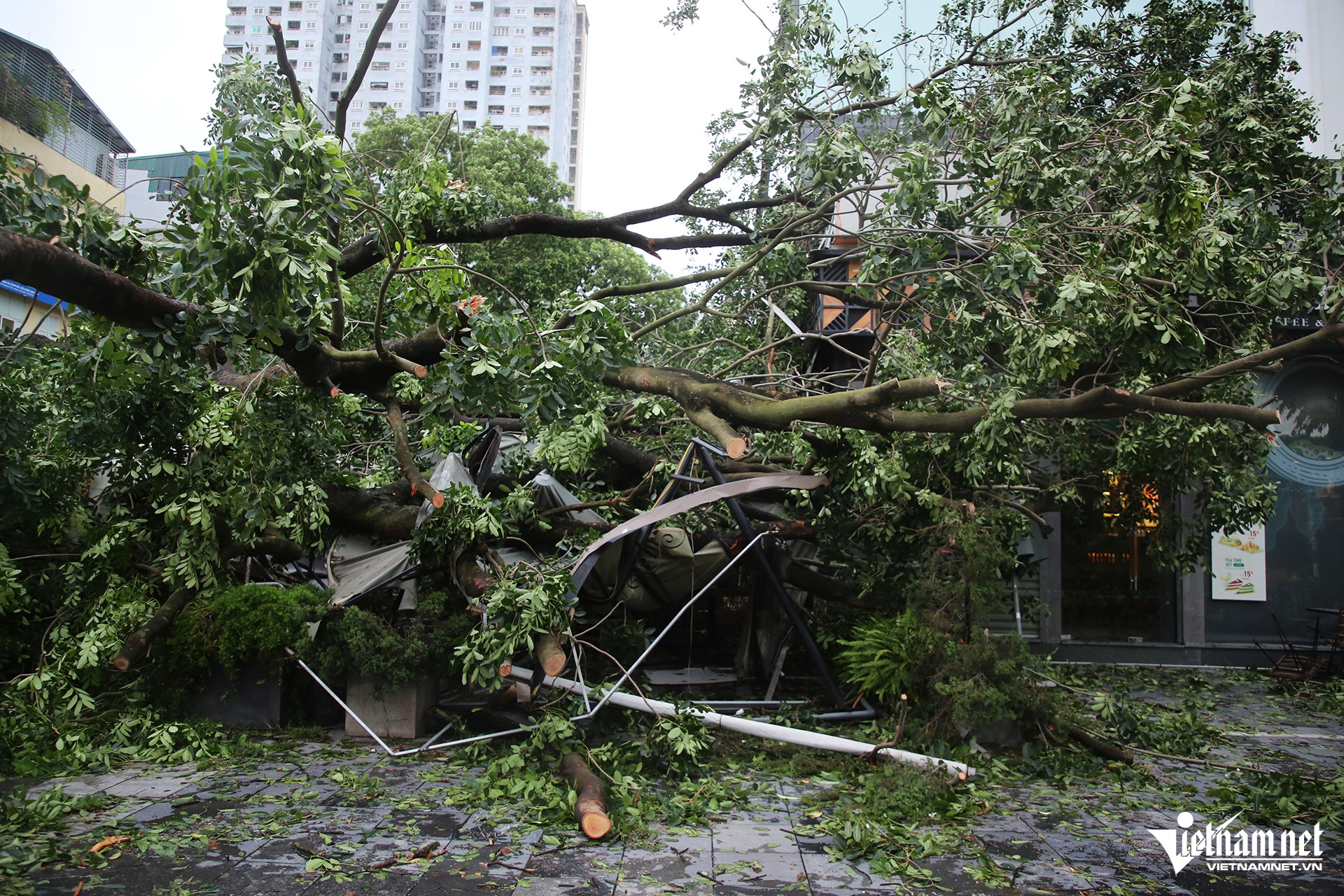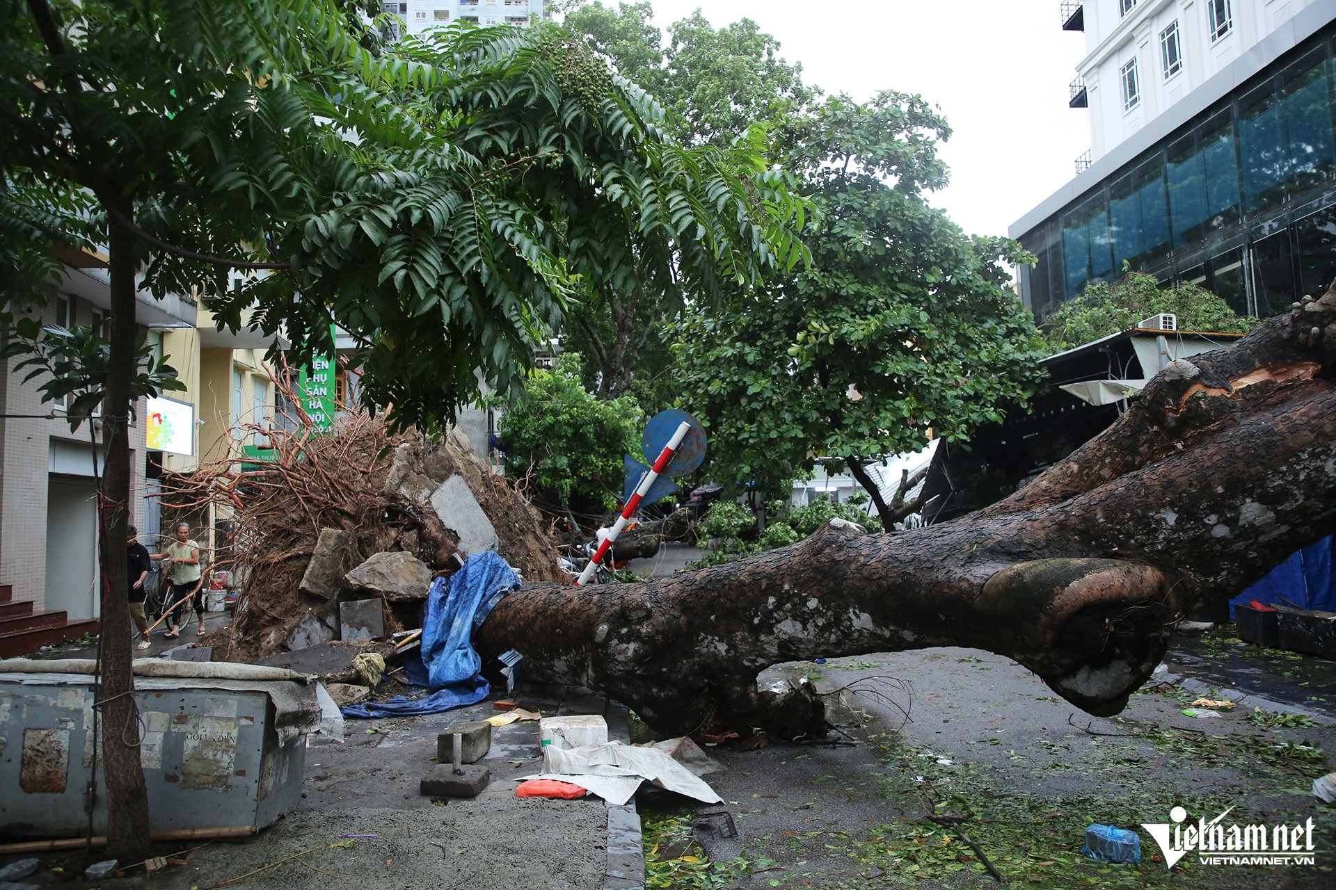 Trên đường Quang Trung (đoạn qua chợ Vồ, quận Hà Đông), có đến 3 cây to bị bật gốc, gãy đổ đè lên mái của các công trình lân cận.