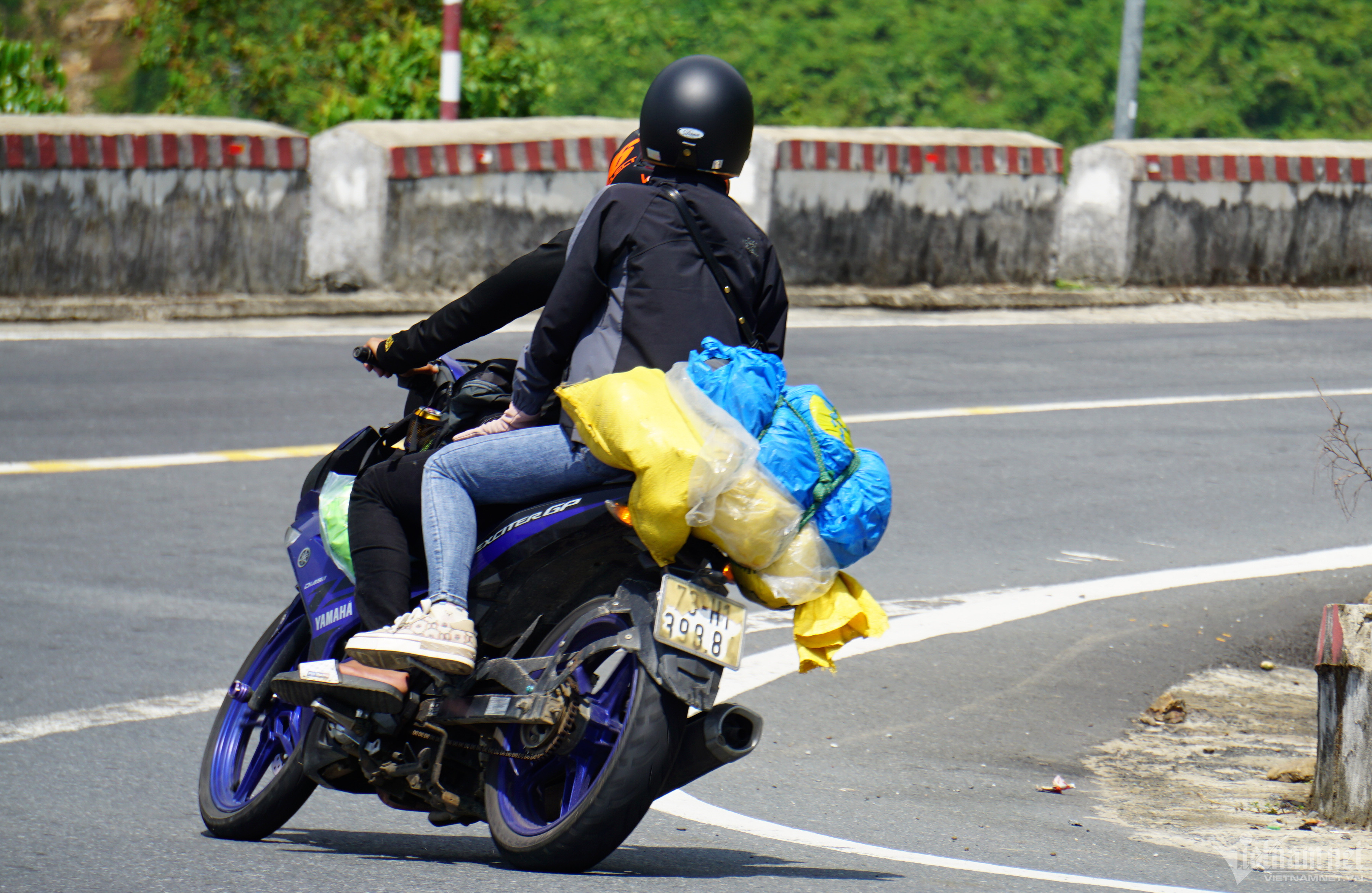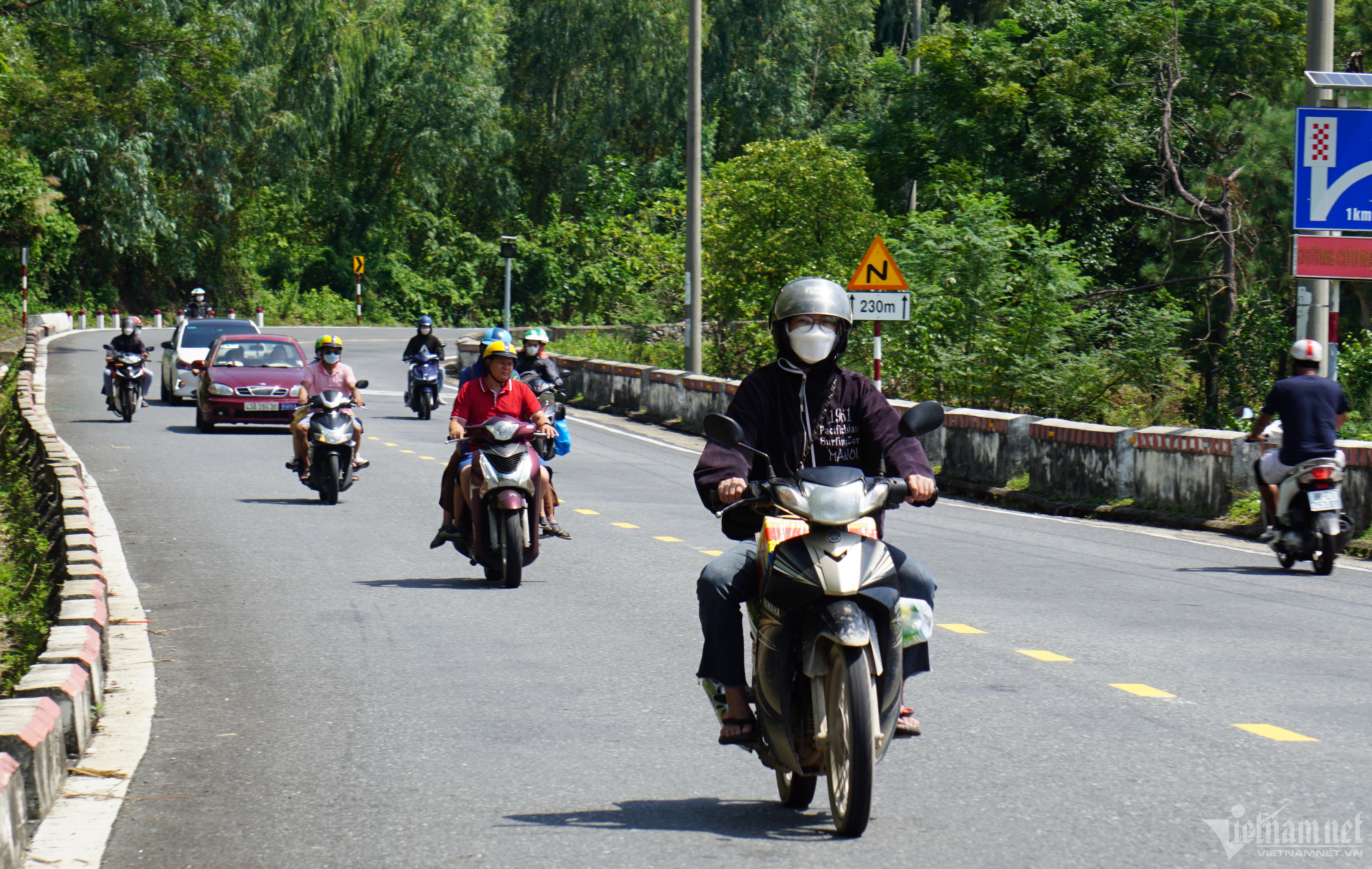Người dân chạy xe máy mang theo đồ đạc di chuyển qua cung đường đèo Hải Vân.Chạy xe chất đầy hành lý, anh Nguyễn Văn Anh (quê Quảng Trị, sinh viên năm 4 Đại học Sư phạm Đà Nẵng) cho biết: “Sáng nay tôi tranh thủ vào lại Đà Nẵng sớm để nghỉ ngơi, mai đi học lại. Tôi và một số người bạn chạy xe máy vượt đèo Hải Vân để tận hưởng không khí mát mẻ và ngắm cảnh”.Hai em nhỏ theo cha mẹ quay lại Đà Nẵng sau những ngày về quê nghỉ lễ.Ở hướng ngược lại, nhiều sinh viên quê Quảng Nam, Quảng Ngãi và Đà Nẵng cũng chọn cách di chuyển trên cung đường đèo Hải Vân để ra tỉnh Thừa Thiên – Huế học tập.Nhiều ô tô cũng chọn cách di chuyển trên đường đèo thay vì đi qua hầm Hải Vân.