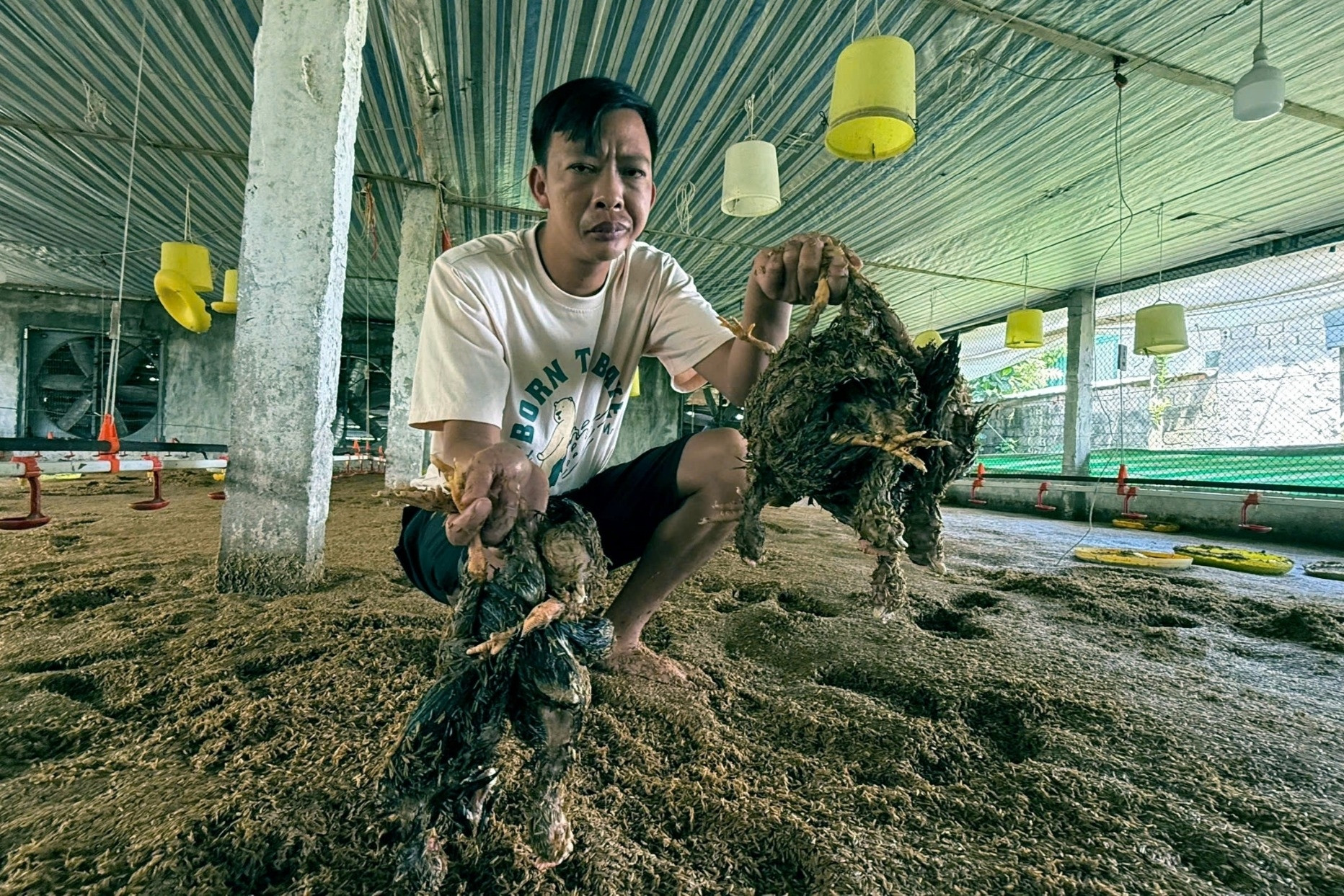 Chỉ vào ba dãy chuồng nuôi gà phía sau, giọng anh nghẹn đắng: “Trong đó còn hàng vạn con, chết từ hôm qua khi bão vào, chưa kịp thu dọn”.