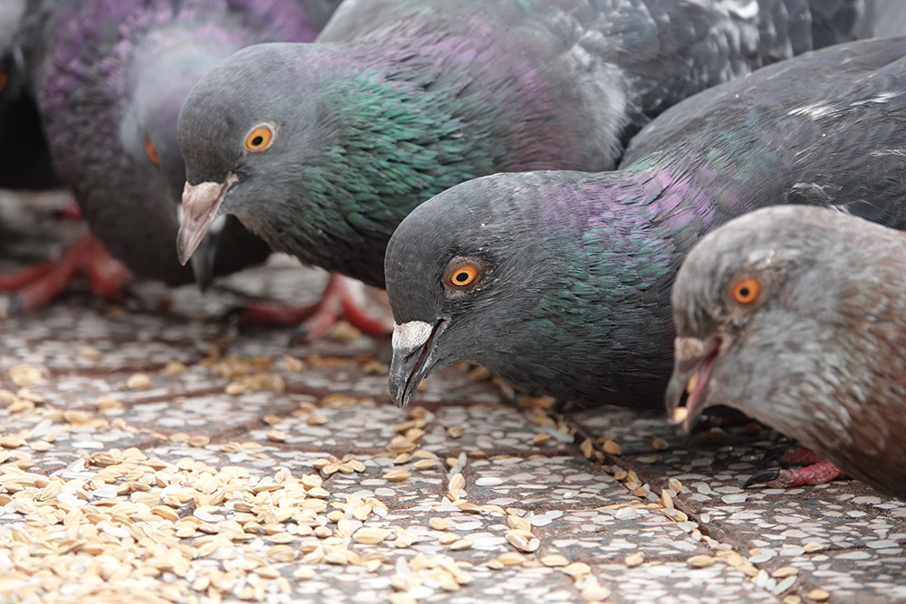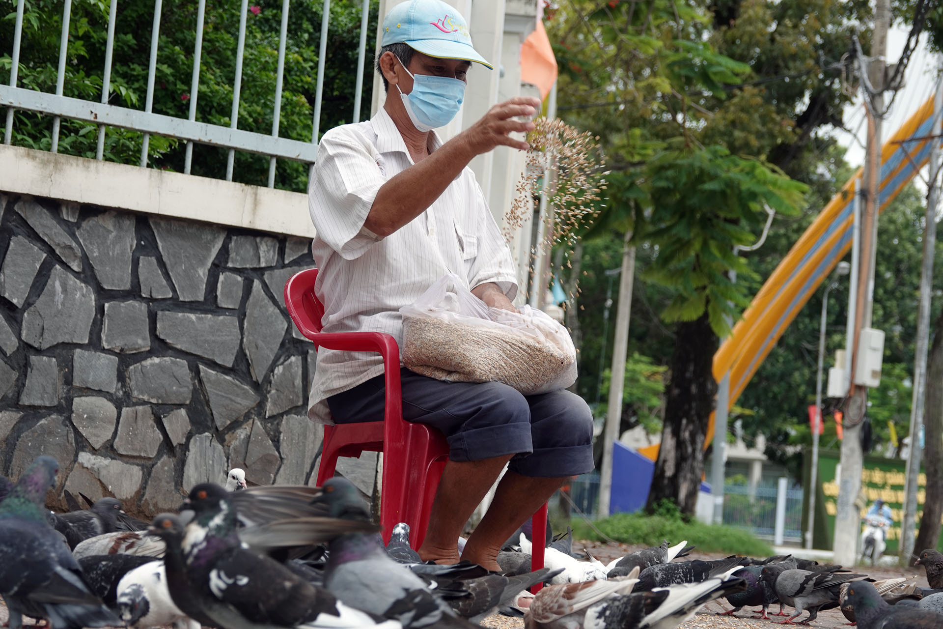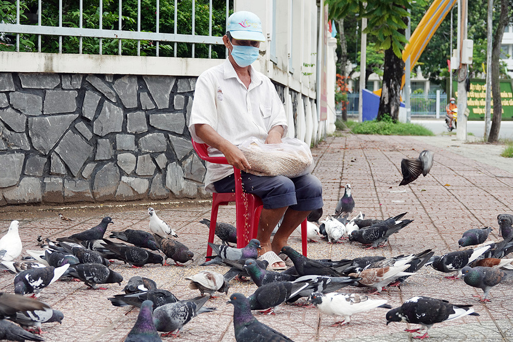 Ông Chương lấy lúa, gạo ra rải. Trên các cành cây, trụ đèn, hàng trăm con bồ câu, chim sẻ sà xuống… mổ từng hạt lúa, gạo, ăn rất tự nhiên, trật tự. Đặc biệt, nhiều con rất dạn, bay đến mổ lúa trên tay ông Chương. Đáp lại người đàn ông này sờ đầu, nhấc vài con chim lên nựng nịu, kiểm tra sức khoẻ.