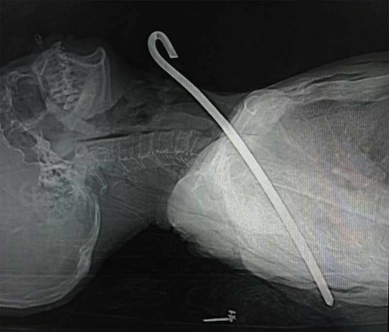 Ông Đ. bị vấp ngã, trúng vào thanh sắt. Ông được người nhà đưa vào bệnh viện cấp cứu trong tình trạng bị thanh sắt dài 30cm xuyên từ vùng cổ qua phổi phải và trung thất xuống vùng ngực bên trái.