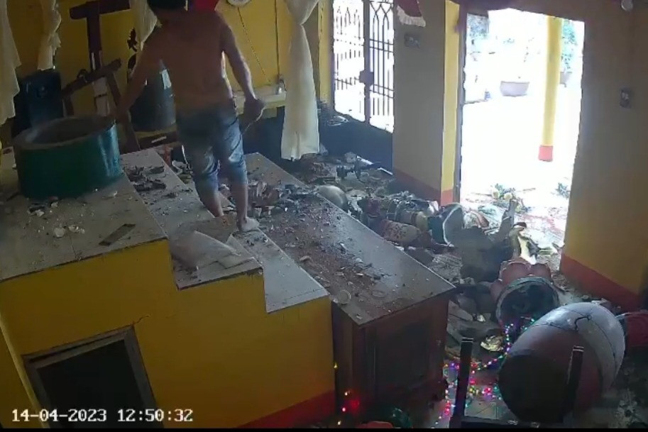 Đối tượng trèo lên trên chính điện ngôi chùa đập phá, ném tất cả các đồ thờ như bát hương, tượng phật, tách, ấm chén, trống xuống nền.