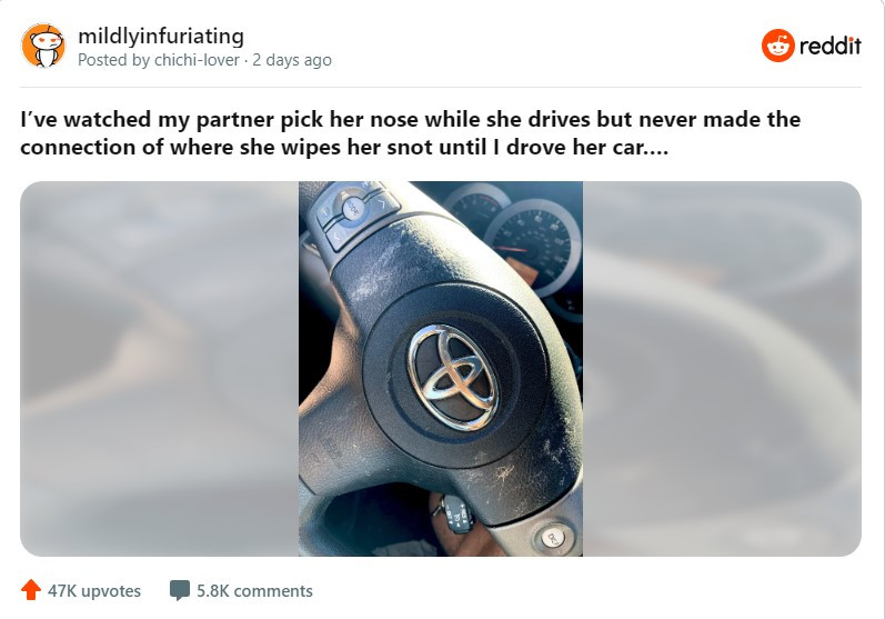 Theo đó, chủ nhân của bài đăng tiết lộ anh phát hiện vợ mình thường xuyên có hành động ngoáy mũi khi đang lái xe. Tuy nhiên, cô lại không sử dụng giấy sau khi ngoáy mũi mà thản nhiên lau vào vô lăng và một số bộ phận khác trên xe. “Tôi không nhận ra điều này cho đến ngày cầm lái chiếc ô tô của cô ấy. Nước mũi dính đầy trên vô lăng và tạo thành những vết bẩn “vón cục” khiến tôi buồn nôn”, anh chồng chia sẻ.
