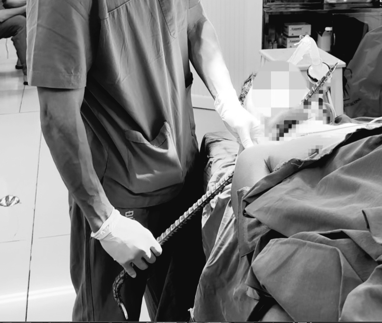 Thạc sĩ Ngô Hải Sơn, khoa Phẫu thuật hàm mặt - Tạo hình - Thẩm mỹ, Bệnh viện Việt Đức, cho biết các bác sĩ đã phối hợp phẫu thuật cấp cứu đa chuyên khoa, bao gồm gây mê hồi sức, tim mạch lồng ngực, phẫu thuật tạo hình hàm mặt, để lấy dị vật vùng cằm cổ.