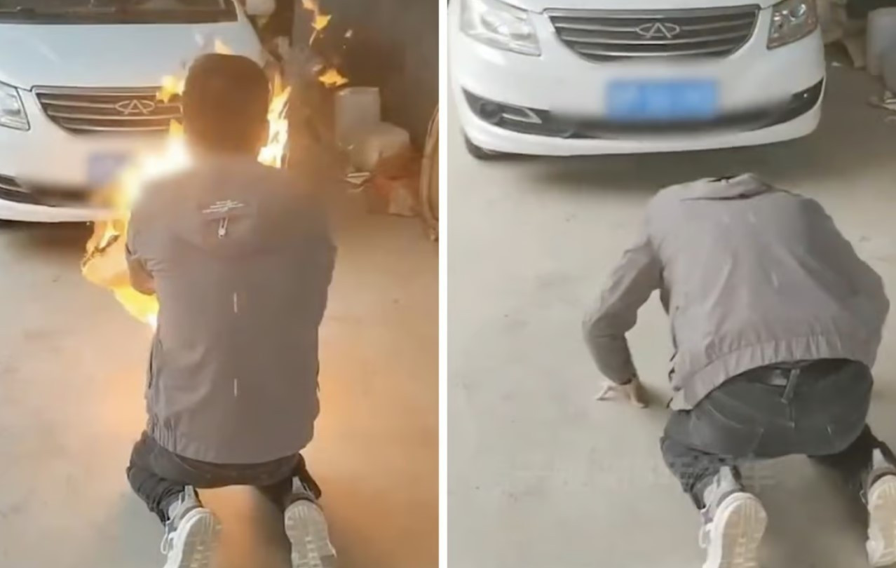 Theo một số hình ảnh được cắt từ video do người vợ thực hiện, anh Wang quỳ gối trước một chiếc ô tô màu trắng. Sau đó, anh đốt một tờ giấy, chắp tay cầu nguyện và cúi đầu trước xe. Trông anh Wang vô cùng kính cẩn trước chiếc ô tô của mình.