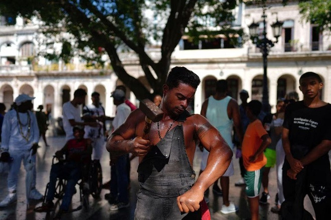 Các tiết mục biểu diễn của người đàn ông gồm chống đẩy trong khi một người khác ngồi trên lưng; dùng búa đánh vào cổ tay, nắm tay, và ống chân. Để chứng minh sự thật, anh Tomasén còn nhờ người khác cầm búa đập vào cơ thể mình.