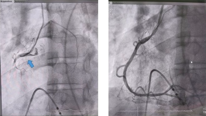 Hình ảnh tắc động mạch vành phải cấp tính gây nhồi máu cơ tim (hình trái) và động mạch vành được tái thông bằng stent. Ảnh: BVCC