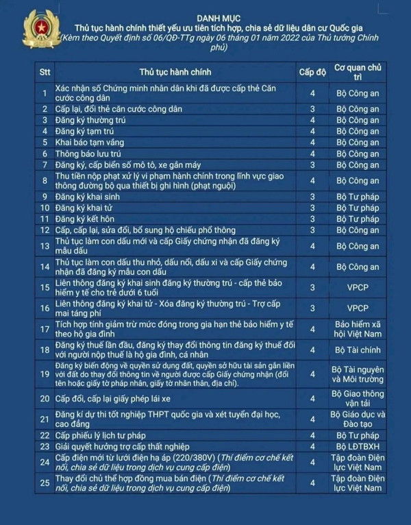 Để thực hiện chuyển đổi số toàn dân, Thủ tướng Chính phủ đã ban hành Quyết định số 06/QĐ-TTg phê duyệt Đề án “Phát triển ứng dụng dữ liệu về dân cư, định danh và xác thực điện tử phục vụ chuyển đổi số quốc gia giai đoạn 2022 - 2025, tầm nhìn đến năm 2030”, trong đó có phê duyệt kèm theo danh mục 25 dịch vụ công thiết yếu.