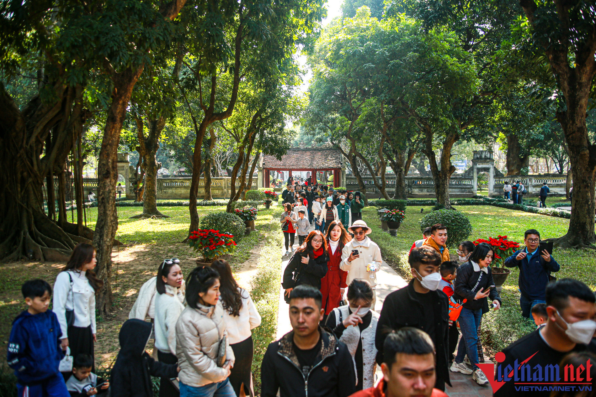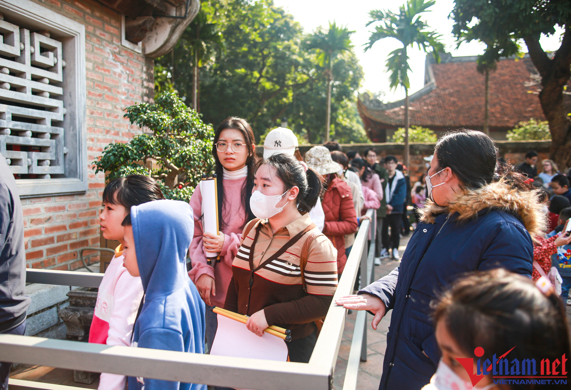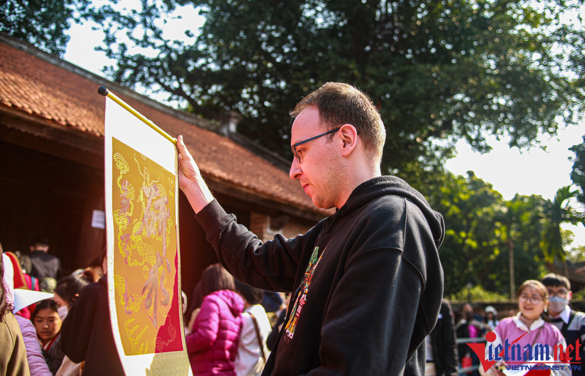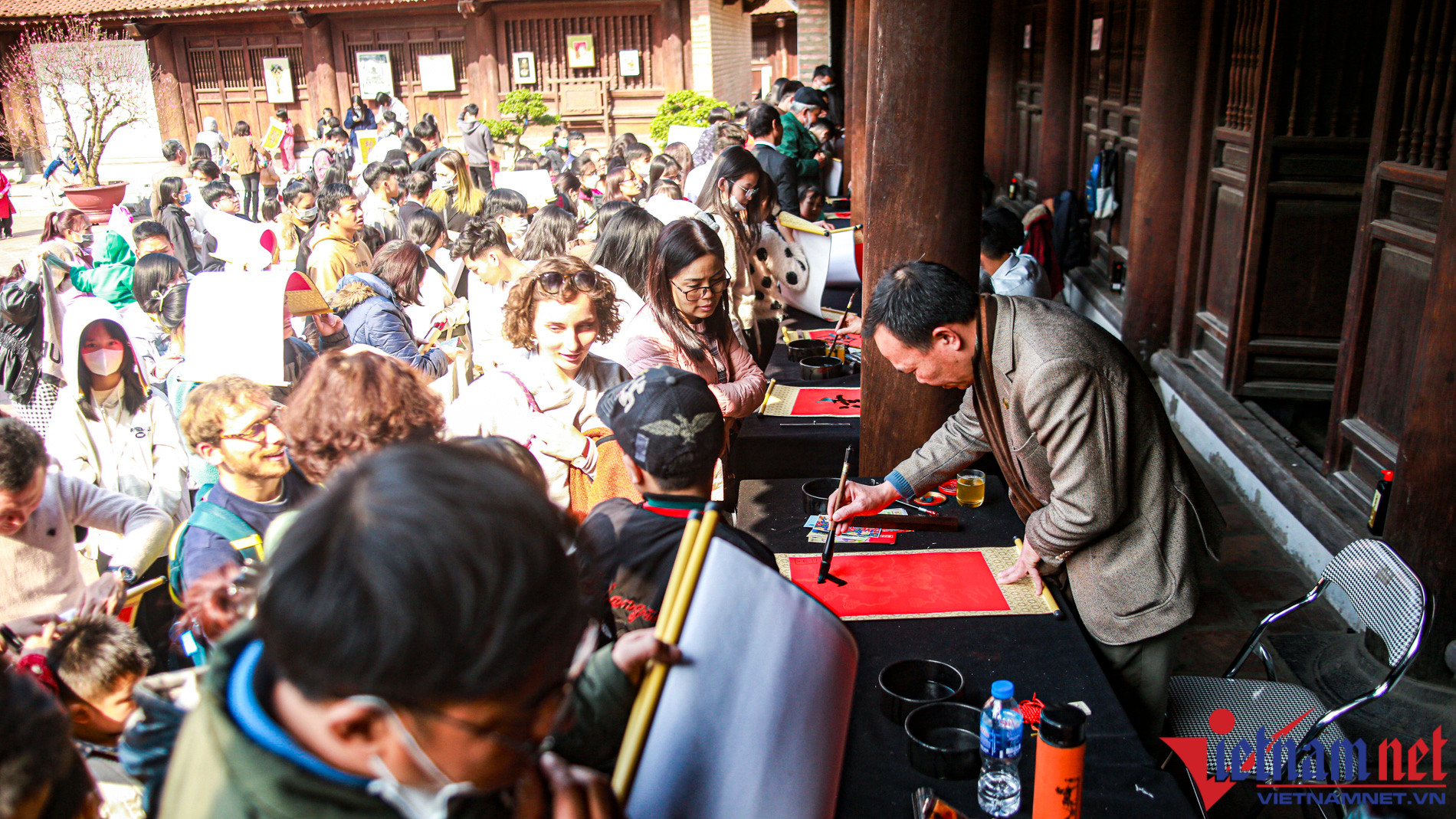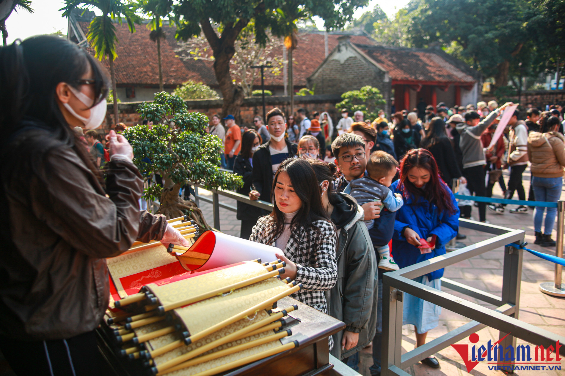 Theo ghi nhận của PV VietNamNet, trưa ngày 29/1 (tức mùng 8 Tết), nhiều gia đình đổ về khu di tích Văn Miếu - Quốc Tử Giám thăm quan và xin chữ thư pháp.Người dân xếp hàng mua vé vào thăm quan di tích.Trẻ nhỏ theo cha mẹ tới Văn Miếu - Quốc Tử Giám.Nhiều gia đình đưa con em đến đây thành kính cầu xin cho một năm học hành thành đạt.Xoa tay vào đôi hạc tại chính điện để cầu may.Tại khu vực viết thư pháp có rất nhiều người tới xin chữ.Ông Nguyễn Văn Nguyên là thầy đồ cho chữ tại Văn Miếu - Quốc Tử Giám nhiều năm nay. Ông cho biết, tại đây có hơn 10 thầy đồ, những ngày đầu xuân, mỗi người viết khoảng 100 tác phẩm/ngày. "Tục lệ xin chữ là một nét đẹp văn hóa của dân tộc ta. Bên trong mỗi chữ vừa ẩn chứa sự linh thiêng, vừa mang đến cho người xem ý nghĩa sâu xa. Việc xin chữ sẽ giúp con người ta hướng về điều tốt", ông Nguyên nói.Hai bạn trẻ Như Phương và Công Thành đã nhiều lần lên đây xin chữ, cho biết: "Năm nay chúng em thi đại học nên muốn lên xin chữ "Đạt" với mong muốn sẽ đỗ vào trường mình chọn. Em chỉ phải xếp hàng chờ khoảng 30 phút là đến lượt mình".Đến khoảng 14h30, rất đông người đứng xếp hàng chờ mua phôi giấy để xin chữ.Mỗi phôi giấy được bán với giá 120 nghìn đồng.Du khách nước ngoài ngắm nhìn tác phẩm thư pháp mới xin được tại khu di tích Văn Miếu - Quốc Tử Giám.Hôm nay là ngày nghỉ Tết cuối cùng nên nhiều em học sinh tới Văn Miếu - Quốc Tử Giám chụp ảnh, du xuân.