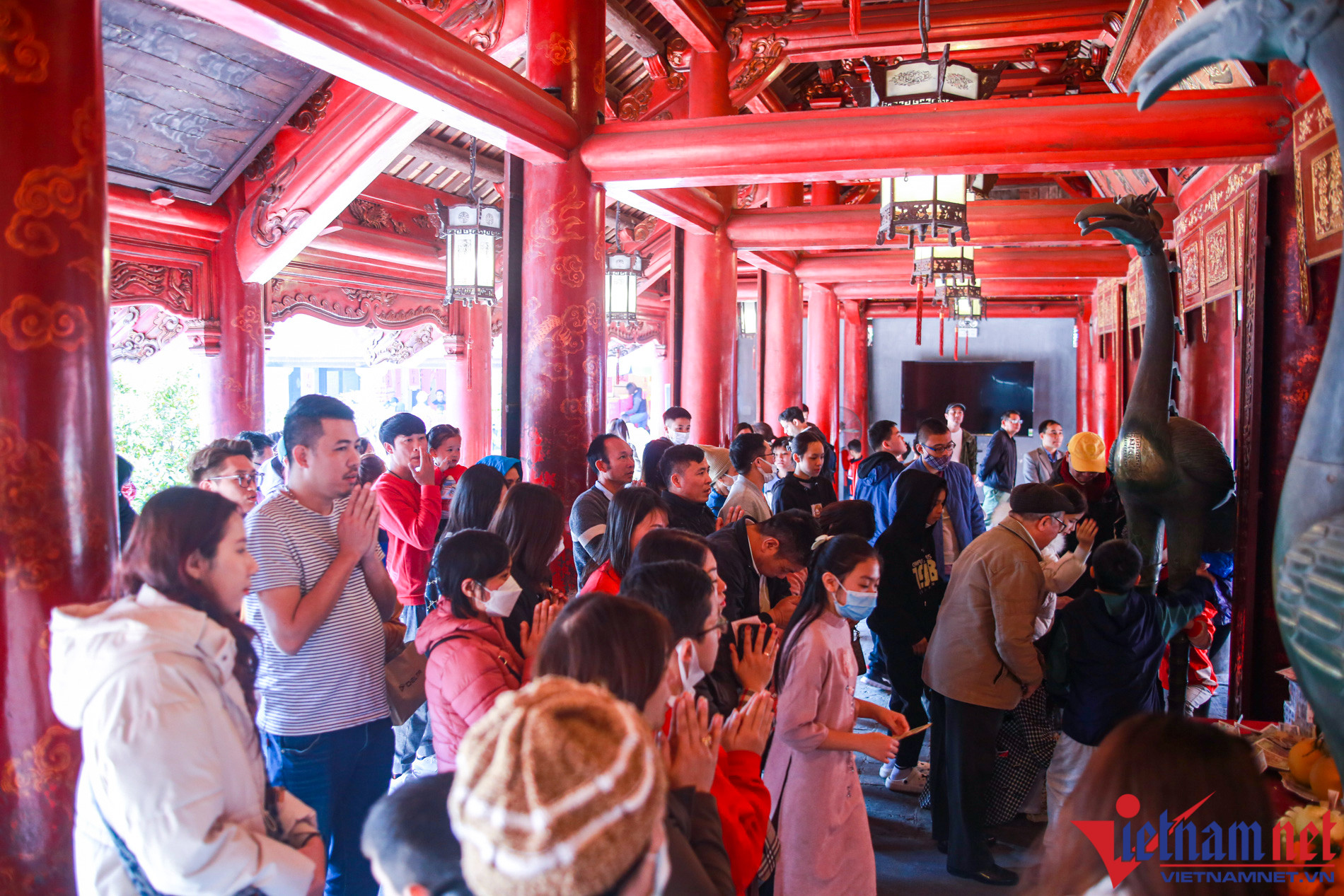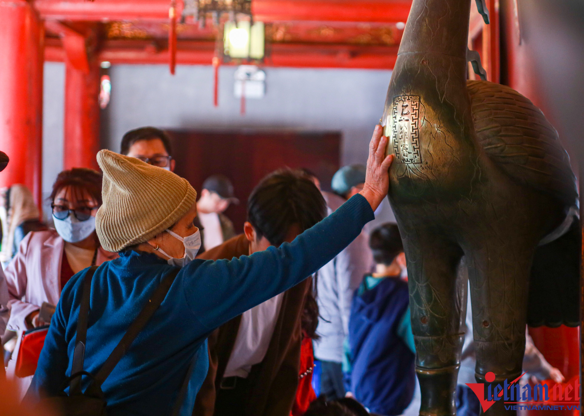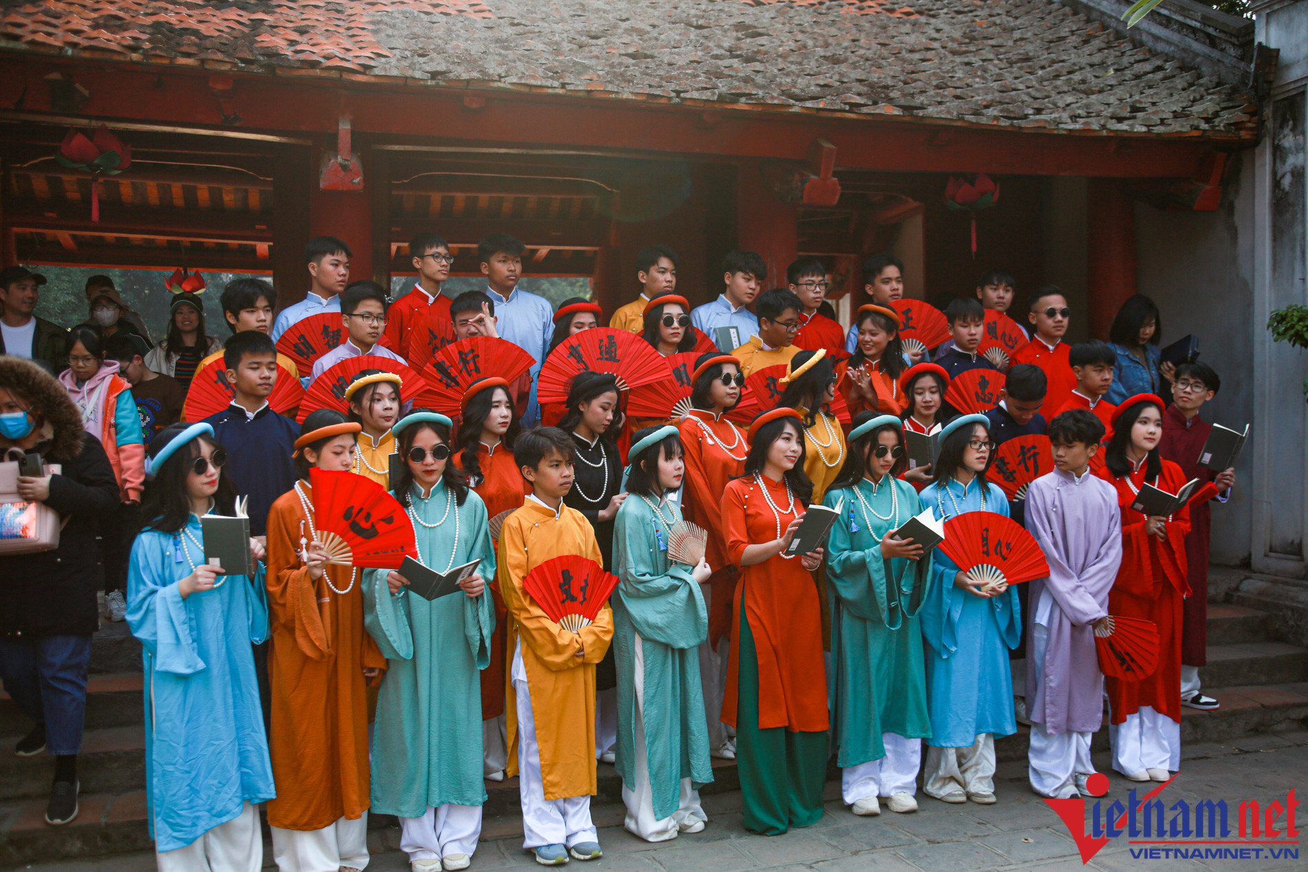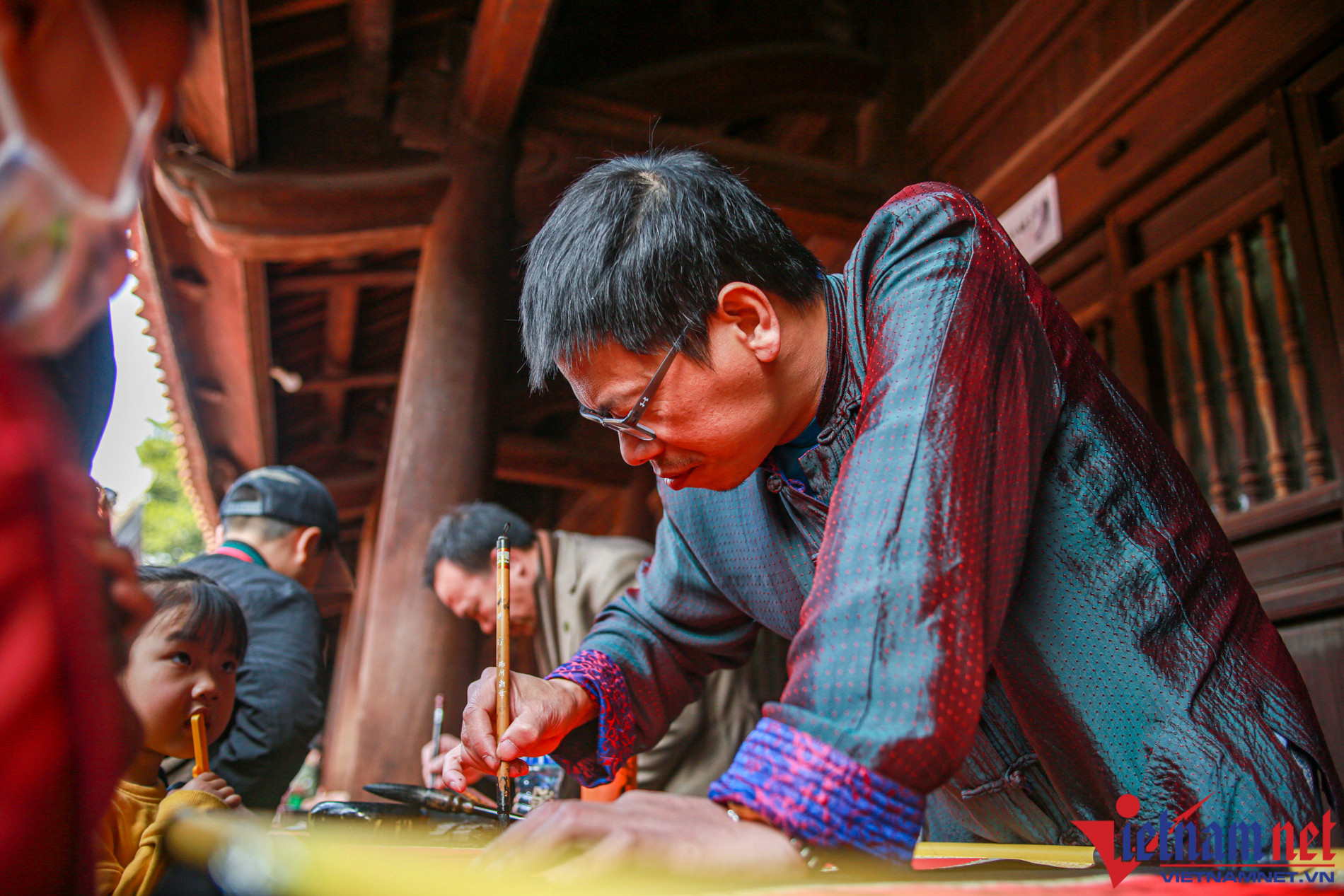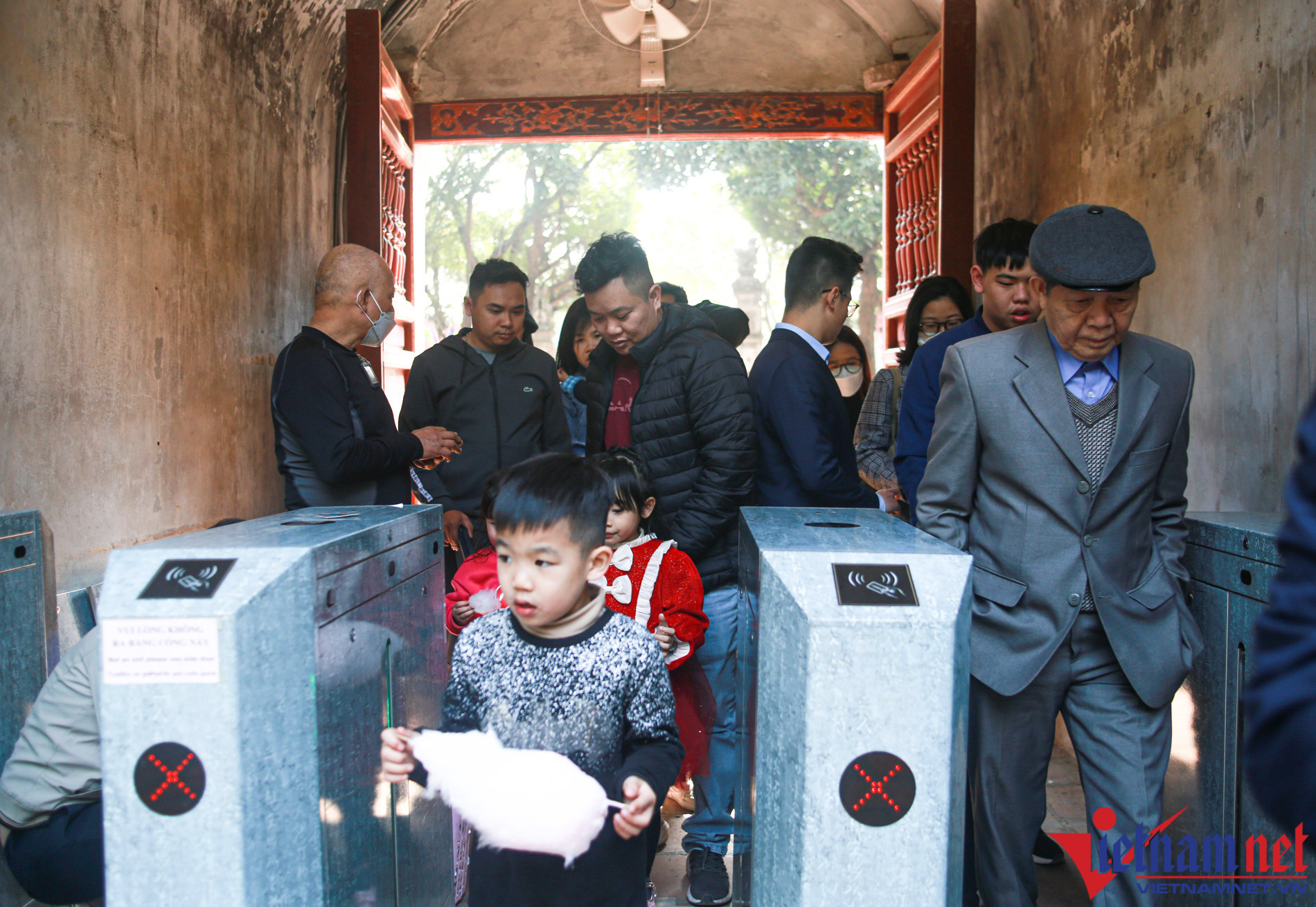 Theo ghi nhận của PV VietNamNet, trưa ngày 29/1 (tức mùng 8 Tết), nhiều gia đình đổ về khu di tích Văn Miếu - Quốc Tử Giám thăm quan và xin chữ thư pháp.Người dân xếp hàng mua vé vào thăm quan di tích.Trẻ nhỏ theo cha mẹ tới Văn Miếu - Quốc Tử Giám.Nhiều gia đình đưa con em đến đây thành kính cầu xin cho một năm học hành thành đạt.Xoa tay vào đôi hạc tại chính điện để cầu may.Tại khu vực viết thư pháp có rất nhiều người tới xin chữ.Ông Nguyễn Văn Nguyên là thầy đồ cho chữ tại Văn Miếu - Quốc Tử Giám nhiều năm nay. Ông cho biết, tại đây có hơn 10 thầy đồ, những ngày đầu xuân, mỗi người viết khoảng 100 tác phẩm/ngày. "Tục lệ xin chữ là một nét đẹp văn hóa của dân tộc ta. Bên trong mỗi chữ vừa ẩn chứa sự linh thiêng, vừa mang đến cho người xem ý nghĩa sâu xa. Việc xin chữ sẽ giúp con người ta hướng về điều tốt", ông Nguyên nói.Hai bạn trẻ Như Phương và Công Thành đã nhiều lần lên đây xin chữ, cho biết: "Năm nay chúng em thi đại học nên muốn lên xin chữ "Đạt" với mong muốn sẽ đỗ vào trường mình chọn. Em chỉ phải xếp hàng chờ khoảng 30 phút là đến lượt mình".Đến khoảng 14h30, rất đông người đứng xếp hàng chờ mua phôi giấy để xin chữ.Mỗi phôi giấy được bán với giá 120 nghìn đồng.Du khách nước ngoài ngắm nhìn tác phẩm thư pháp mới xin được tại khu di tích Văn Miếu - Quốc Tử Giám.Hôm nay là ngày nghỉ Tết cuối cùng nên nhiều em học sinh tới Văn Miếu - Quốc Tử Giám chụp ảnh, du xuân.