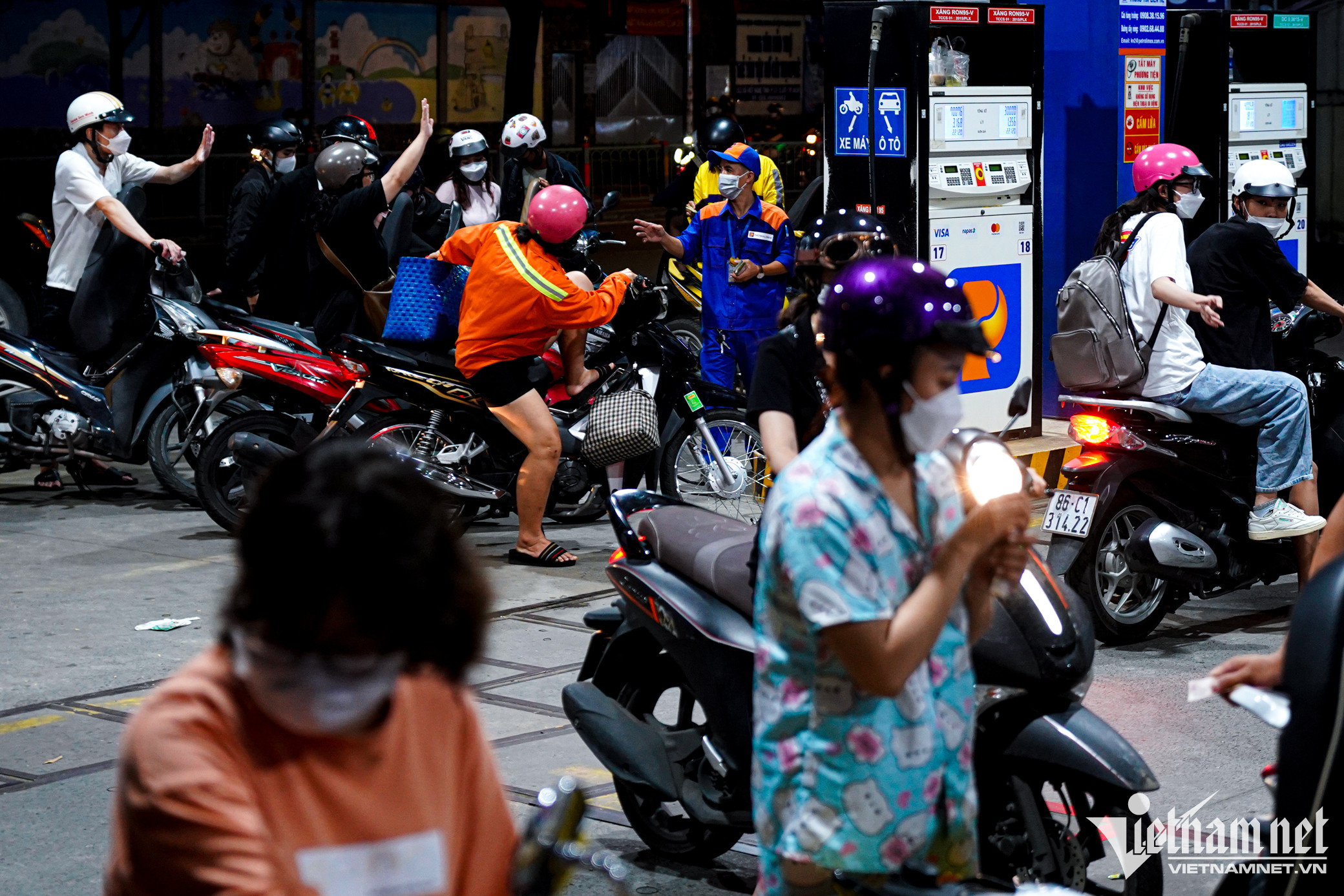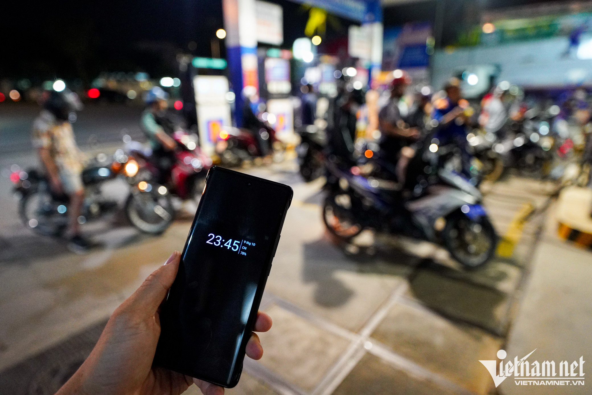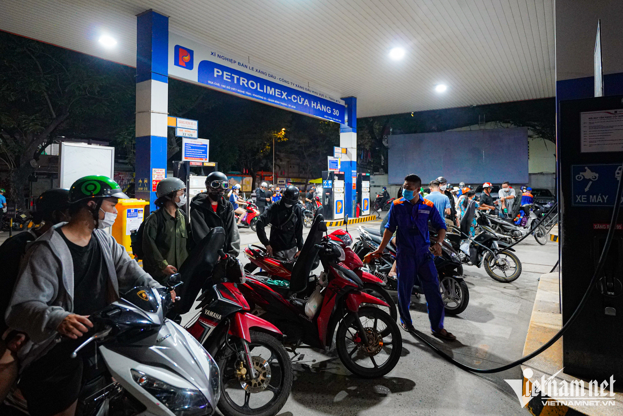 Tại cây xăng trên đường Trần Não (TP. Thủ Đức), xăng RON 95 được niêm yết với giá 22.120 đồng/lít. Khách tăng đột biến khiến lượng xăng bán ra cũng tăng cao.Một nhân viên tại cây xăng này cho biết từ sáng, lượng người đến đổ bắt đầu đông và kéo dài đến tận đêm. "Từ sáng đến tối tổng lượng xăng bán ra có thể đạt hơn 60.000 lít, tăng gấp đôi so với ngày thường", anh nói.Quản lý cửa hàng cho biết nhiều người đặt câu hỏi "ngày mai còn bán xăng không"? Để giải đáp thắc mắc và lo ngại của khách, người này khẳng định sẽ luôn có đủ xăng để bán và kêu gọi người dân không mua xăng trữ, gây mất an toàn và dễ cháy nổ.Đến 22h, lượng khách vẫn không giảm. Họ cho biết đây là lần đầu tiên thấy đông người đổ xăng vào khung giờ này.